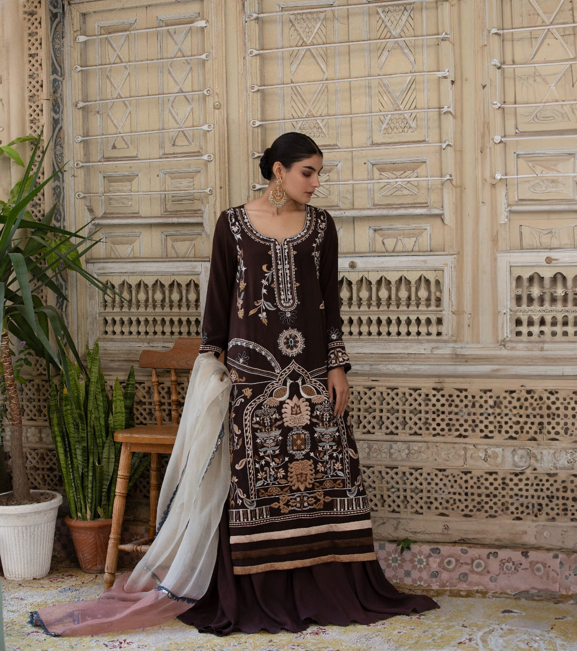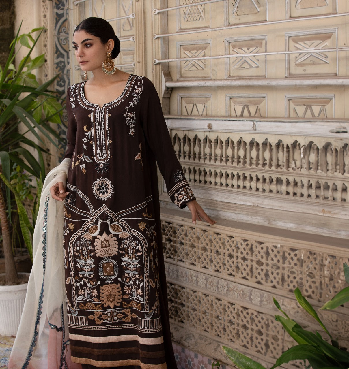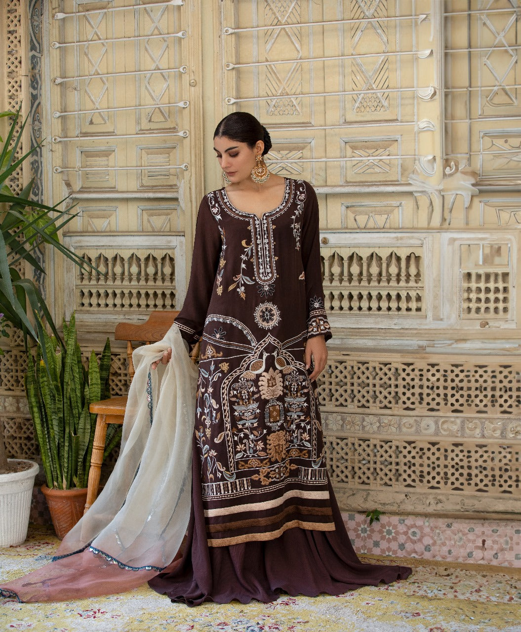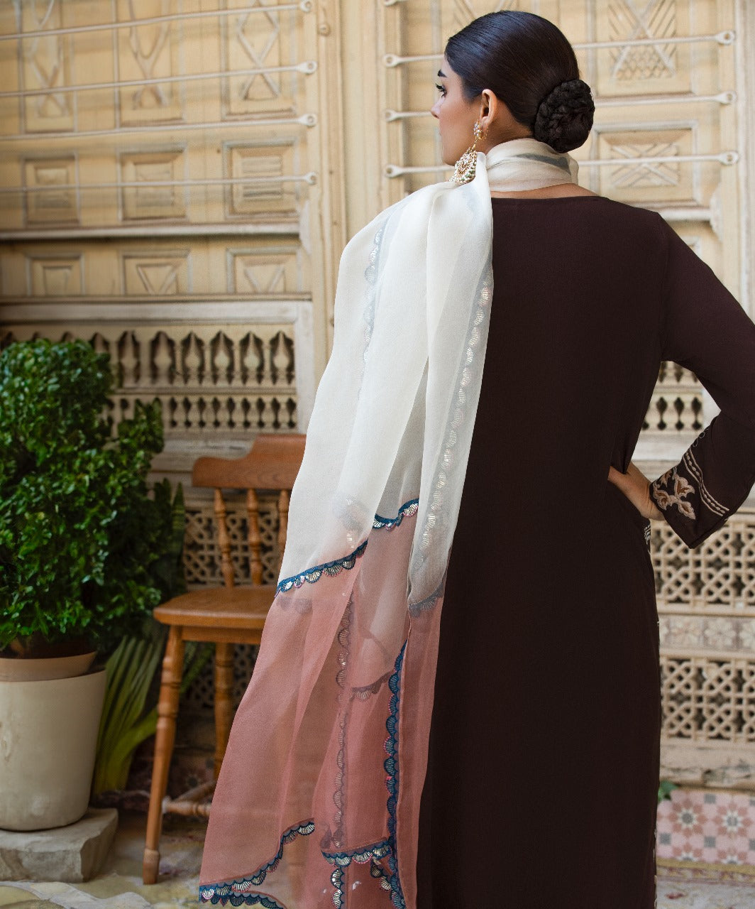 Elevate your elegance with this dark brown Shafoon silk suit, adorned with colorful kadhai and intricate designs on the front and shoulders. Paired with a delicate organza dupatta, it’s the perfect ensemble for making every occasion unforgettable.