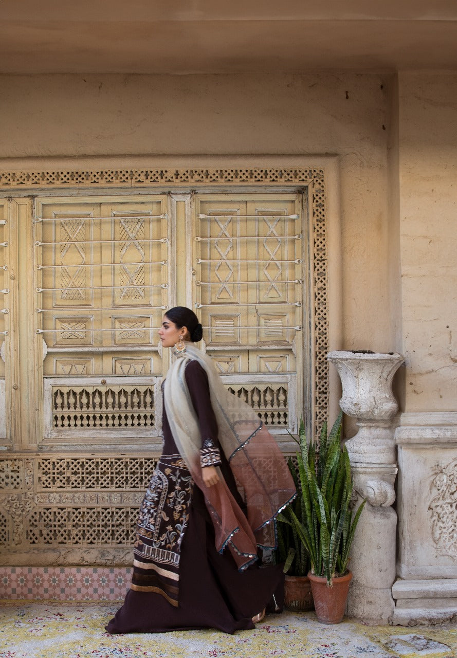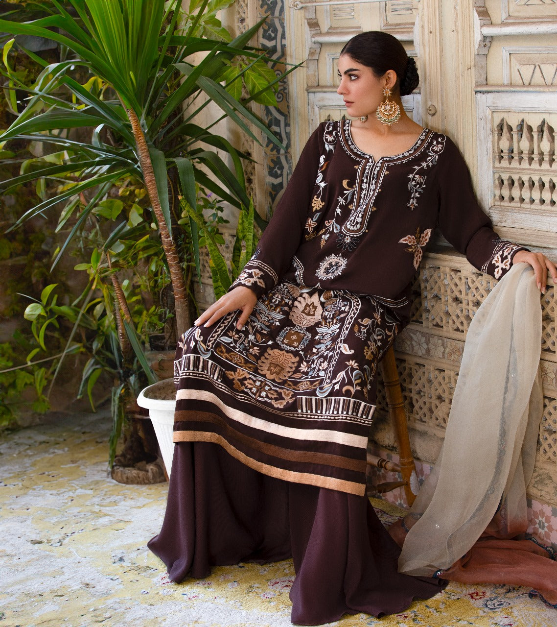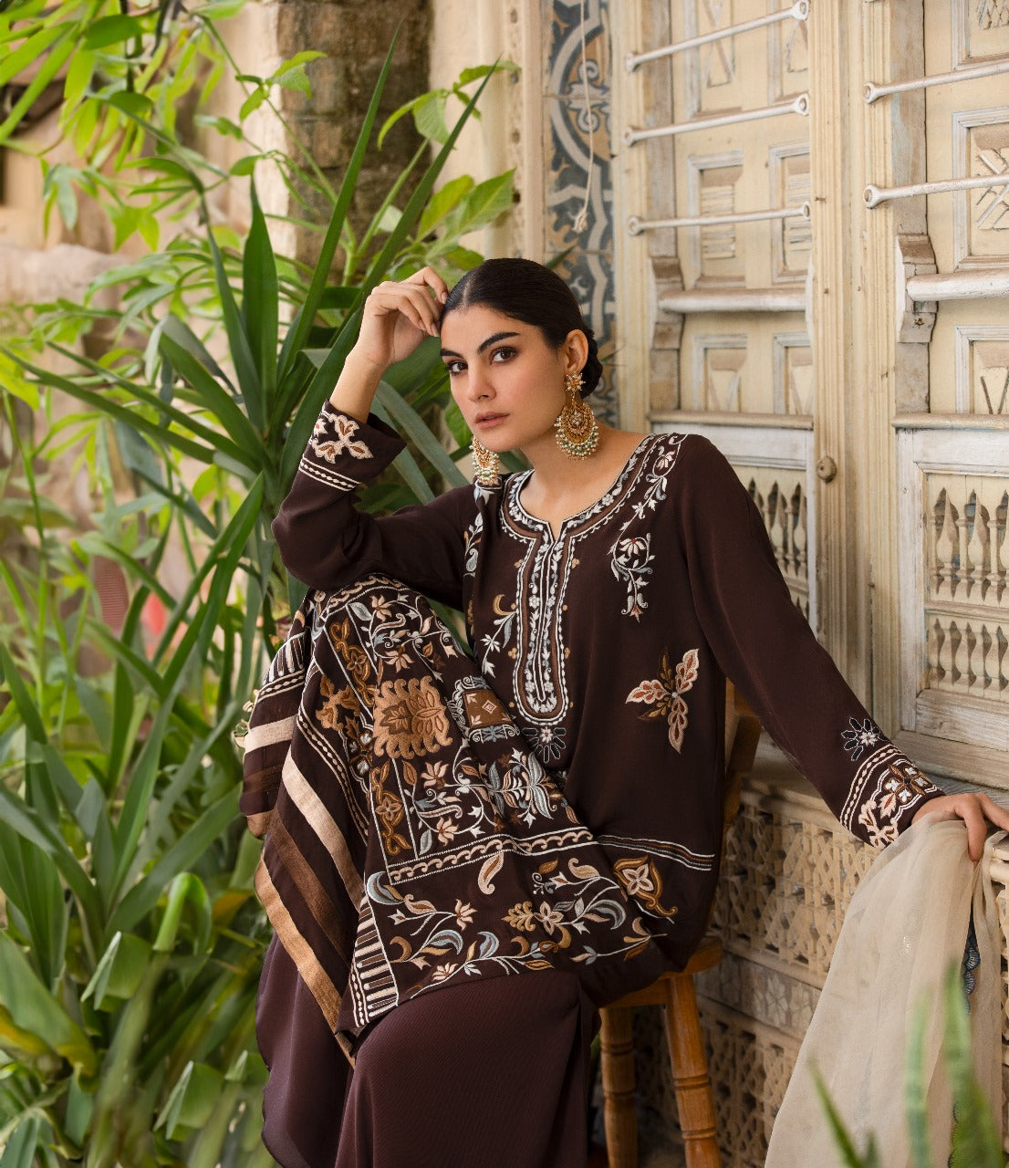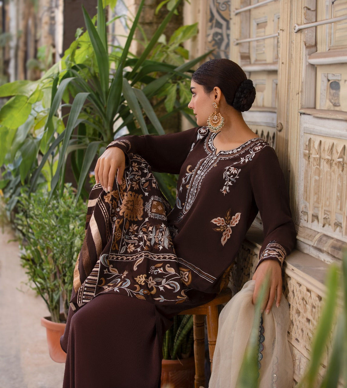 Elevate your elegance with this dark brown Shafoon silk suit, adorned with colorful kadhai and intricate designs on the front and shoulders. Paired with a delicate organza dupatta, it’s the perfect ensemble for making every occasion unforgettable.