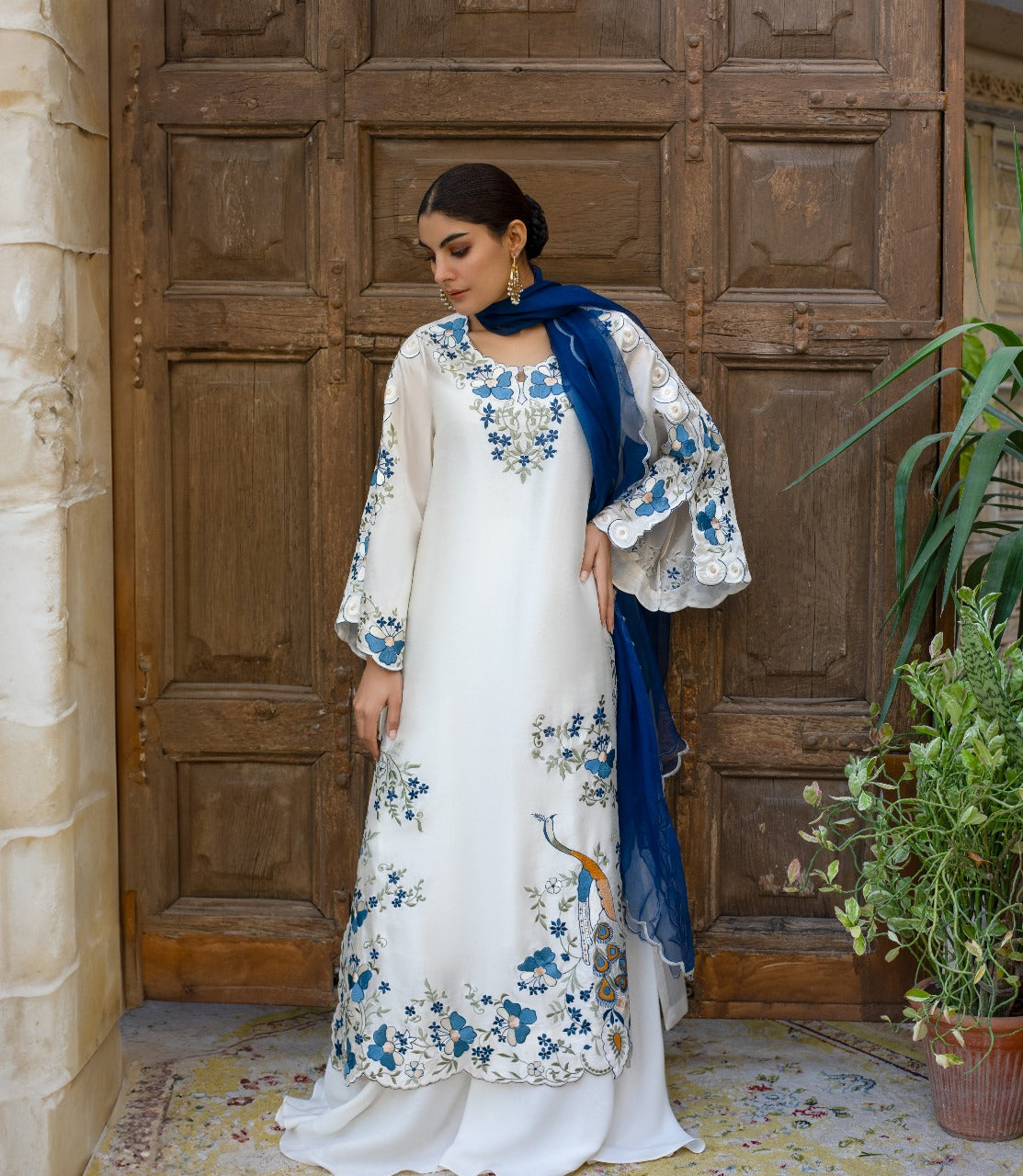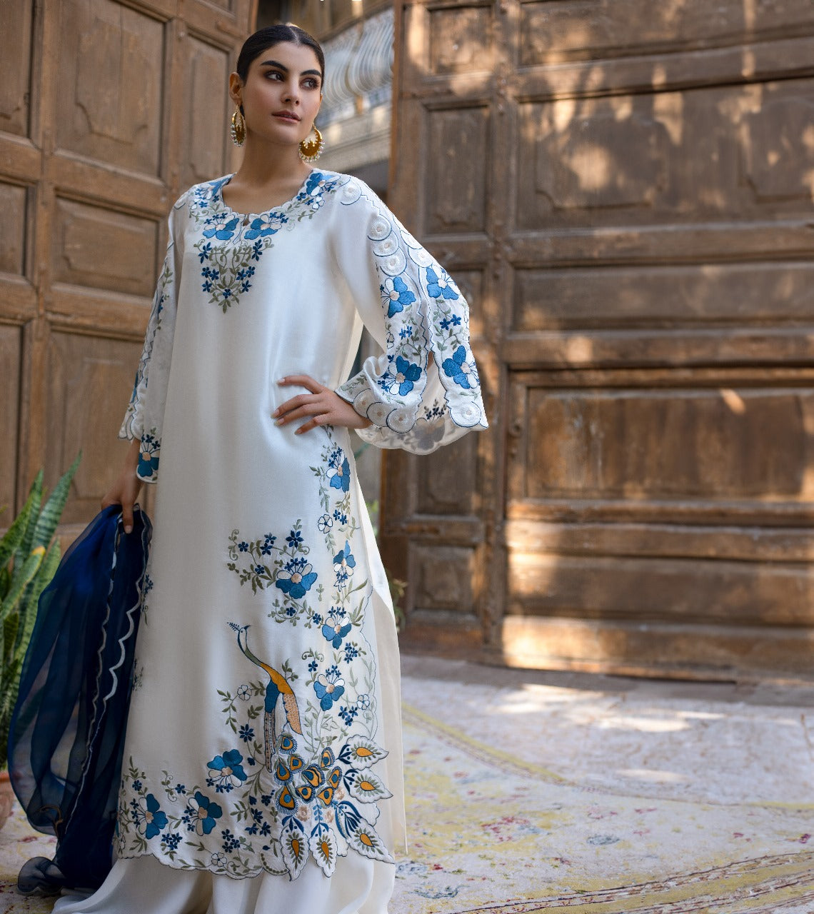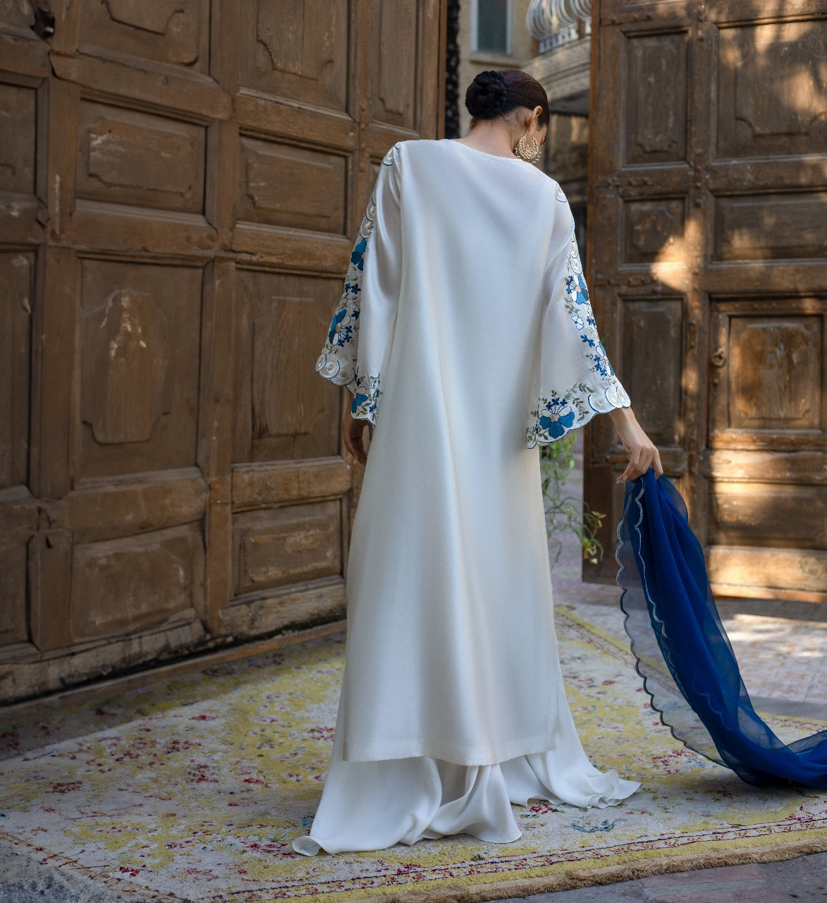An ivory shisha-silk long shirt, gracefully cut and adorned with delicate floral detailing — timeless, elegant, and perfect for every occasion. A piece that speaks beauty in its most effortless form.