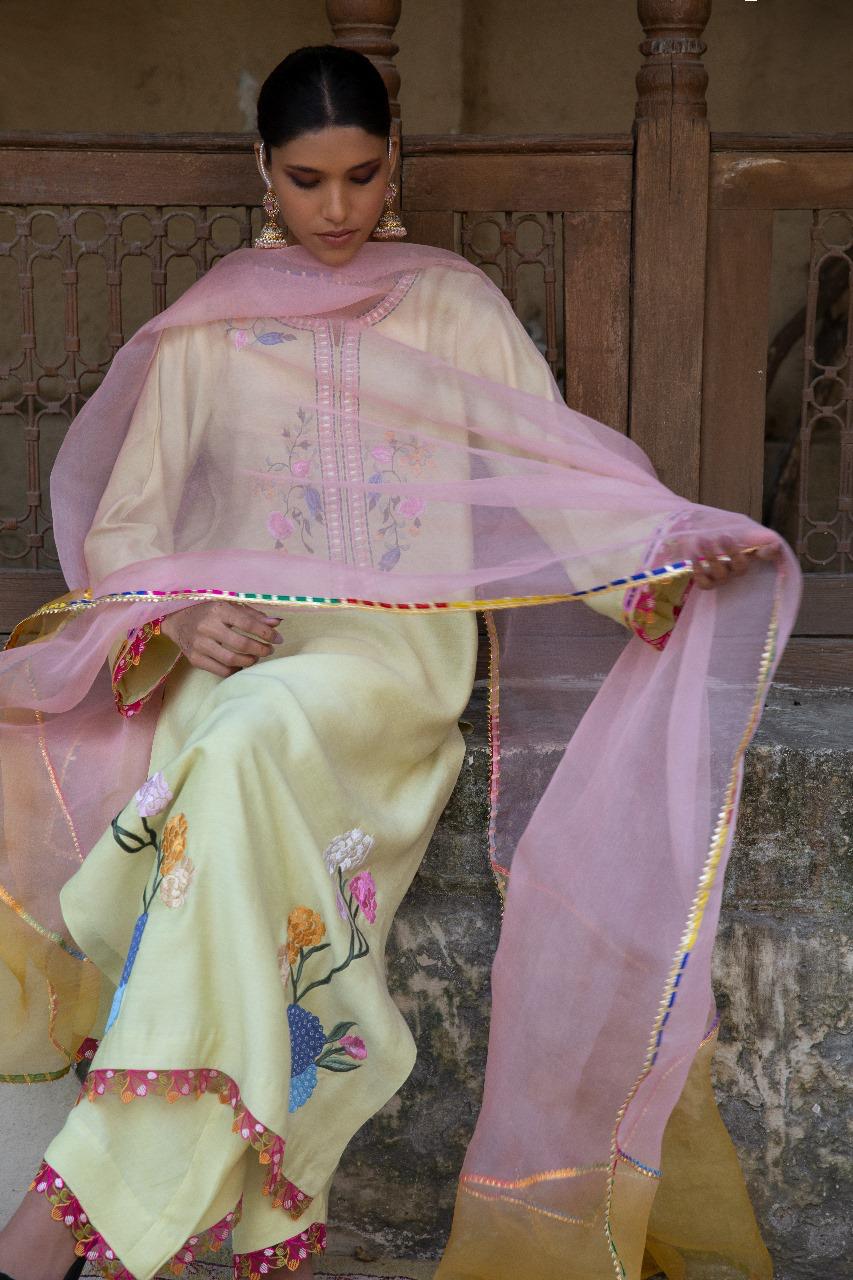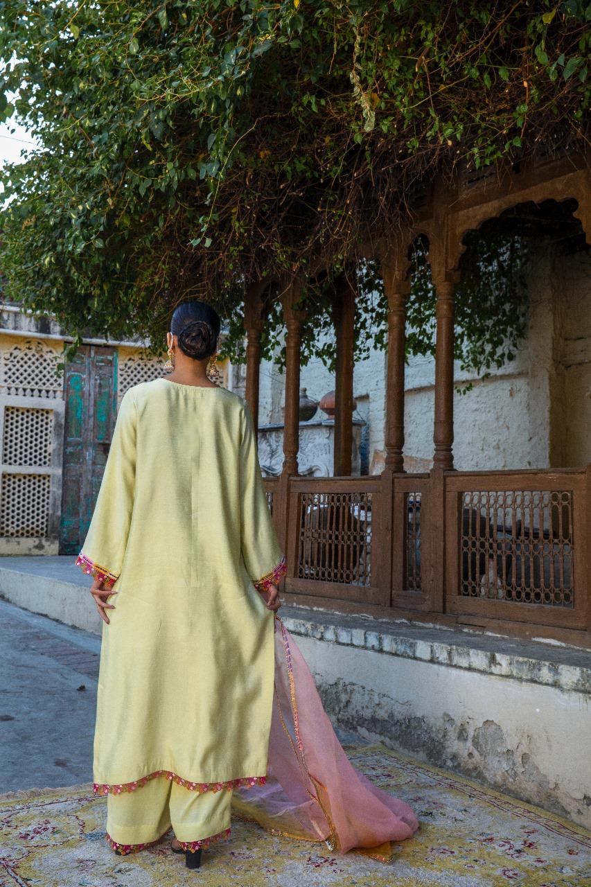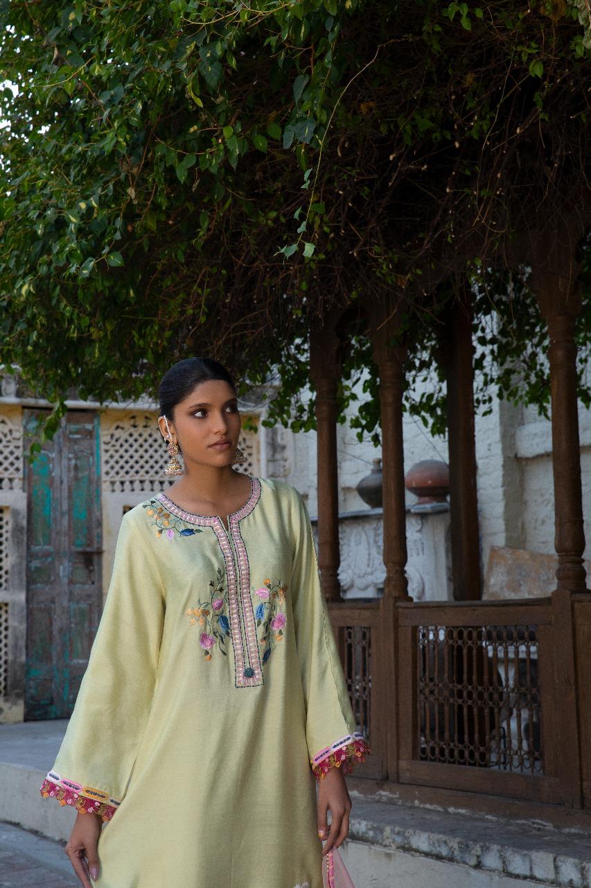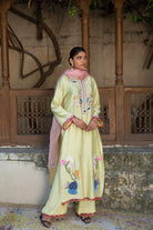 Embrace the freshness of this lemon-hued long suit, featuring delicate floral kadhai around the neckline and a beautifully designed daman. Crafted in luxurious cotton silk, it’s elegance redefined for every occasion.