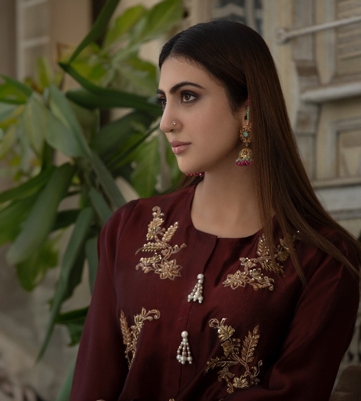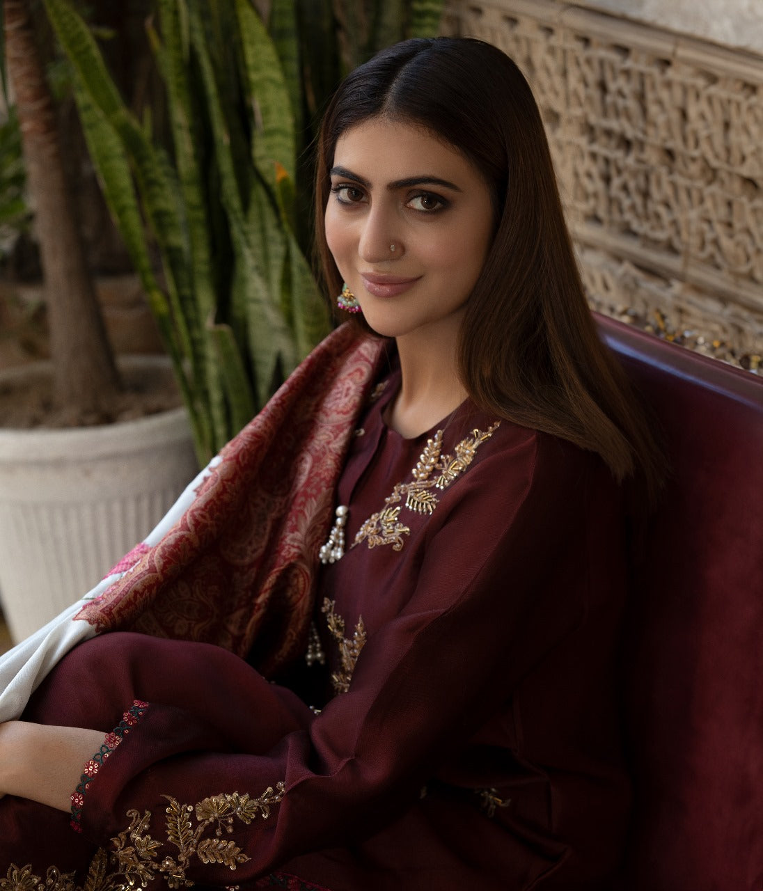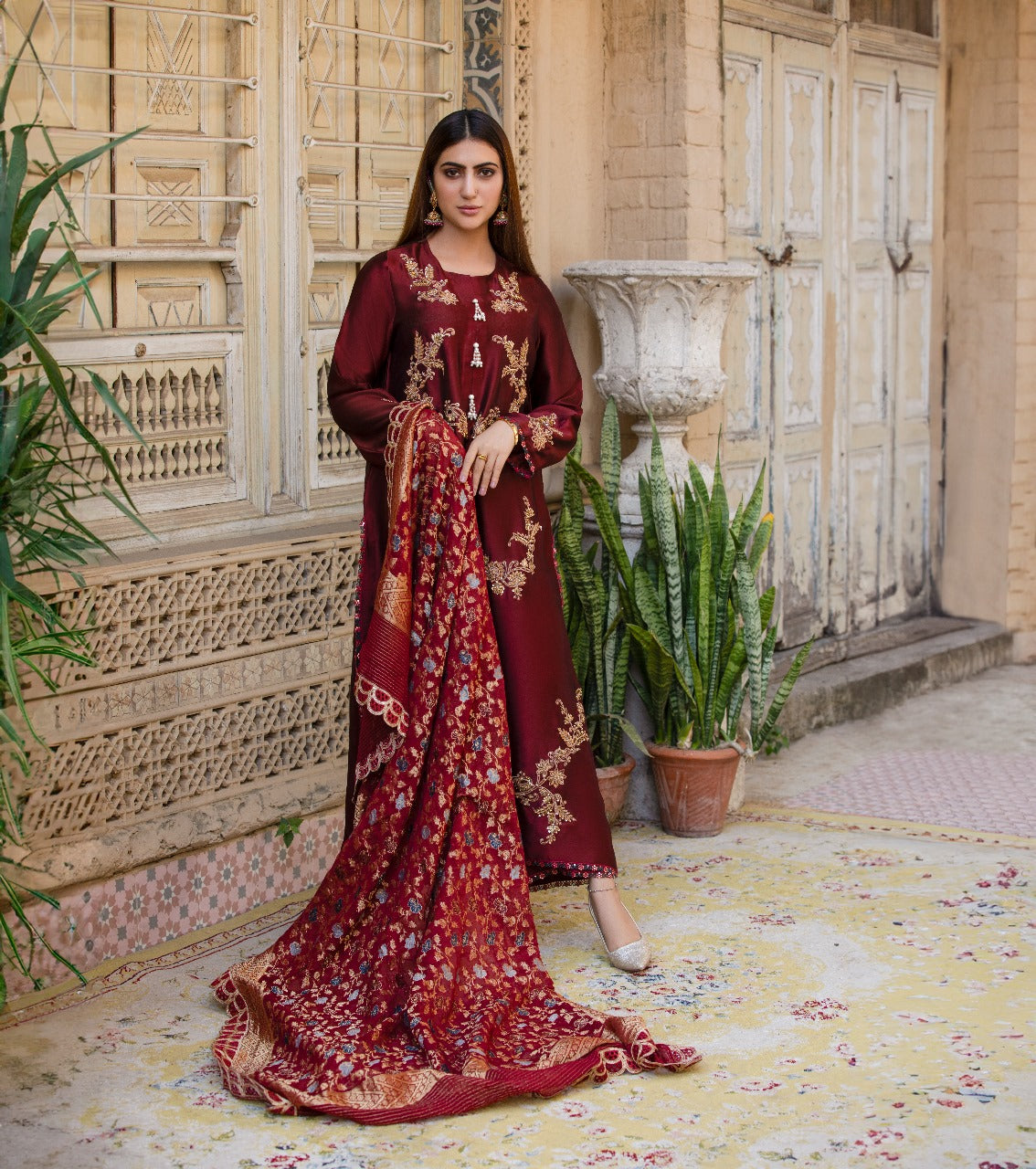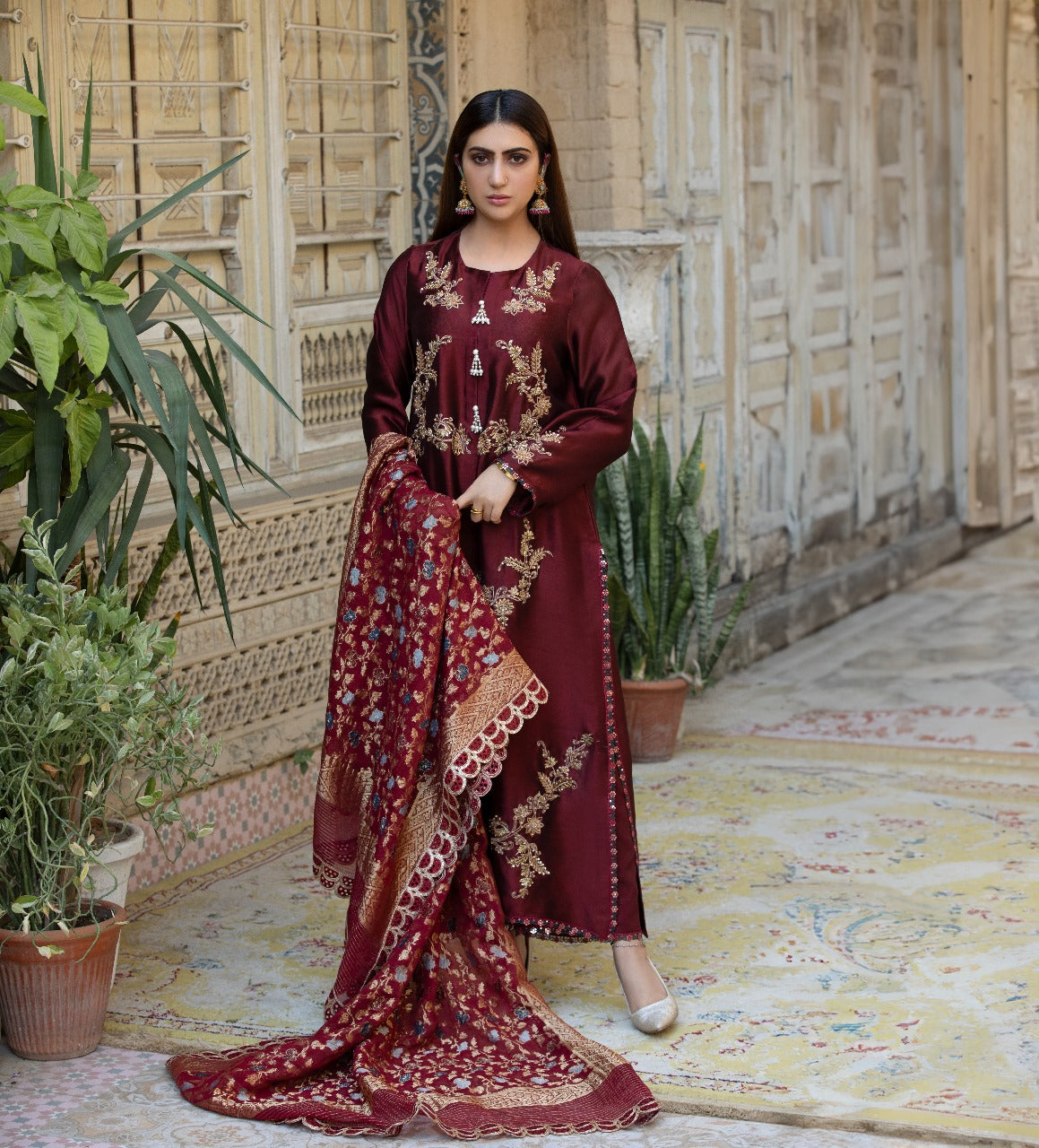 A rich maroon shisha-silk suit adorned with golden kadhai and adda work, finished with delicate pearl embellishments along the neckline. Intricately designed lace detailing adds a touch of refined luxury, making this ensemble perfect for festive evenings and special occasions.