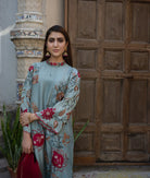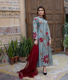 A graceful greenish-grey pure raw silk ensemble, beautifully detailed with full front-and-back kadhai in maroon and copper tones. The sleeves feature delicate multi-shade threadwork, adding richness to every stitch. Paired with an appliqué organza dupatta, this outfit is the perfect blend of elegance, artistry, and timeless charm.
