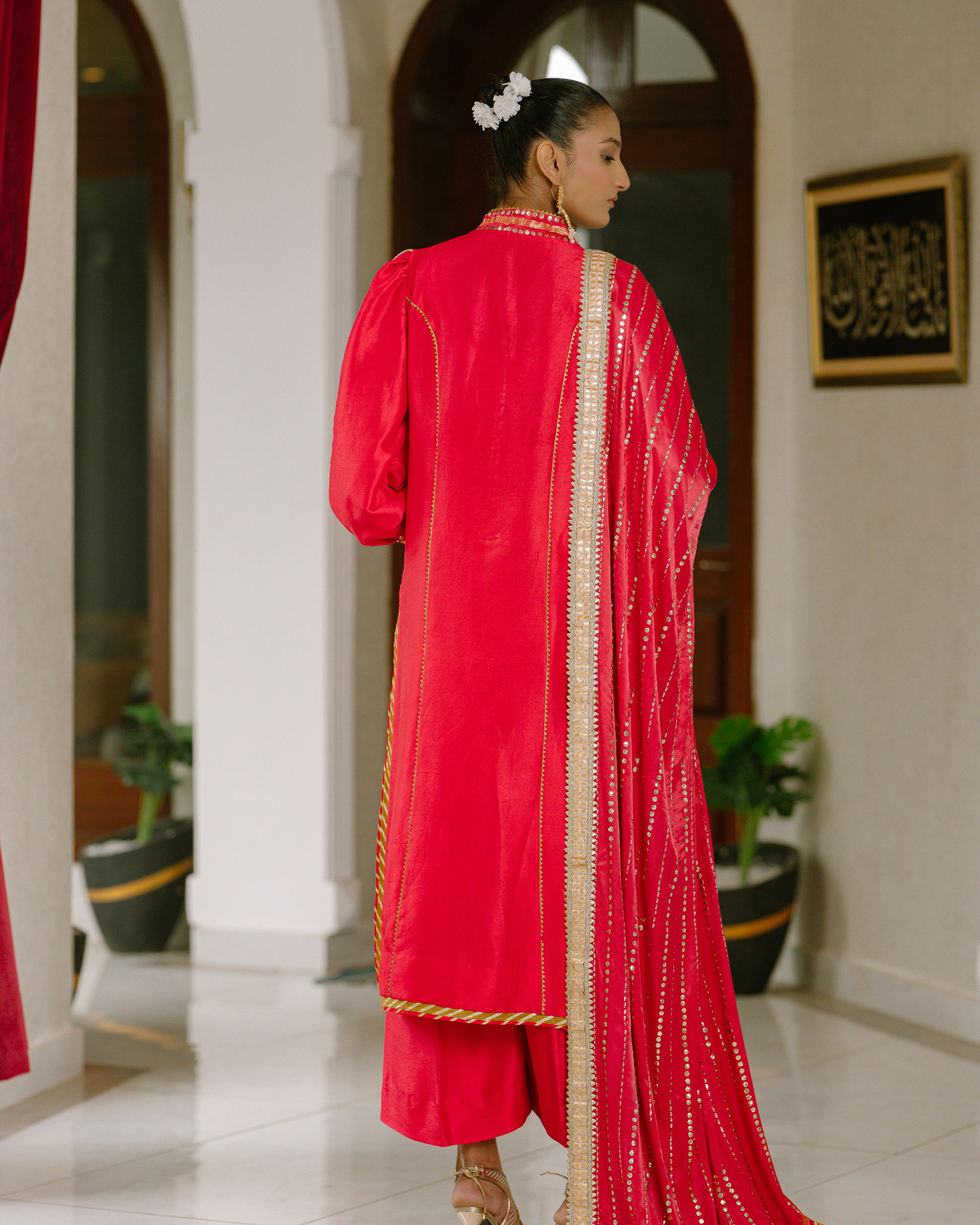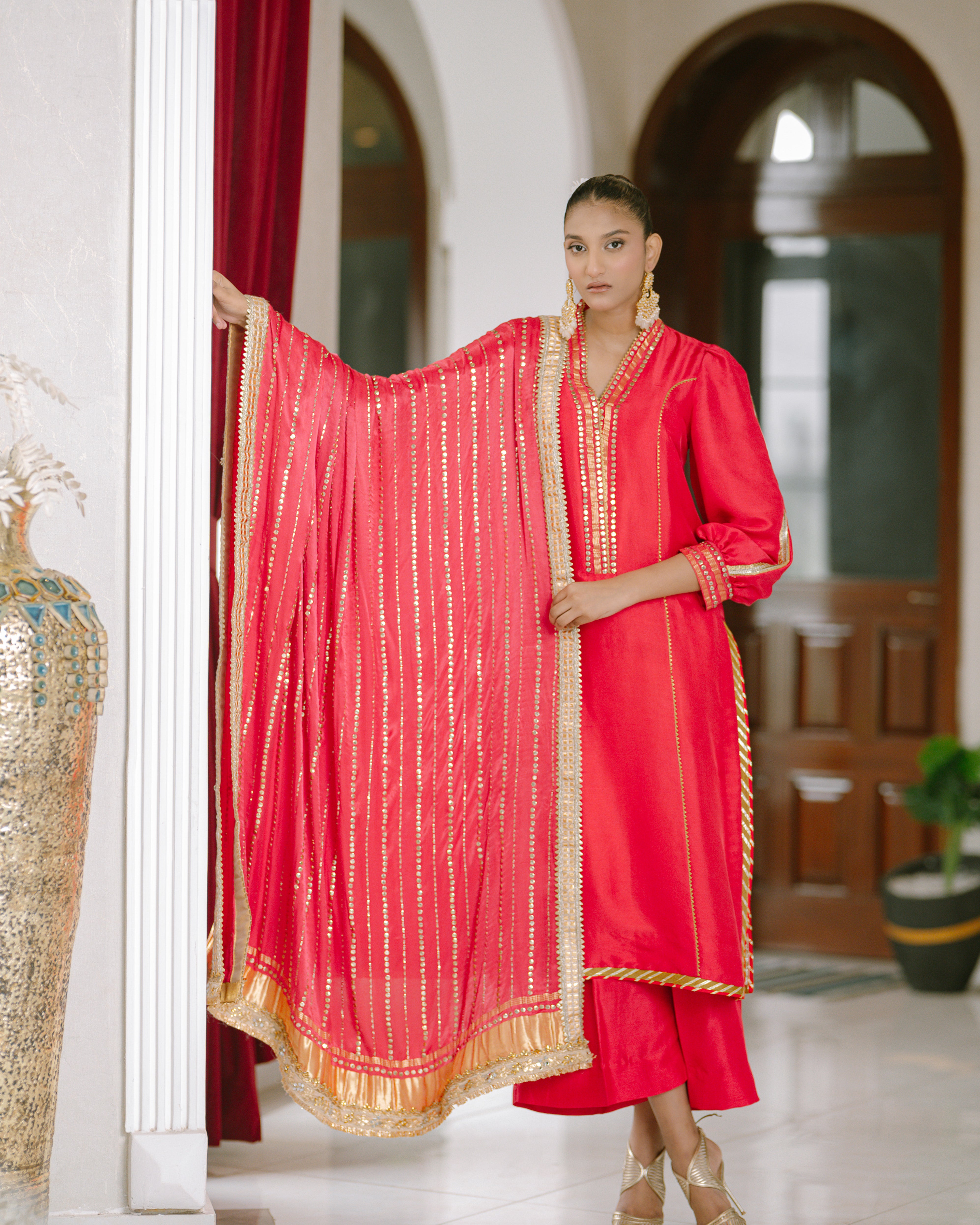 Embrace timeless elegance with this red raw silk suit, complemented by a pure silk dupatta featuring exquisite makesh work. With customizable colors and designs, this masterpiece is crafted to reflect your unique style and grace.