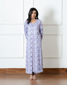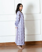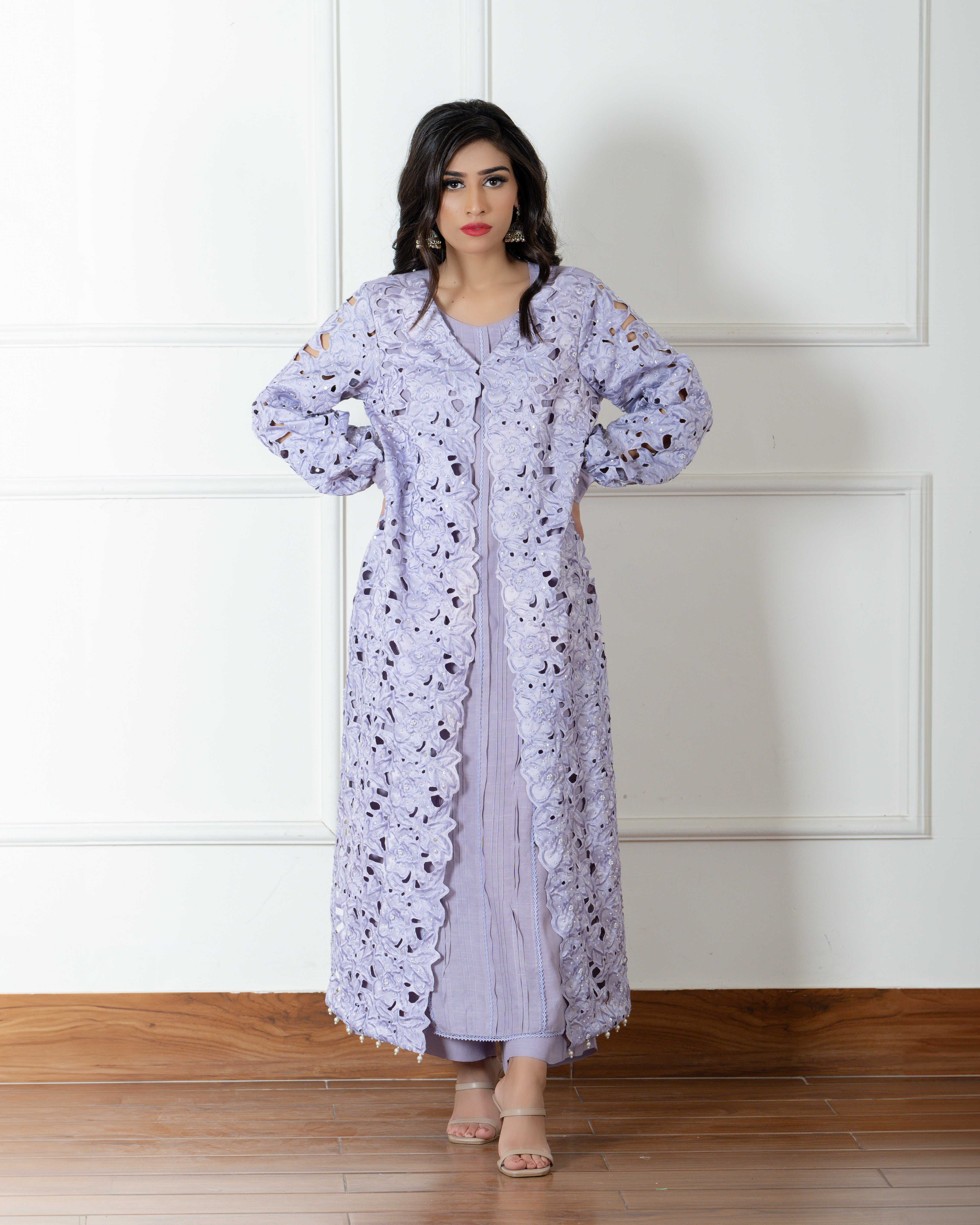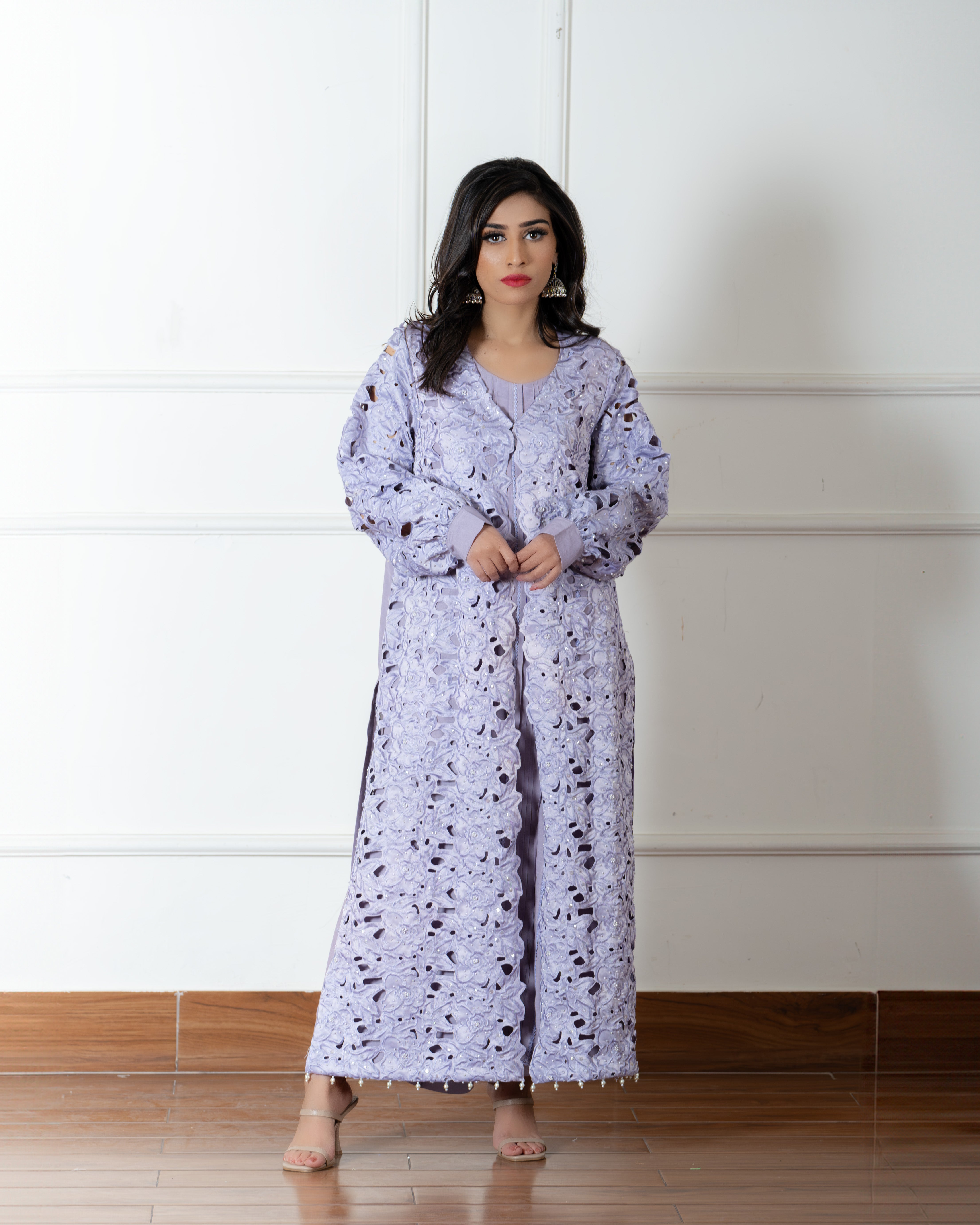Step into elegance with our lilac cutwork embroidered gown, where delicate artistry meets timeless style. Perfect for any special occasion, this gown adds a touch of romance to your wardrobe