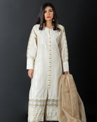 Discover effortless elegance with our off-white embroidered karandi open shirt, beautifully detailed with lace accents and ivory buttons. Perfect for layering or wearing solo, this versatile piece adds a touch of sophistication to any outfit.