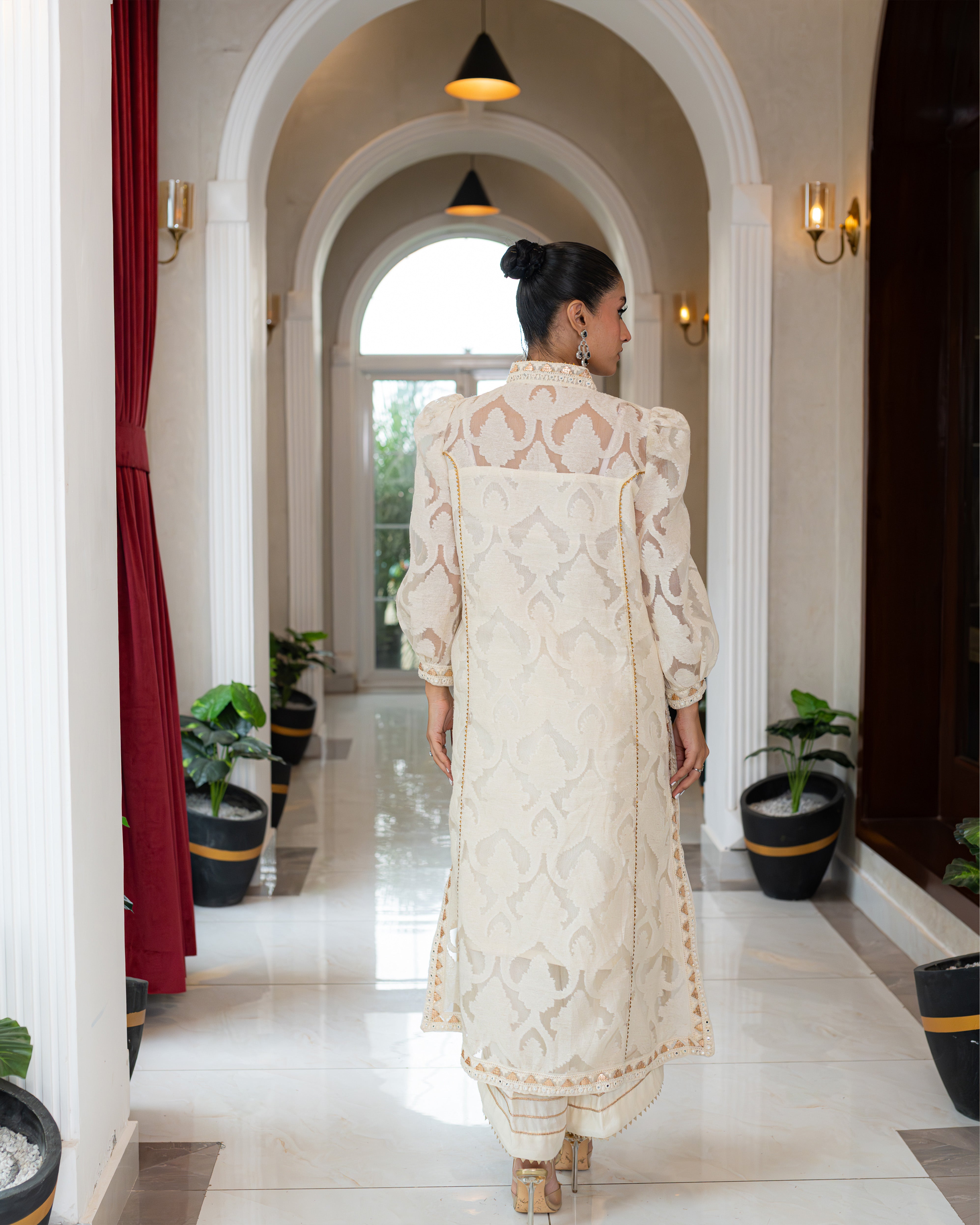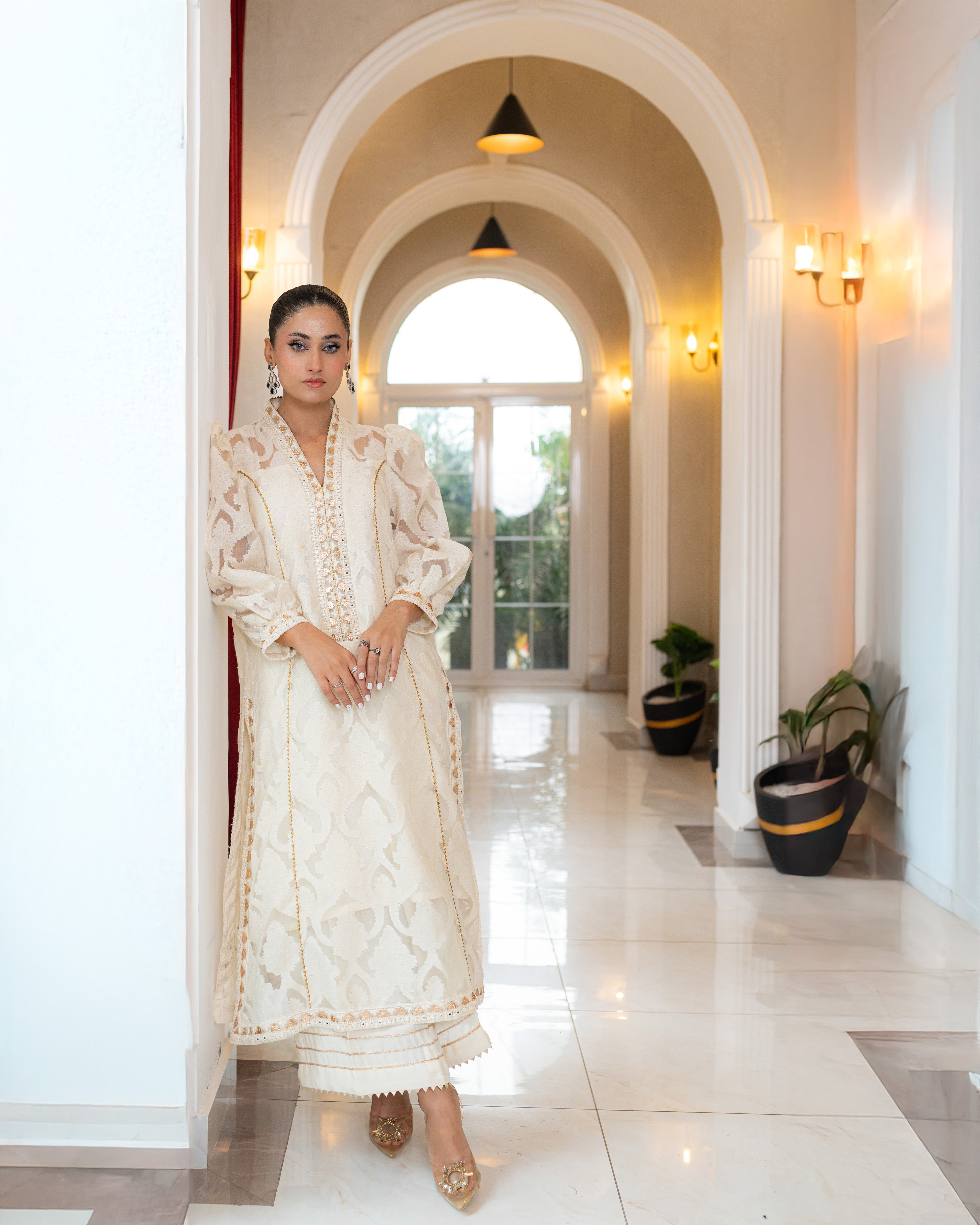 Timeless Ivory ✨ – Crafted from self-stuff fabric with delicate lace detailing and intricate embellishments, this piece is the epitome of elegance. Perfect for any occasion where you want to shine.