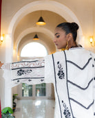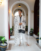 Flowing, white dress crafted from delicate milky cotton net fabric, gently draping over the body with ethereal grace. The intricate black embroidered laces adorn the dress, weaving intricate patterns that catch the light and shimmer with every movement. The dress exudes an air of sophistication and charm, perfect for celebrating Eid or making a grand entrance at any party. Its timeless elegance and unique design make it a standout piece that effortlessly captures attention and leaves a lasting impression.