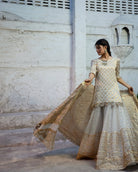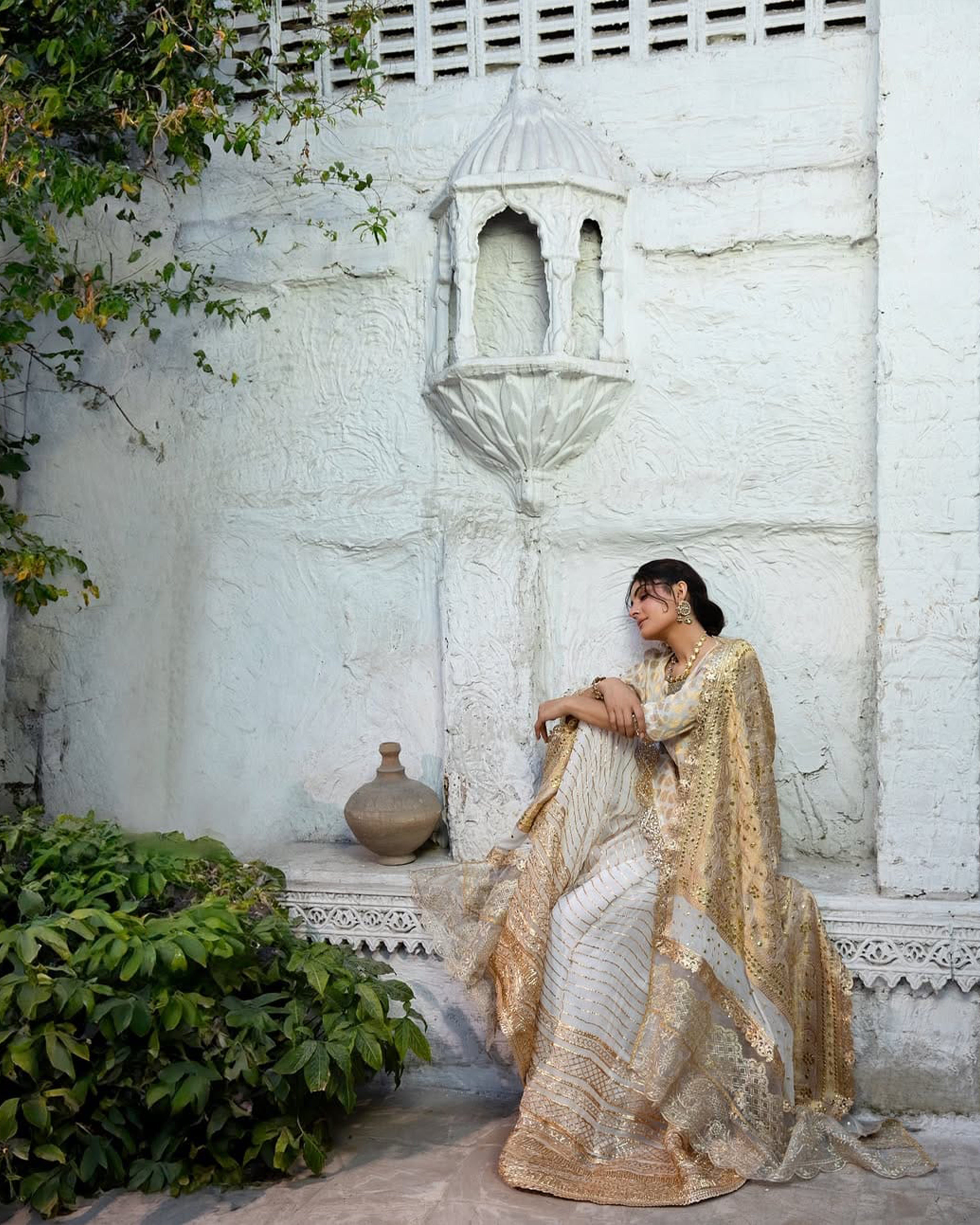 The outfit consists of a long, intricately designed kameez with delicate gold patterns, paired with a flowing sharara that adds movement and grandeur to her look. A matching dupatta, richly adorned with gold embroidery and sequins, billows gracefully as she twirls.