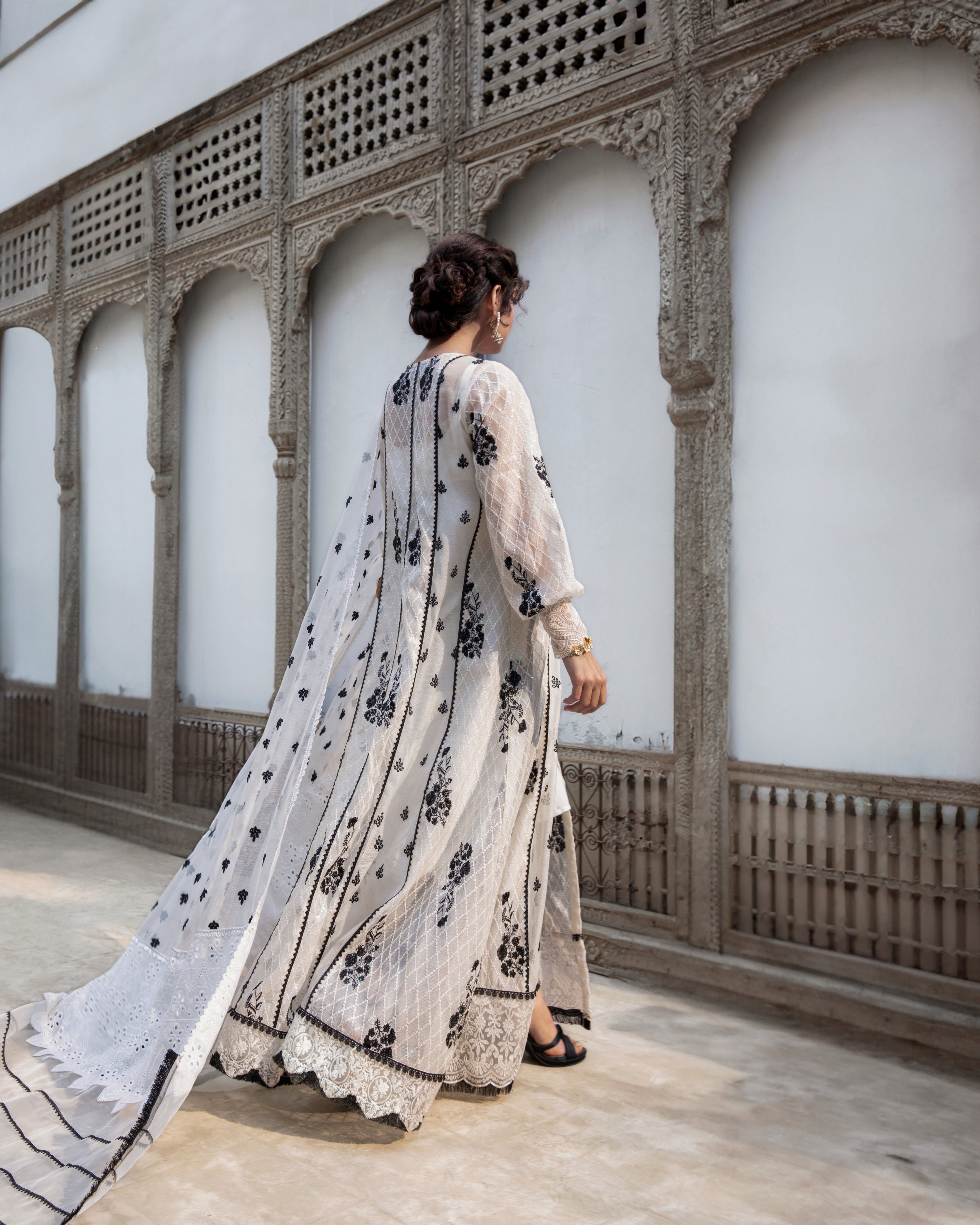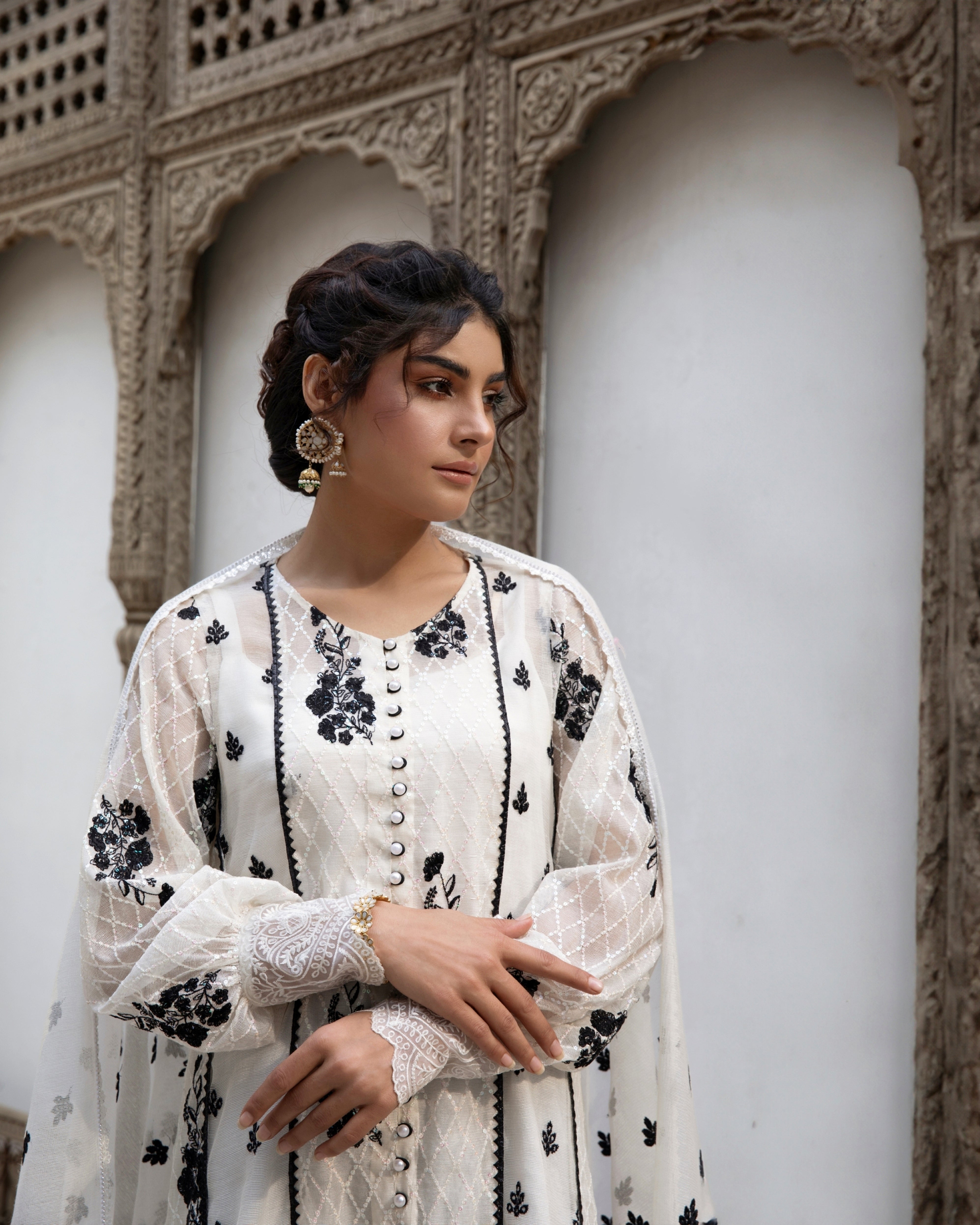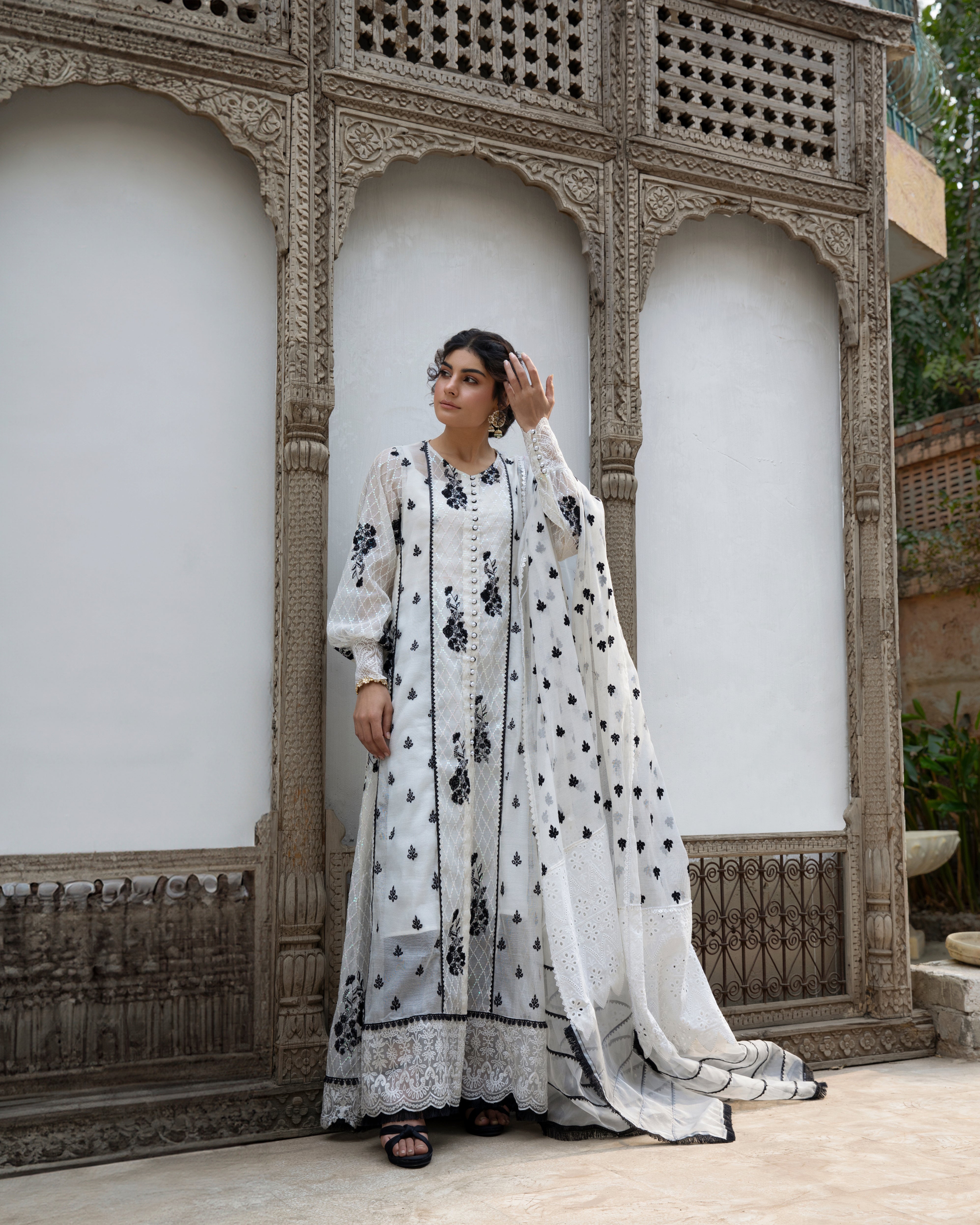 flowing, white dress crafted from delicate milky cotton net fabric, gently draping over the body with ethereal grace. The intricate black embroidered laces adorn the dress, weaving intricate patterns that catch the light and shimmer with every movement. The dress exudes an air of sophistication and charm, perfect for celebrating Eid or making a grand entrance at any party. Its timeless elegance and unique design make it a standout piece that effortlessly captures attention and leaves a lasting impression.