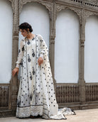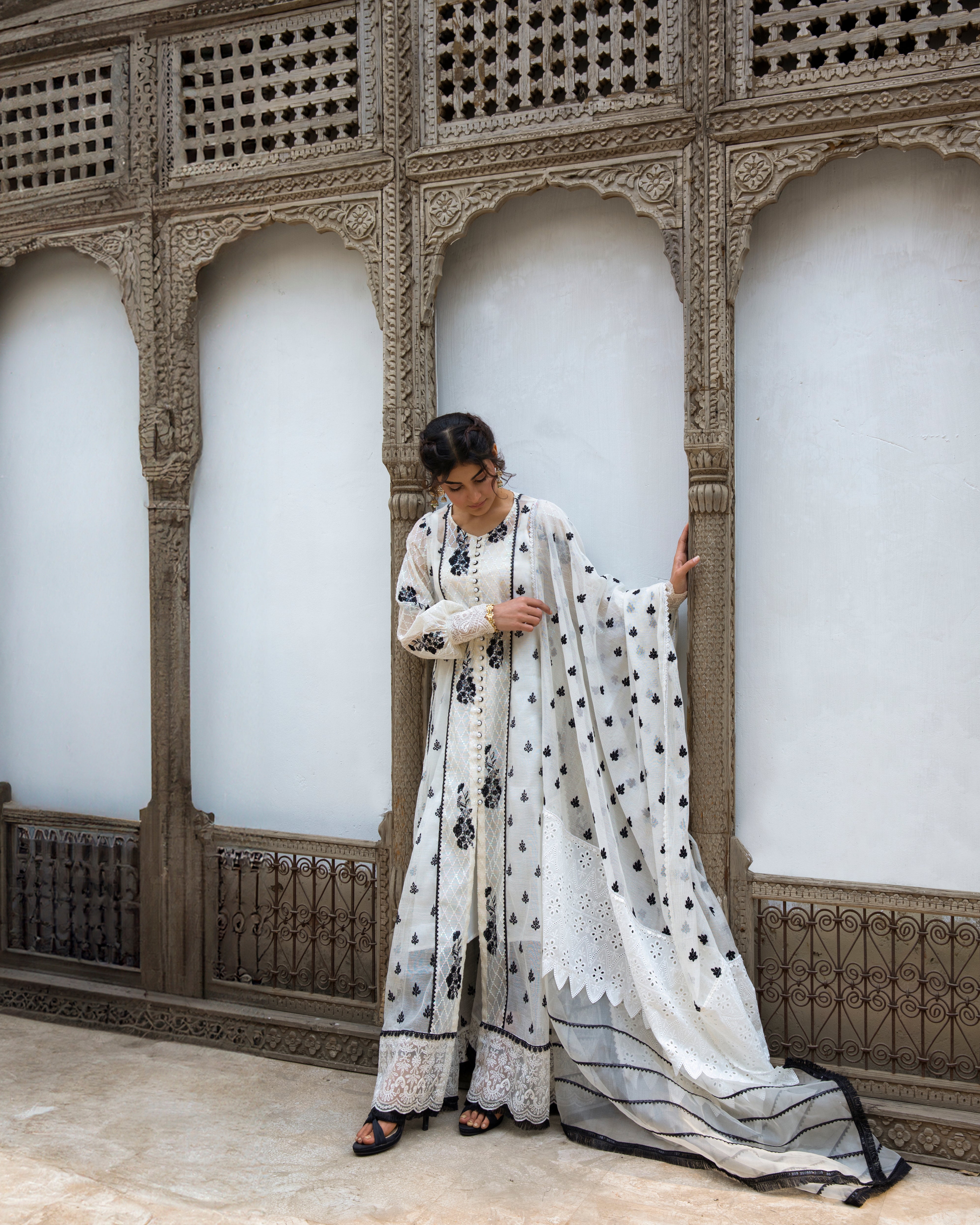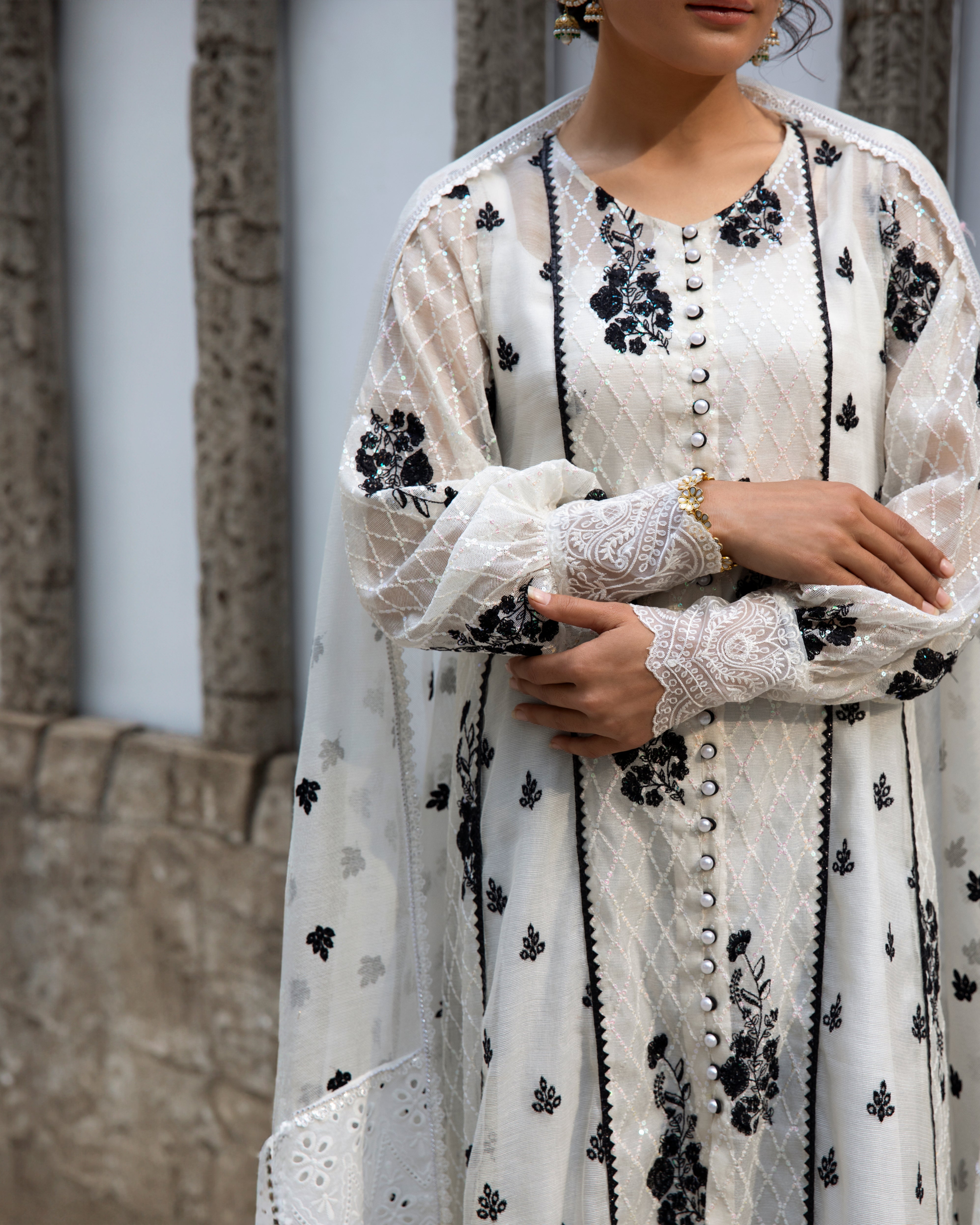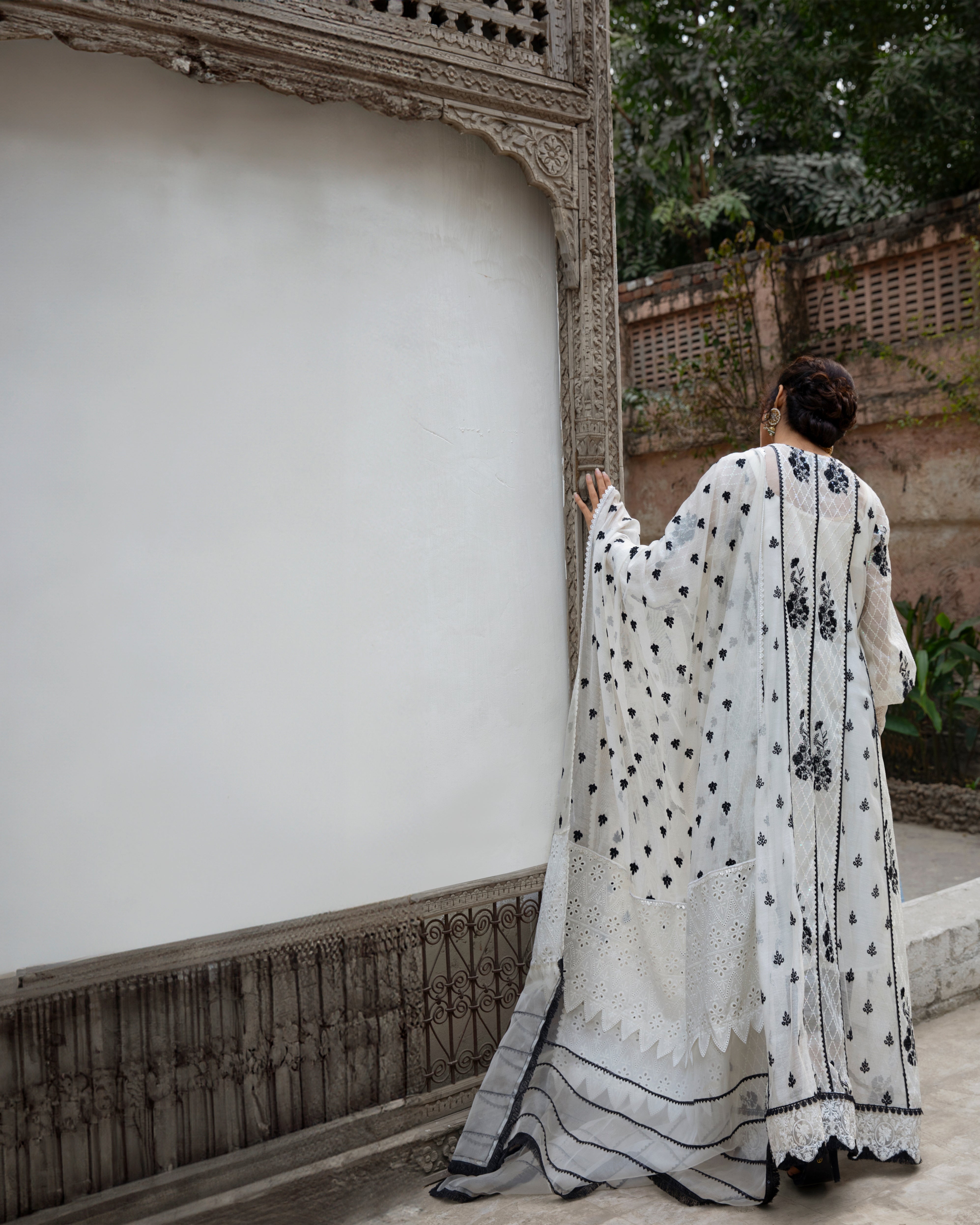 flowing, white dress crafted from delicate milky cotton net fabric, gently draping over the body with ethereal grace. The intricate black embroidered laces adorn the dress, weaving intricate patterns that catch the light and shimmer with every movement. The dress exudes an air of sophistication and charm, perfect for celebrating Eid or making a grand entrance at any party. Its timeless elegance and unique design make it a standout piece that effortlessly captures attention and leaves a lasting impression.
