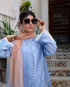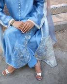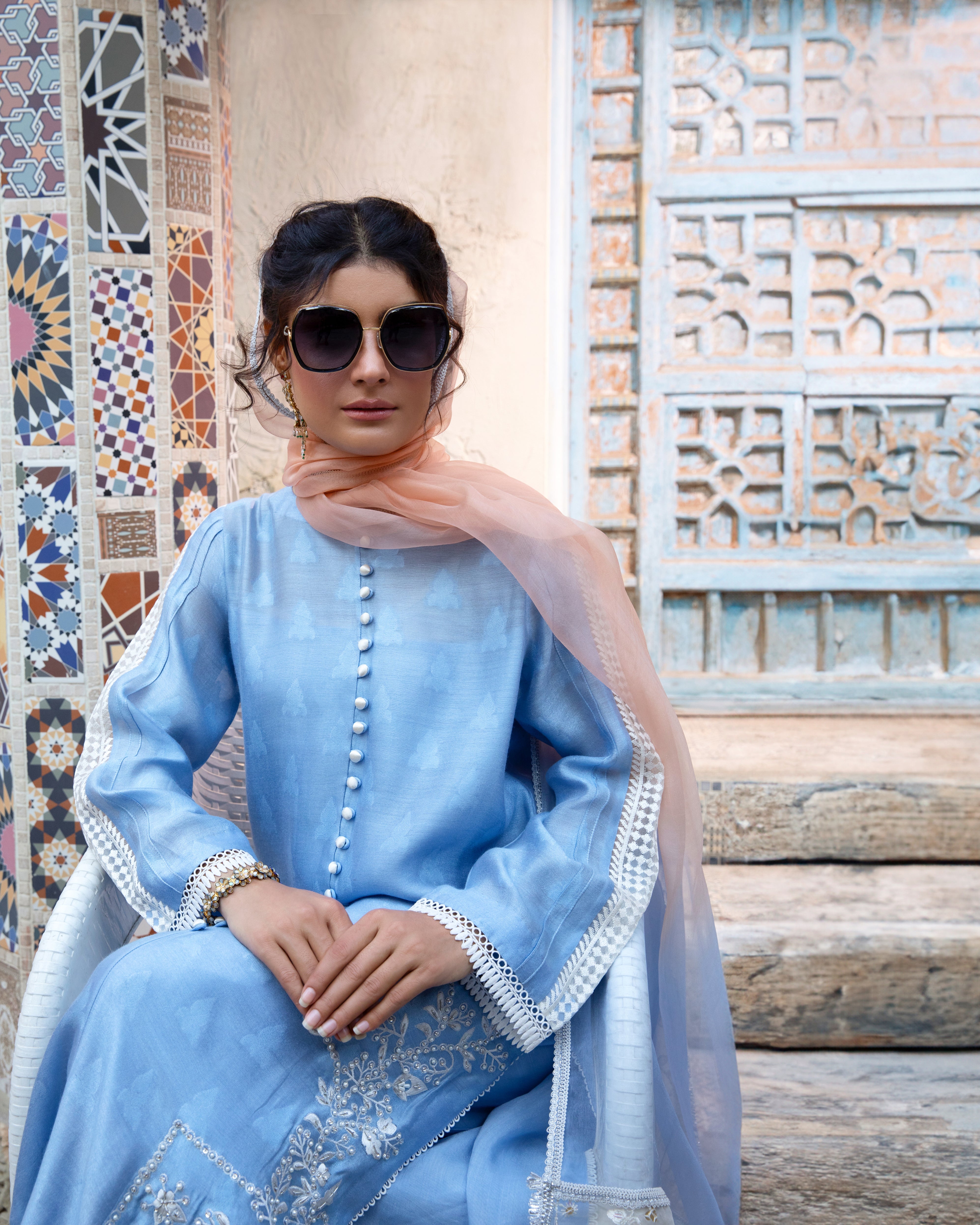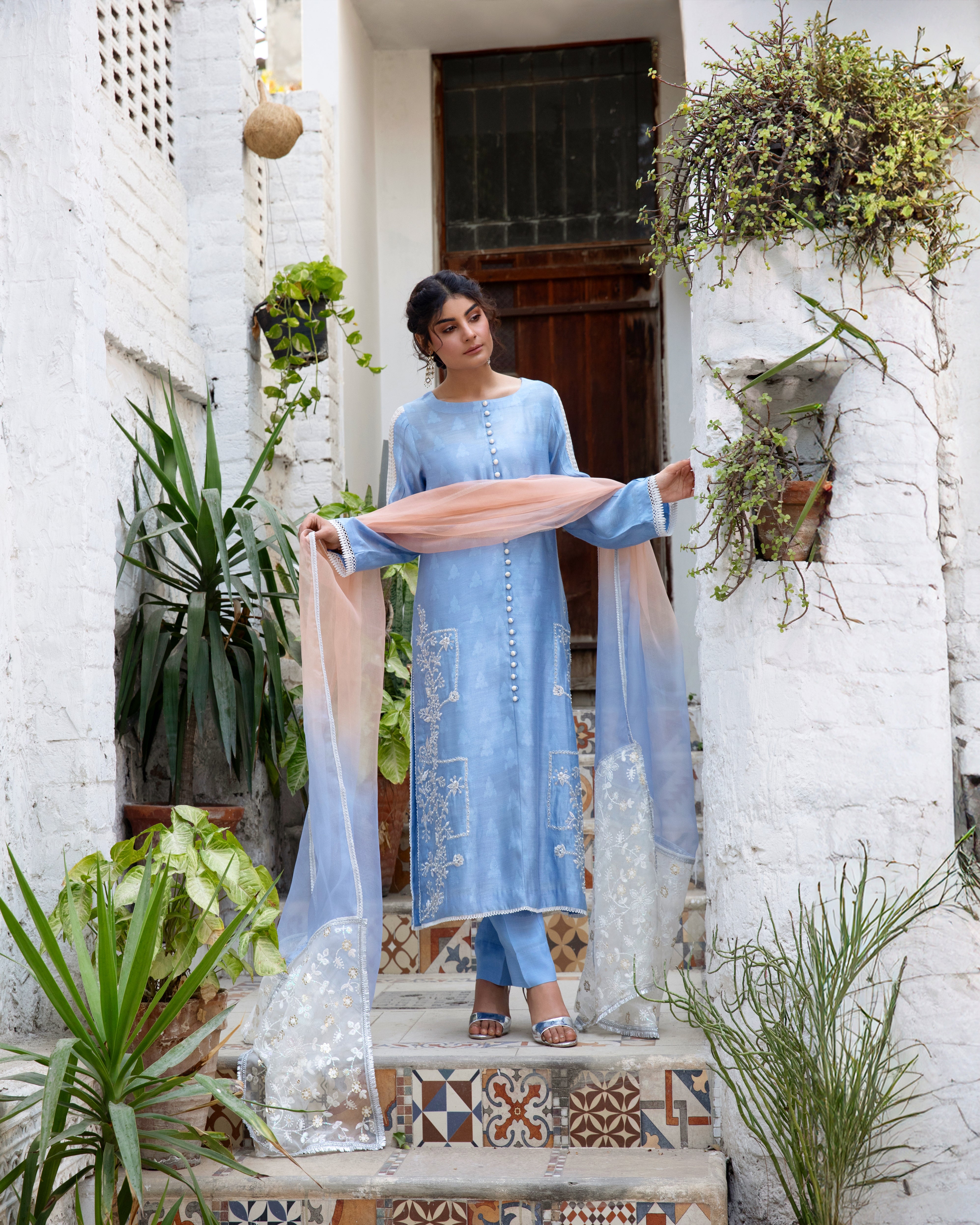 A vision of elegance in light Prussian blue ✨ This exquisite ensemble is adorned with delicate white detailing and intricate adda work, exuding timeless grace. The front-buttoned shirt enhances its charm, while the ombre organza dupatta in soft hues elevates the look with a touch of ethereal beauty. A perfect blend of sophistication and tradition for the festive season