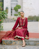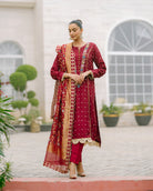 This rich *deep crimson* suit is a true work of art, featuring intricate *gandwork* embroidery with delicate pearls and stones that add a touch of glamour. The beautiful *rasham* work weaves through the fabric, enhancing its luxurious feel. Paired with a pure Banarsi dupatta, the soft sheen of the fabric is accented by vibrant, contrasting colors, creating an opulent and regal look. The play of different hues on the dupatta adds dimension and richness, making this suit a perfect blend of tradition and sophistication for any special occasion