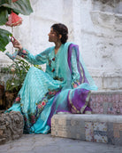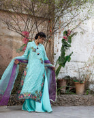 This turquoise ensemble features a self-patterned pure cotton net shirt, intricately embroidered with a palette of colors, enhancing its beauty with sharara.The dupatta, crafted from organza, is thoughtfully shaded to complement the outfit, achieving a harmonious balance. This attire is an excellent choice for Eid and can be gracefully worn at various events.