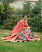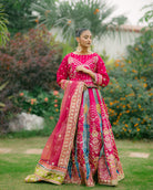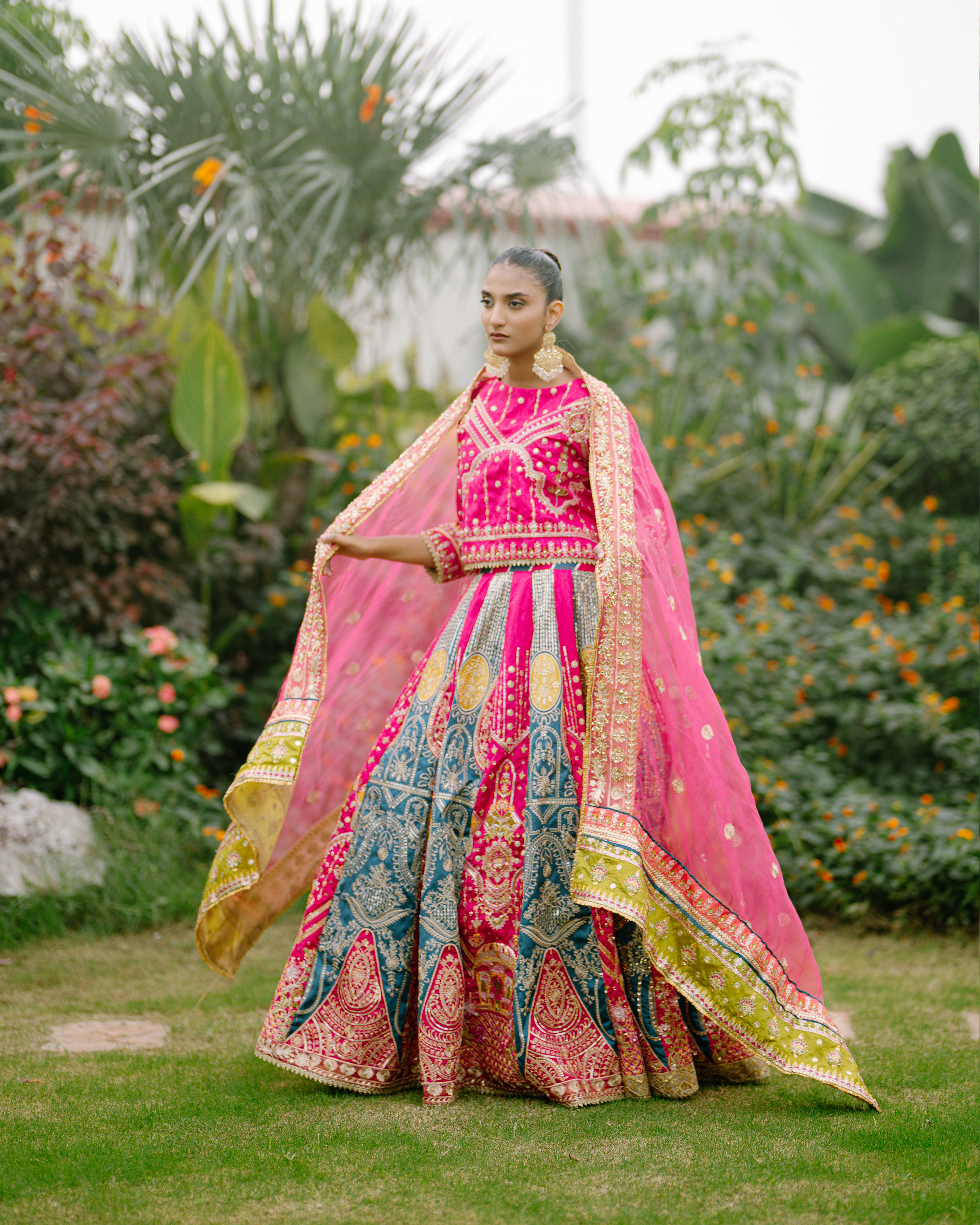 This stunning lehenga in a vibrant fusion of royal blue and shocking pink is a true embodiment of grandeur. The lehenga is intricately embroidered with delicate handwork, showcasing a blend of traditional craftsmanship and modern elegance. The rich fabric is adorned with shimmering pearls and stones, adding a layer of sophistication and sparkle. Paired with a luxurious Korean organza dupatta, which flows gracefully with every movement, the ensemble is further elevated by exquisite buttons and tassels that lend it a regal touch. This lehenga is a perfect choice for those seeking a blend of opulence and timeless beauty, exuding a royal aura with every detail.