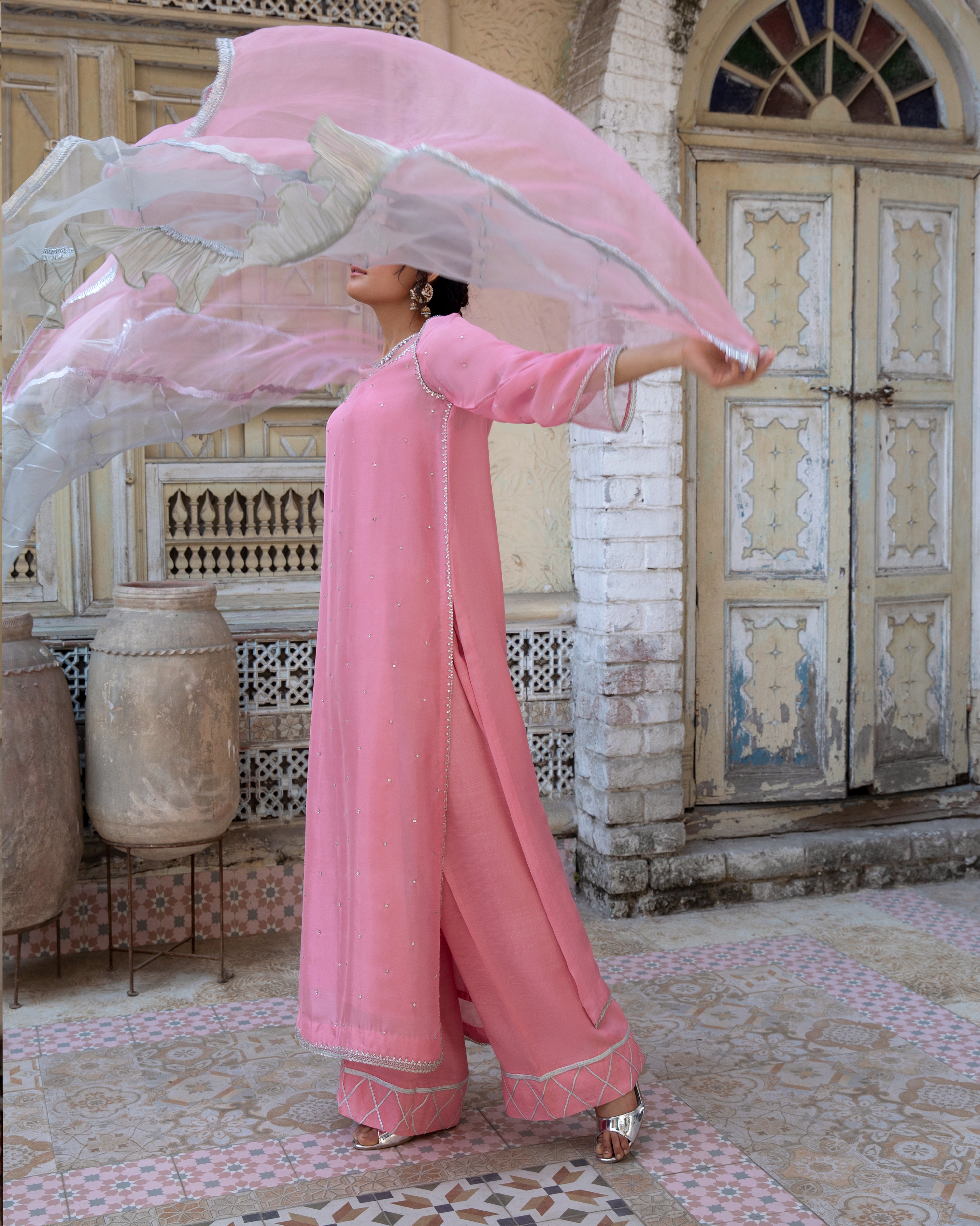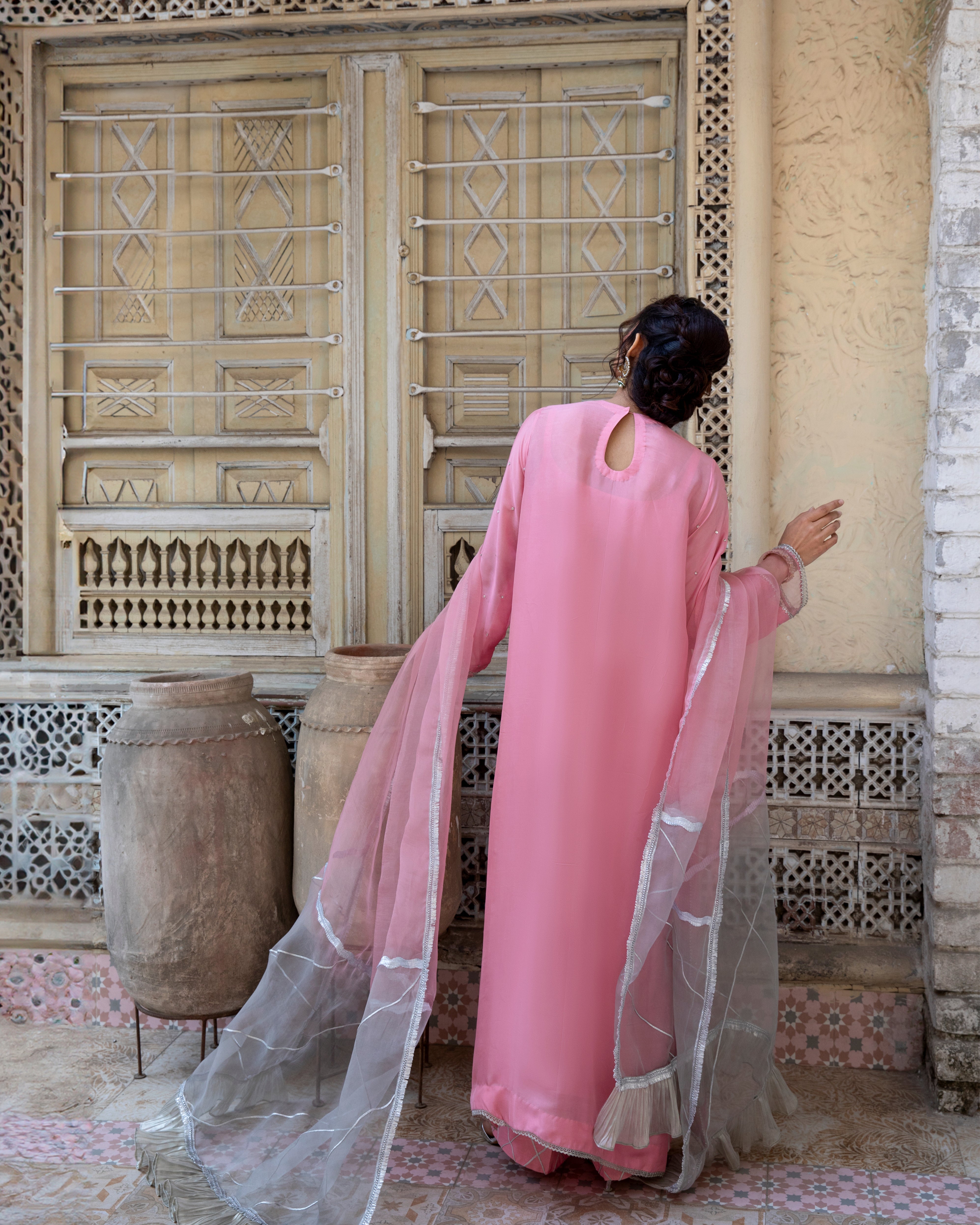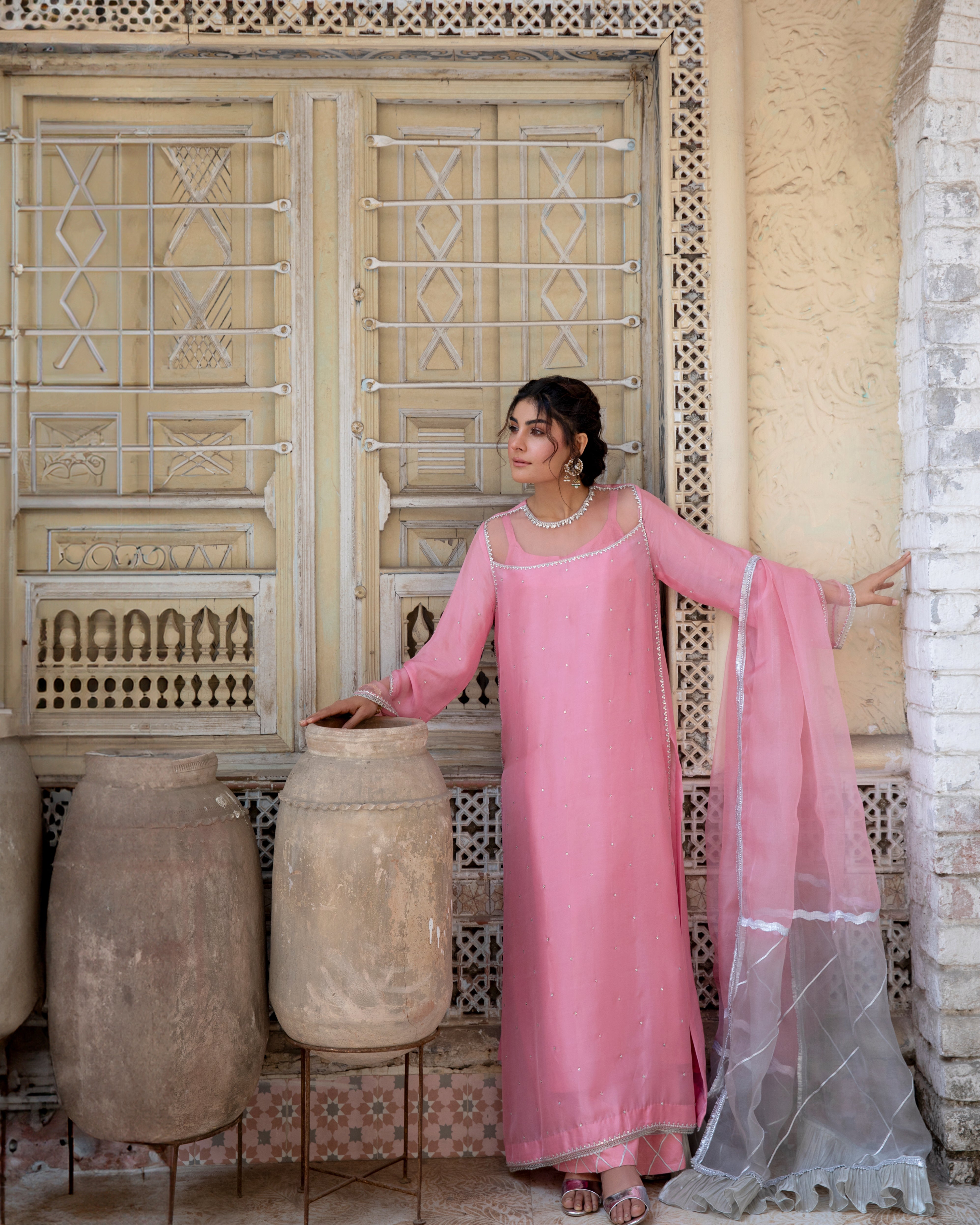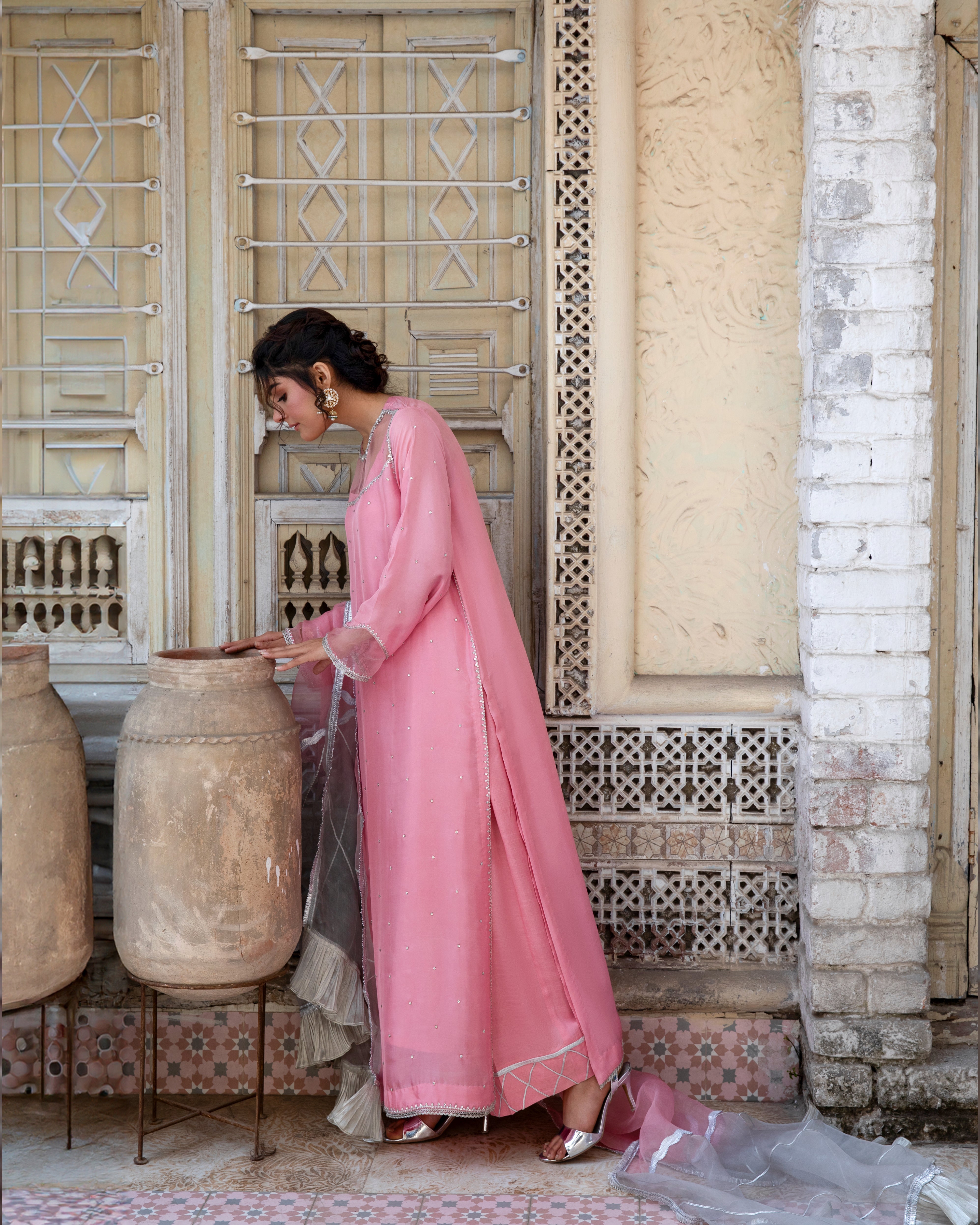 This exquisite suit is made from luxurious pink silk, adorned with delicate silver embellishments that enhance its elegance. The outfit is beautifully paired with an organza dupatta in a dual-shade effect, blending soft pink with silver accents for a graceful and ethereal look. The subtle detailing and flowing silhouette make this ensemble a perfect