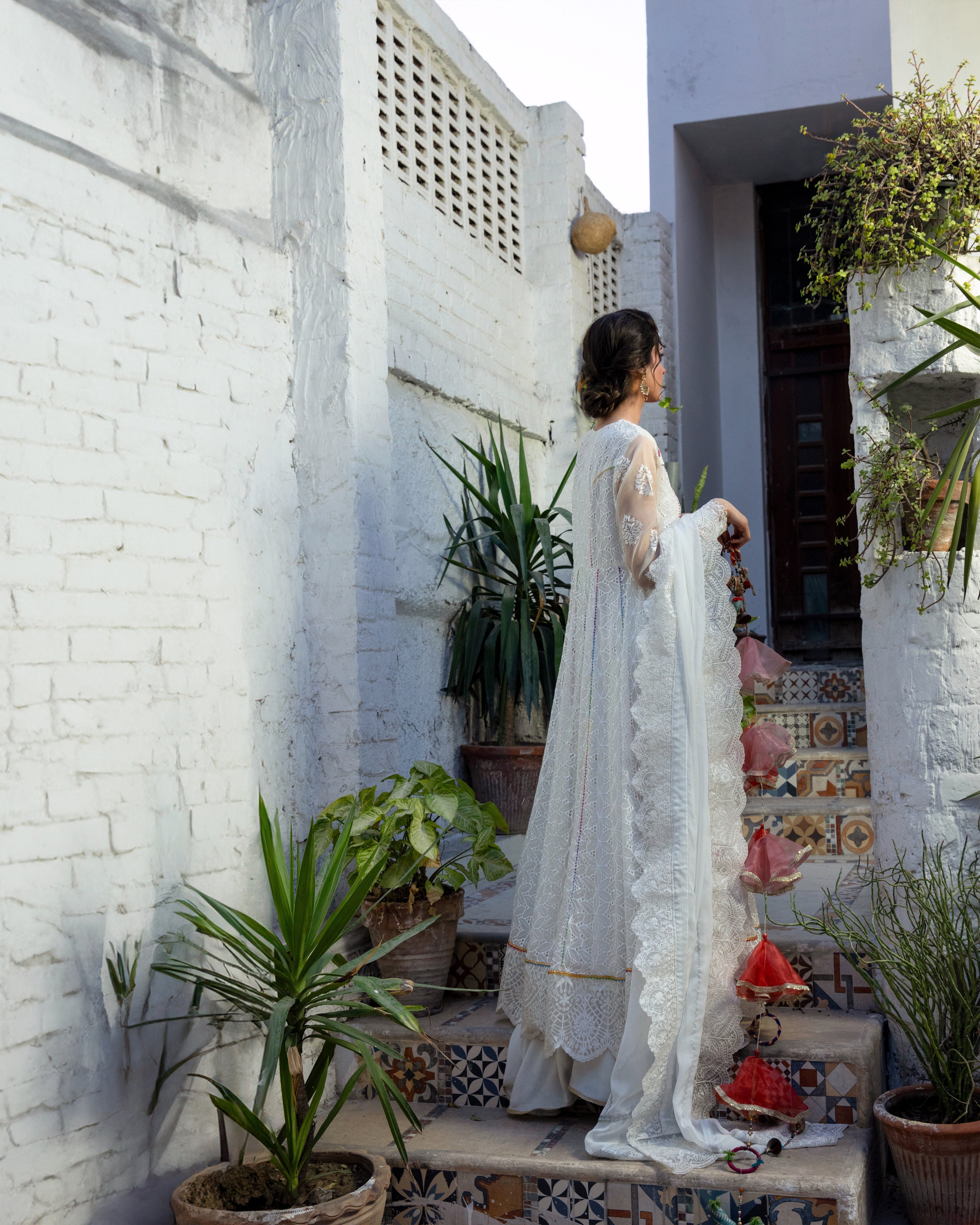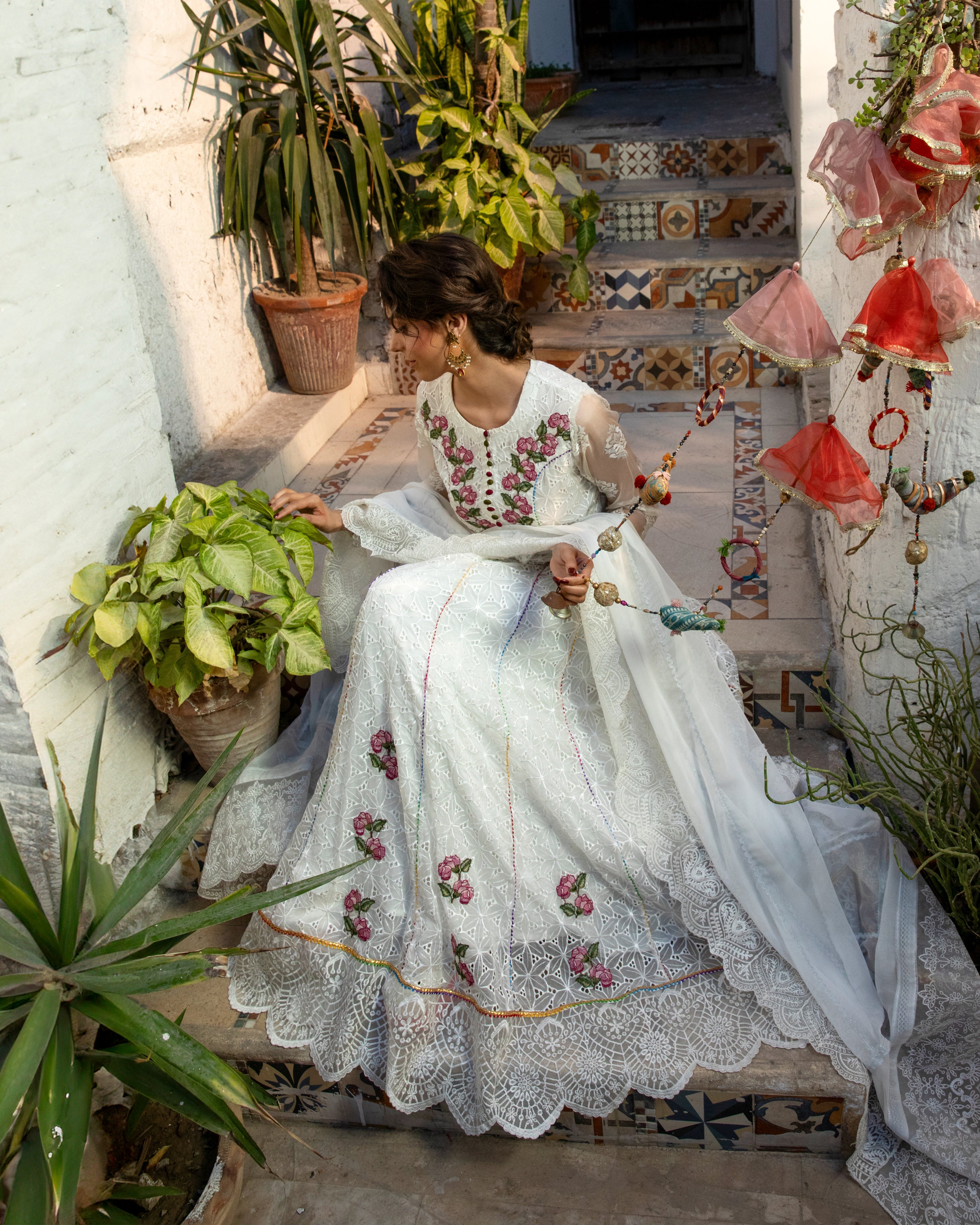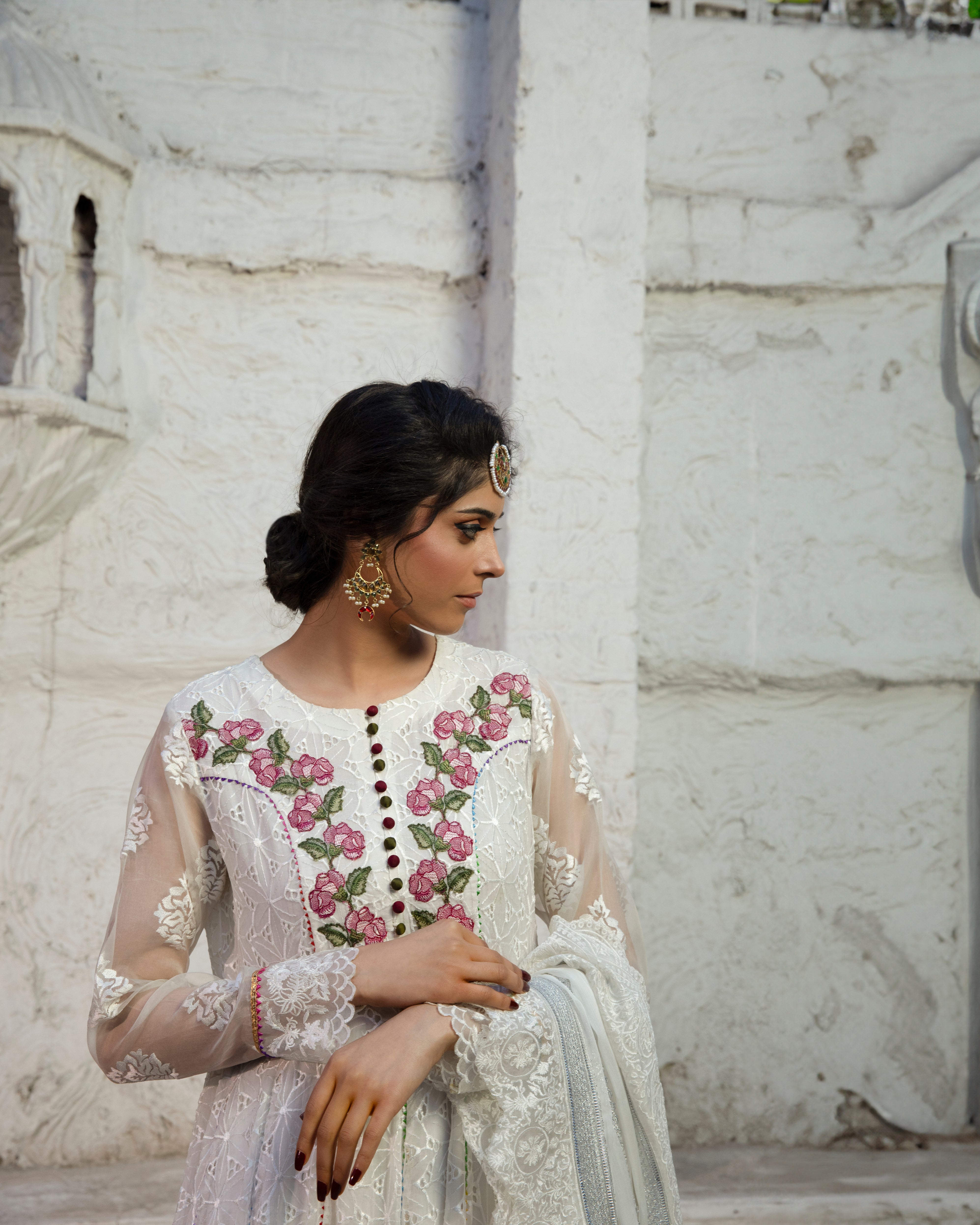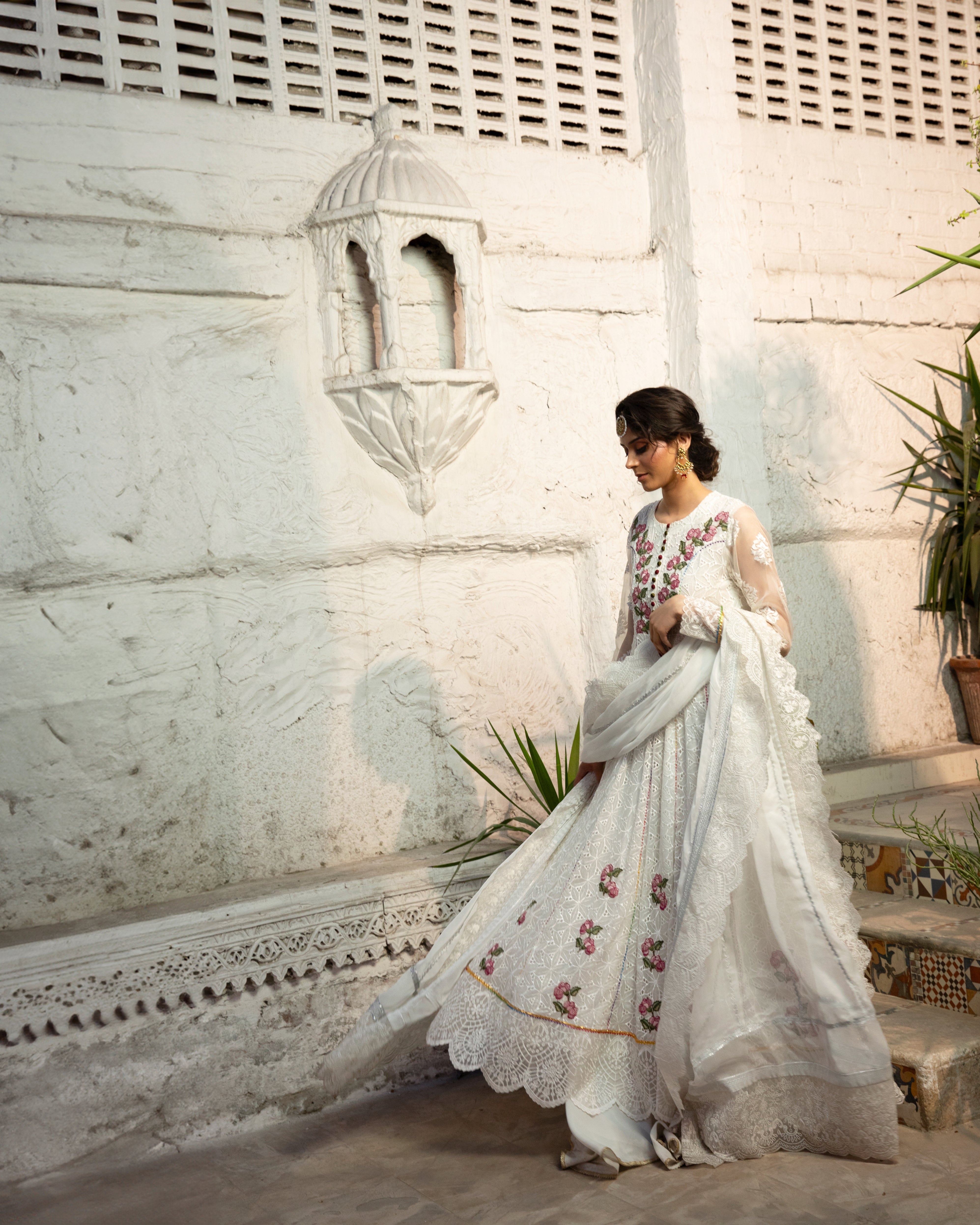 | This exquisite white frock, designed with graceful *kaliyaan* and a voluminous flair, exudes pure sophistication and charm. A perfect blend of tradition and modern grace