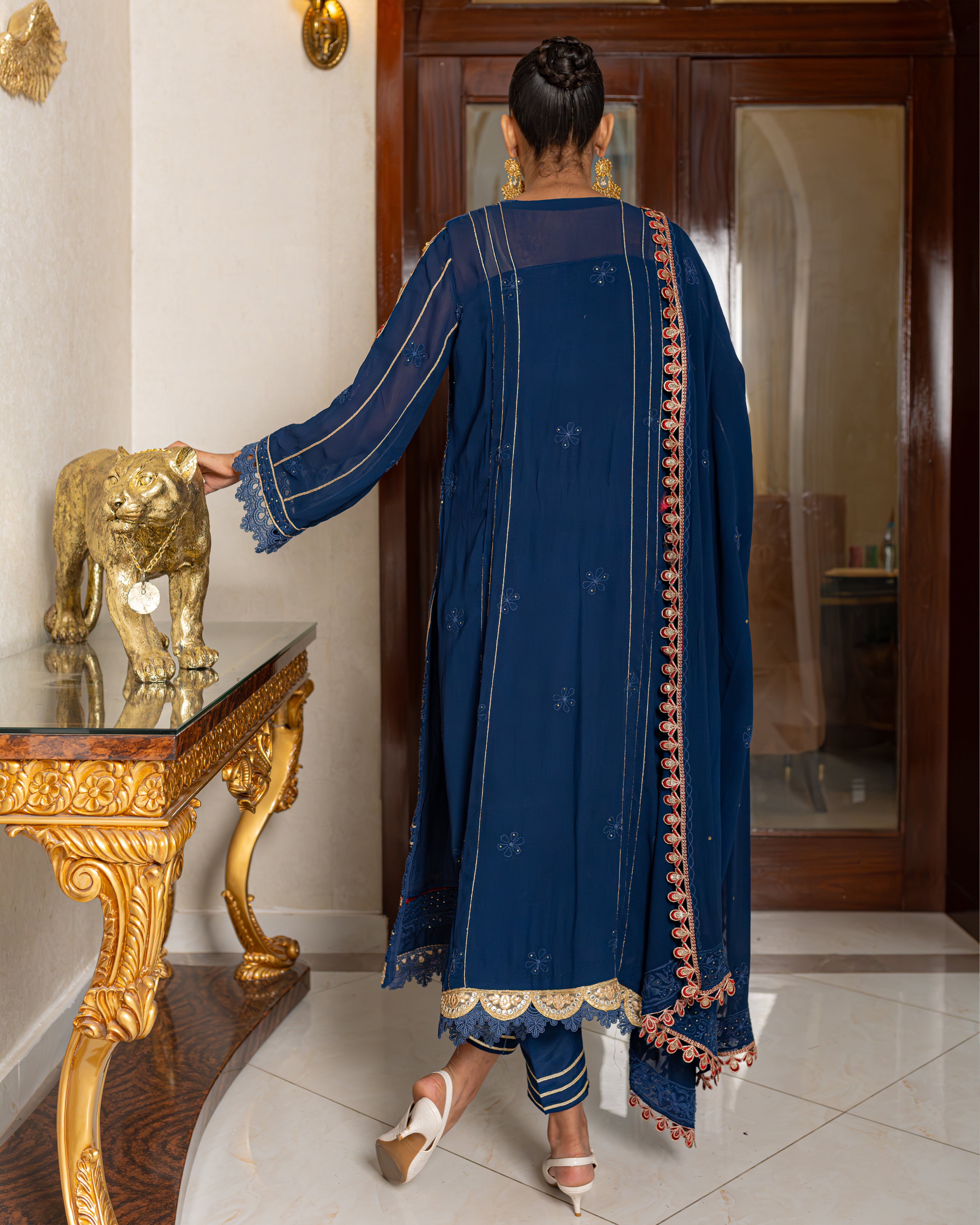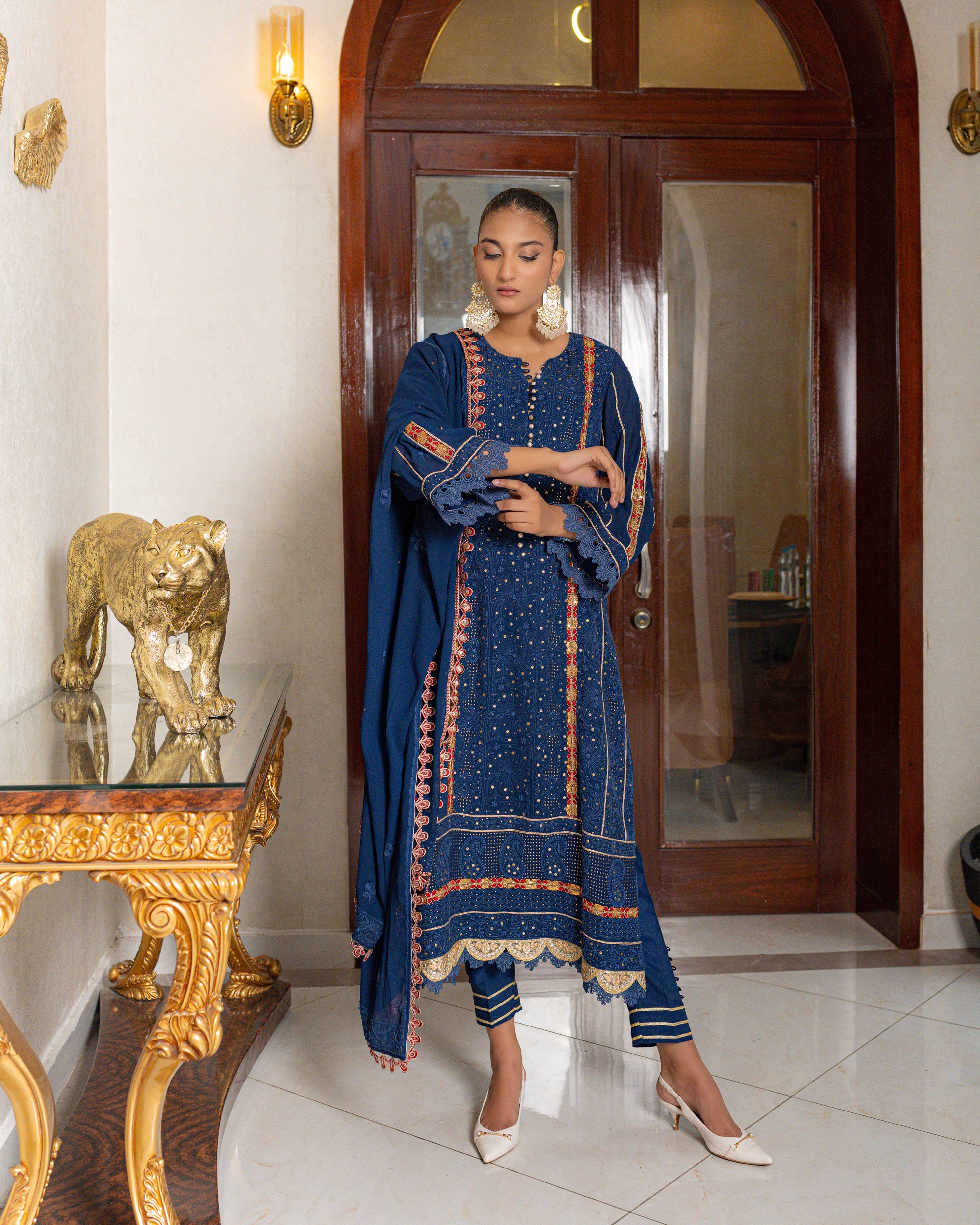 This exquisite *Chikan Kari* suit in *Shafoon* fabric is a perfect blend of traditional artistry and modern elegance. Featuring intricate *Makesh* work, the design brings a refined touch to any occasion. While the default color is a serene shade, it can be fully customized to suit your personal style. Ideal for those who appreciate craftsmanship and luxury, this suit is a timeless addition to your wardrobe.