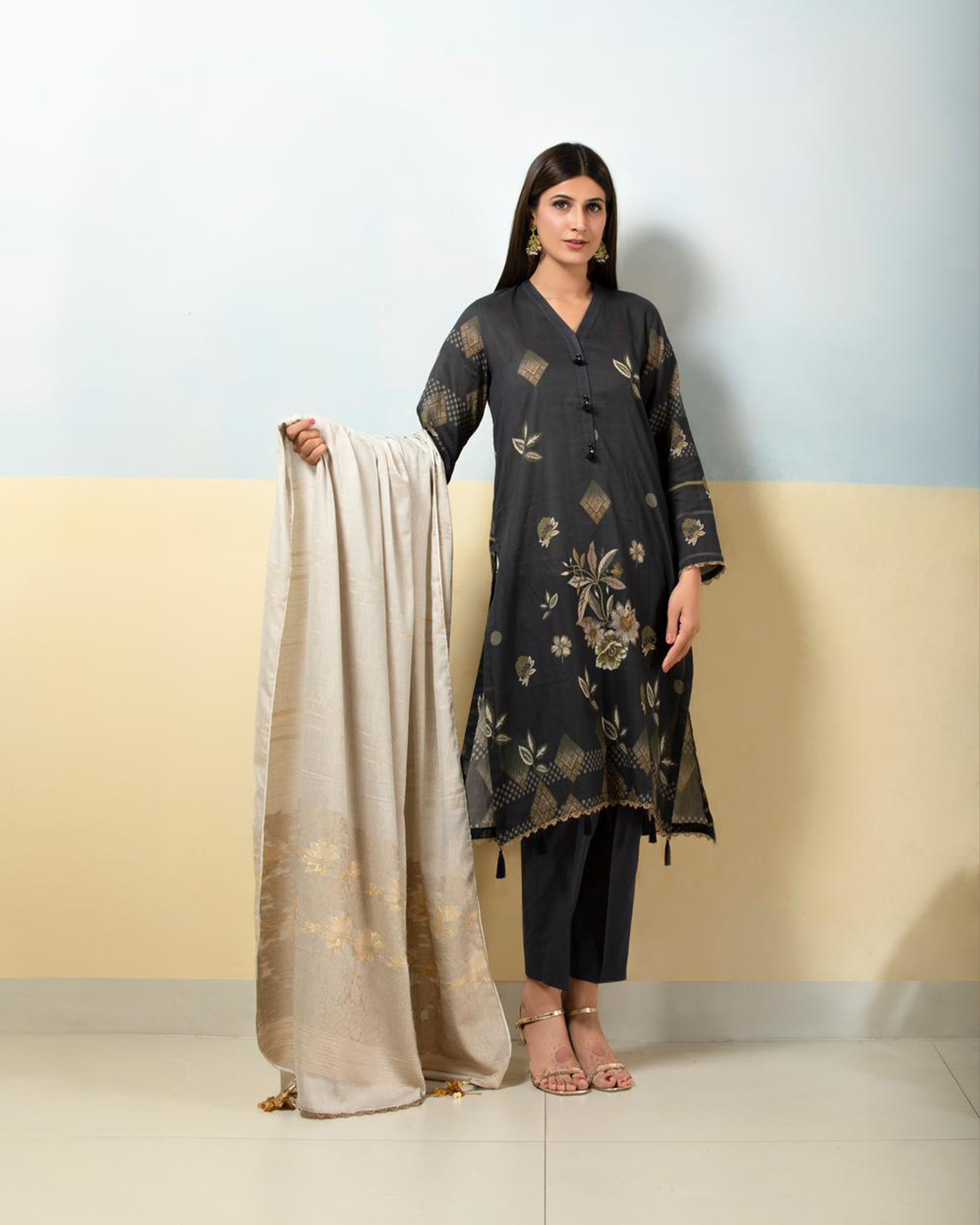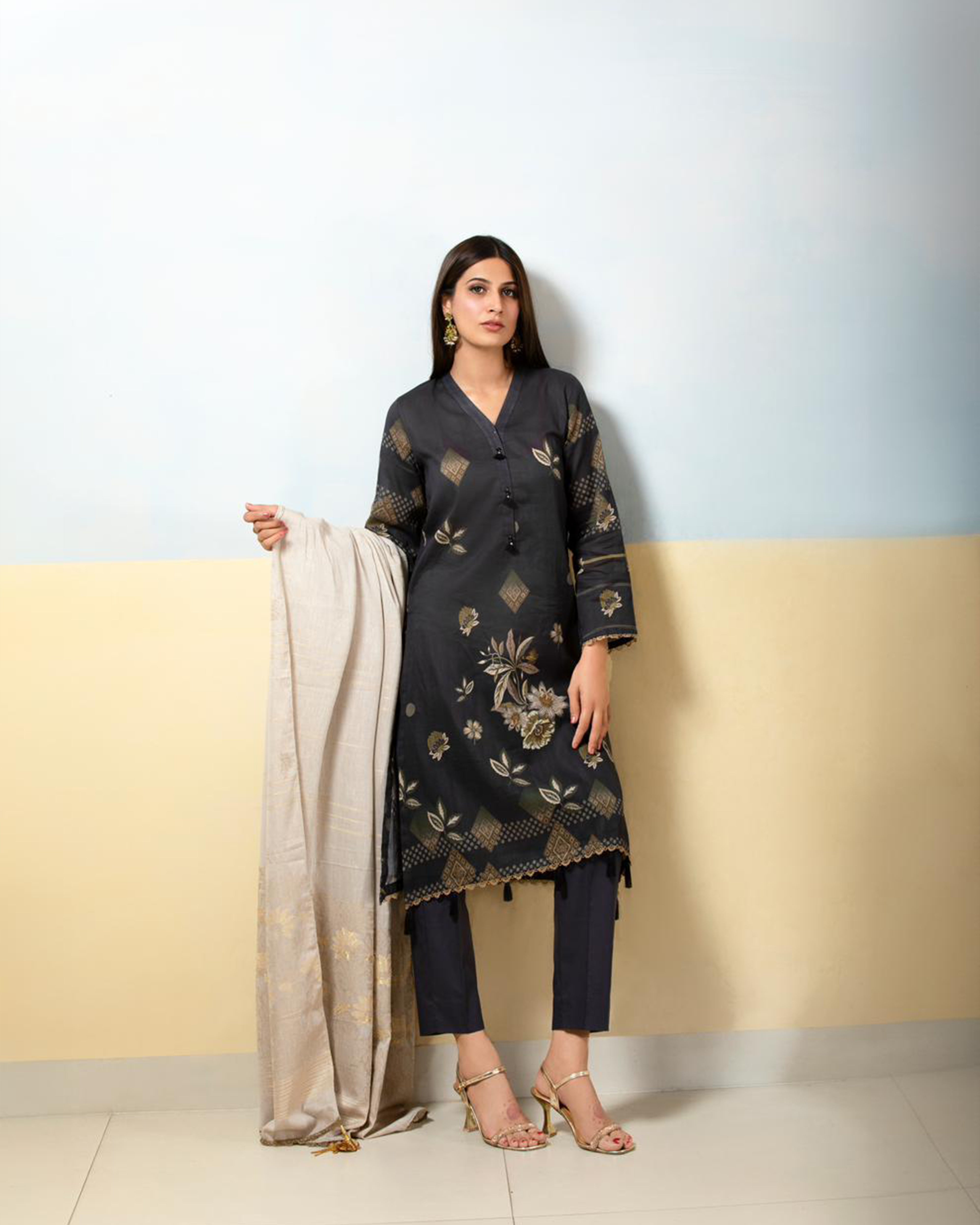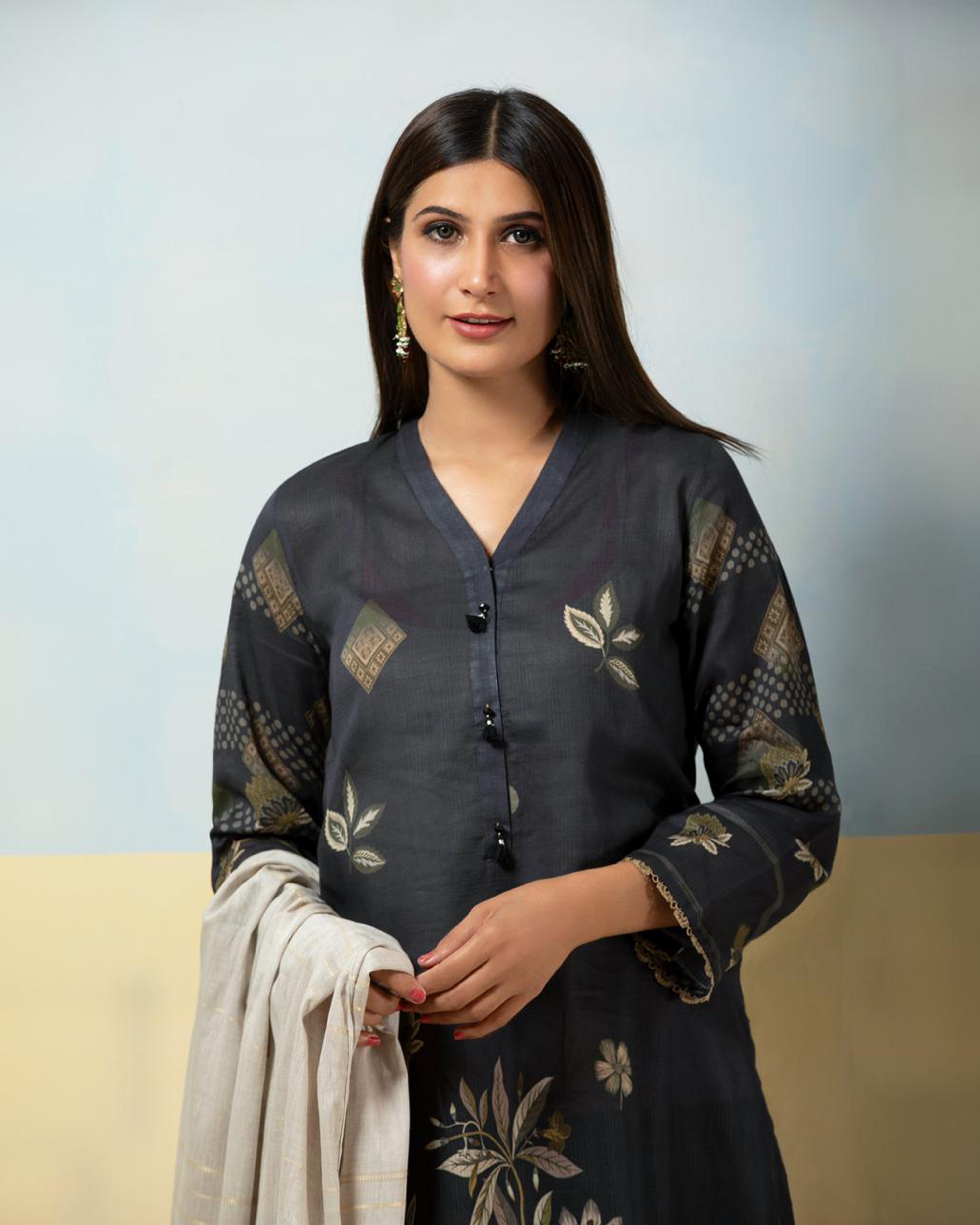 Bask in the warmth of effortless beauty with Arzoo, a stunning 3-piece lawn ensemble in a radiant Blackish hue. Adorned with delicate prints that echo the spirit of summer, this suit brings a soft, refreshing charm to your wardrobe. The neckline is tastefully detailed with fine lace at the center, adding a graceful touch of femininity to the design.