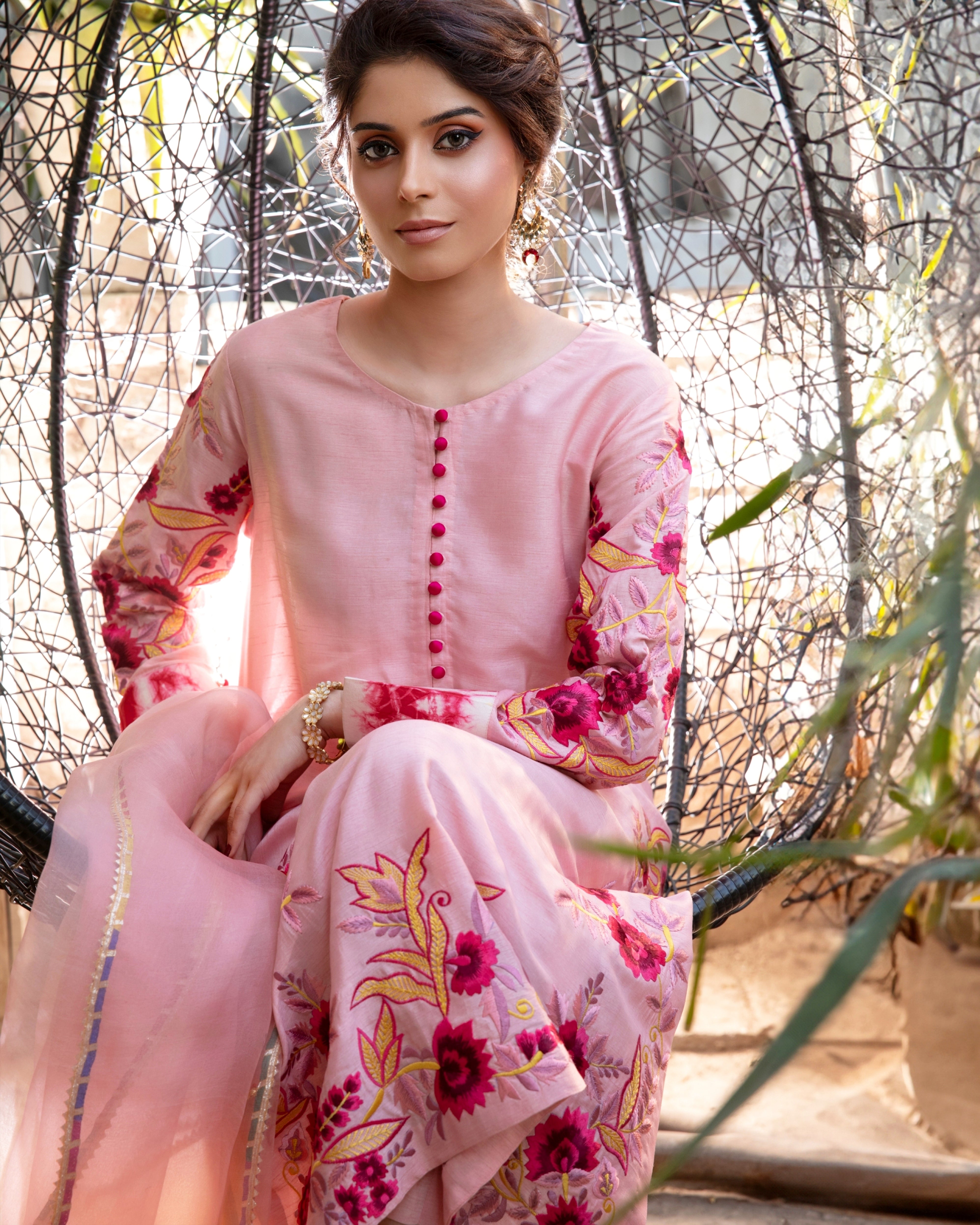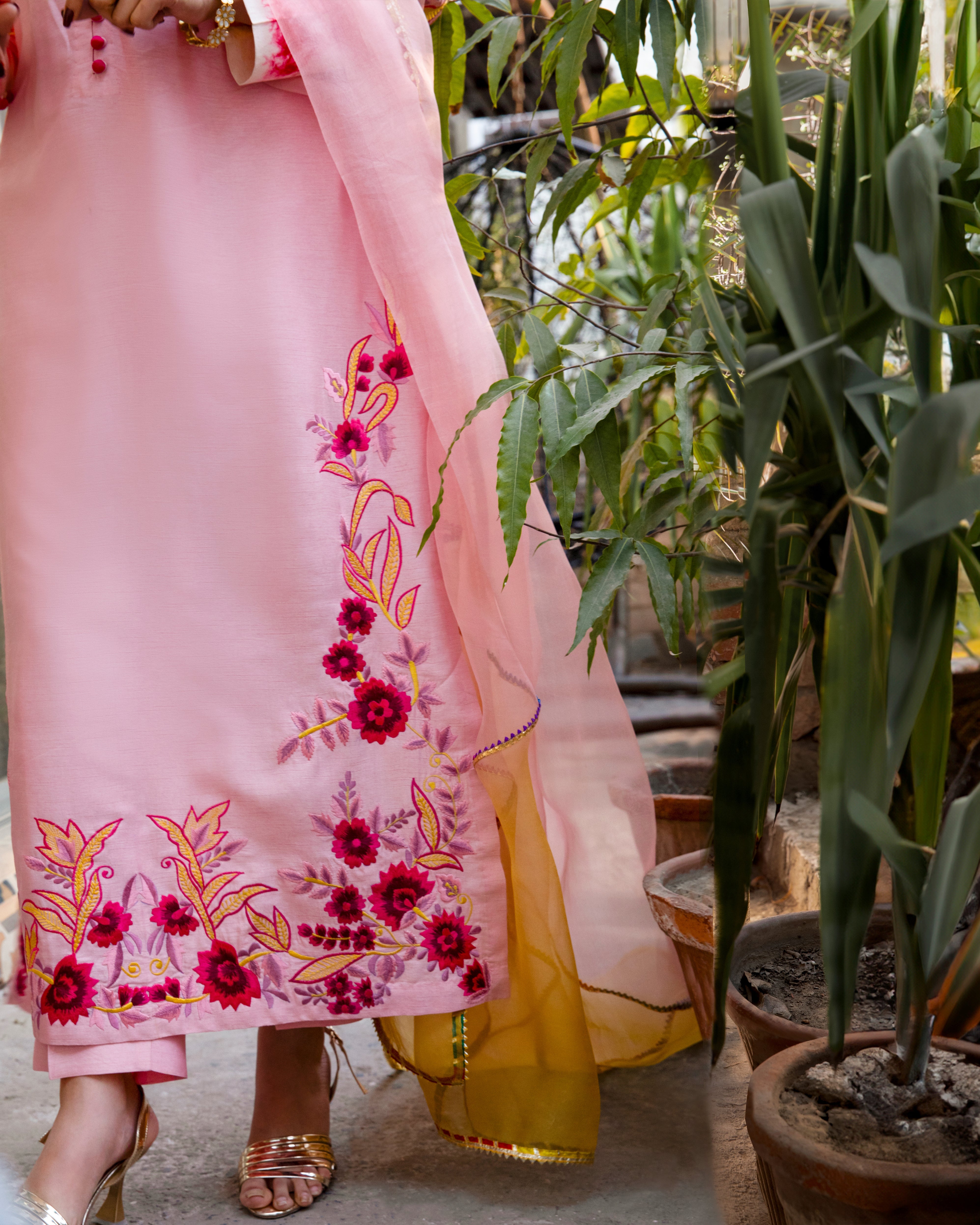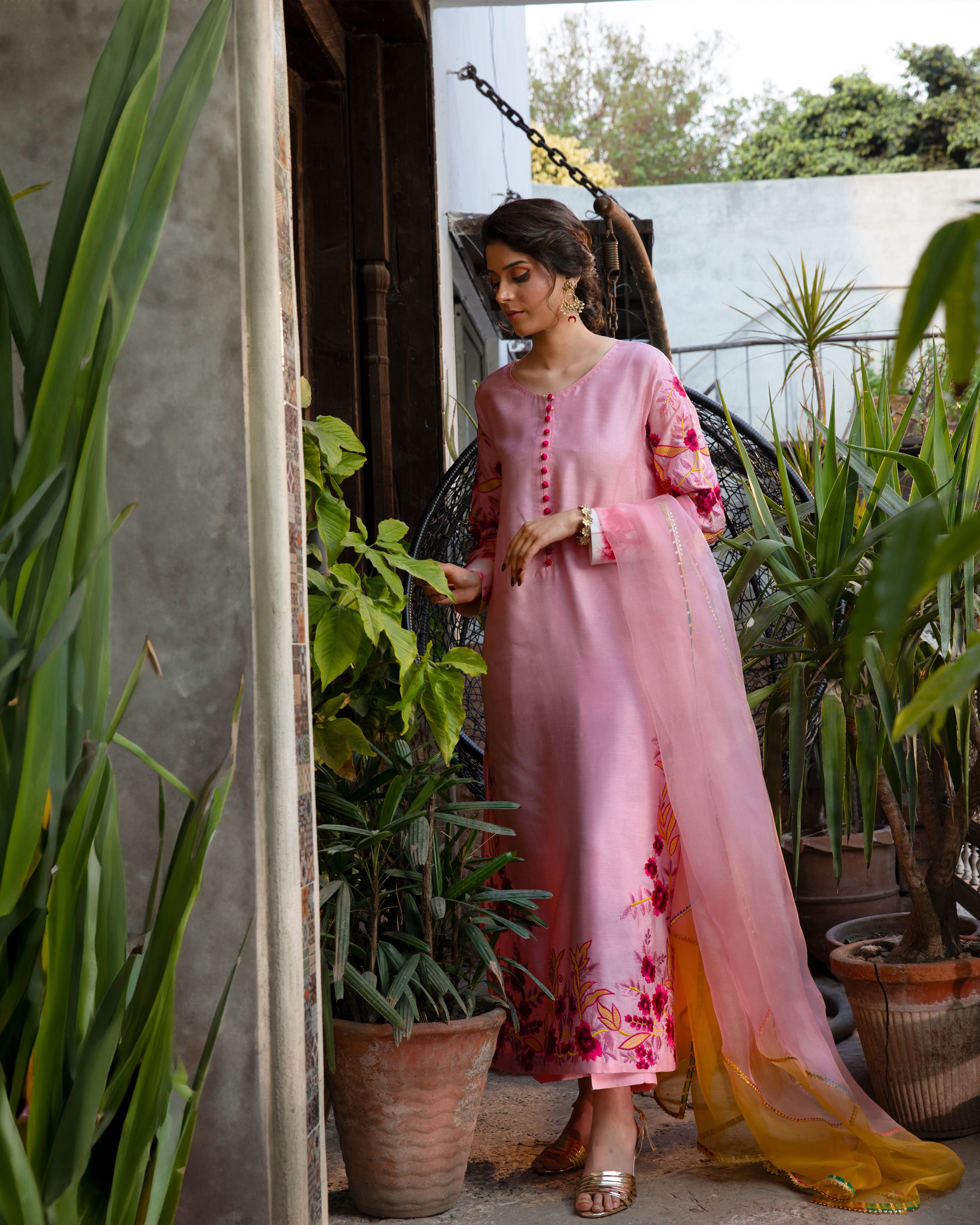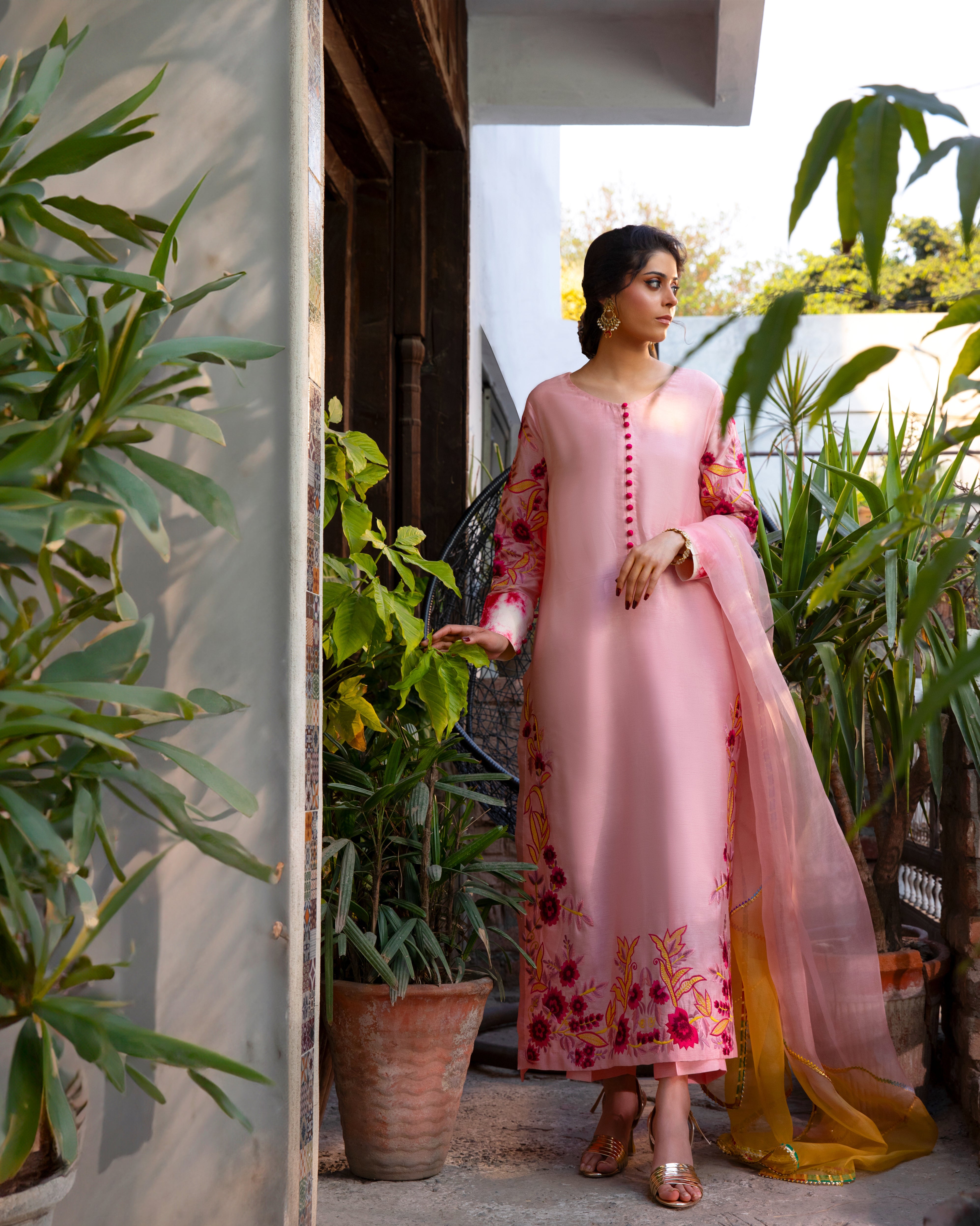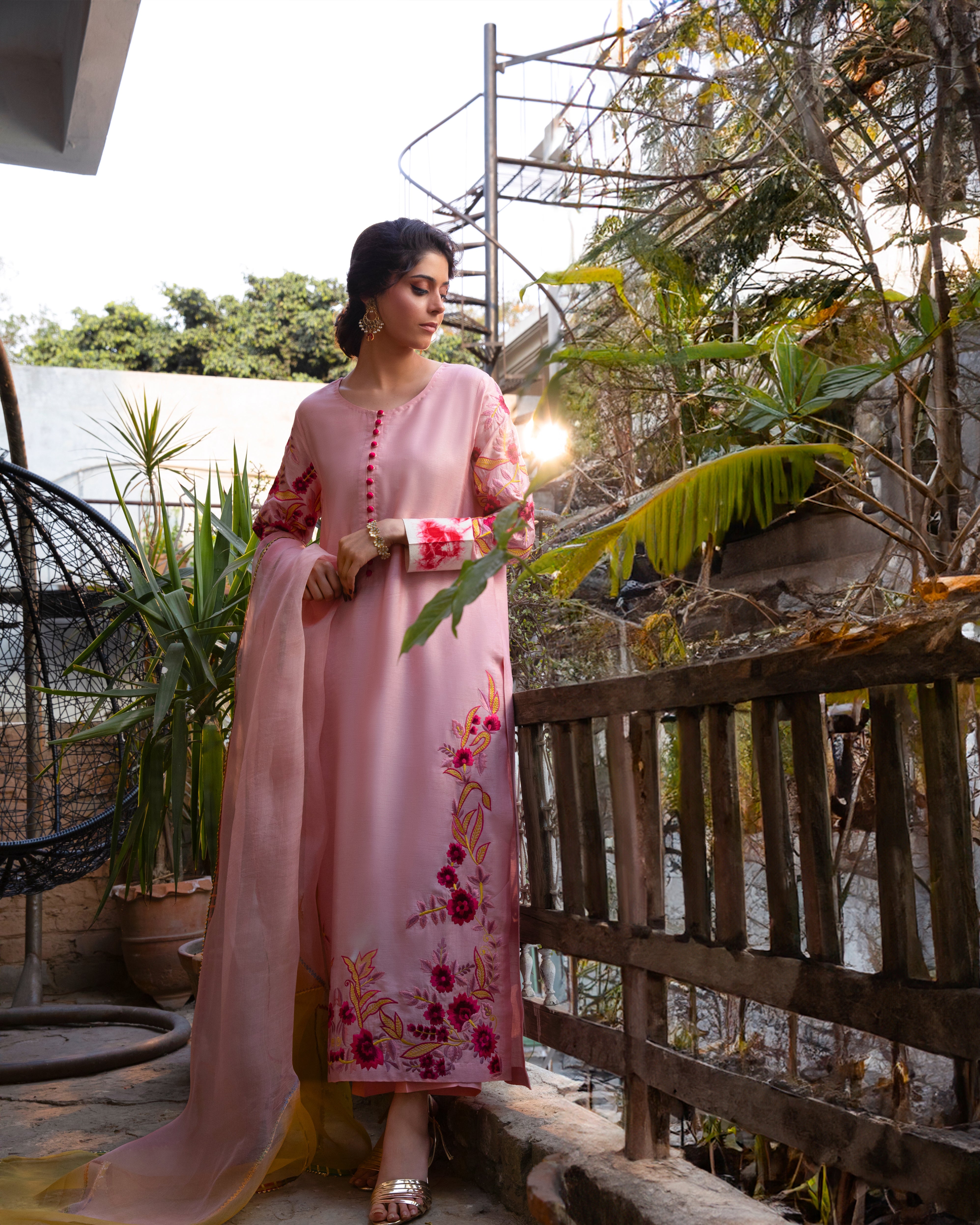 This exquisite dress showcases a beautiful Korean fabric, intricately embroidered with vibrant colors to elevate its elegance. The dress boasts a stunning pink hue, perfect for making a statement at casual and special occasions alike. It comes with a breathtaking organza dupatta, artistically designed with complementary hues to complete a stylish and sophisticated look.dsfd