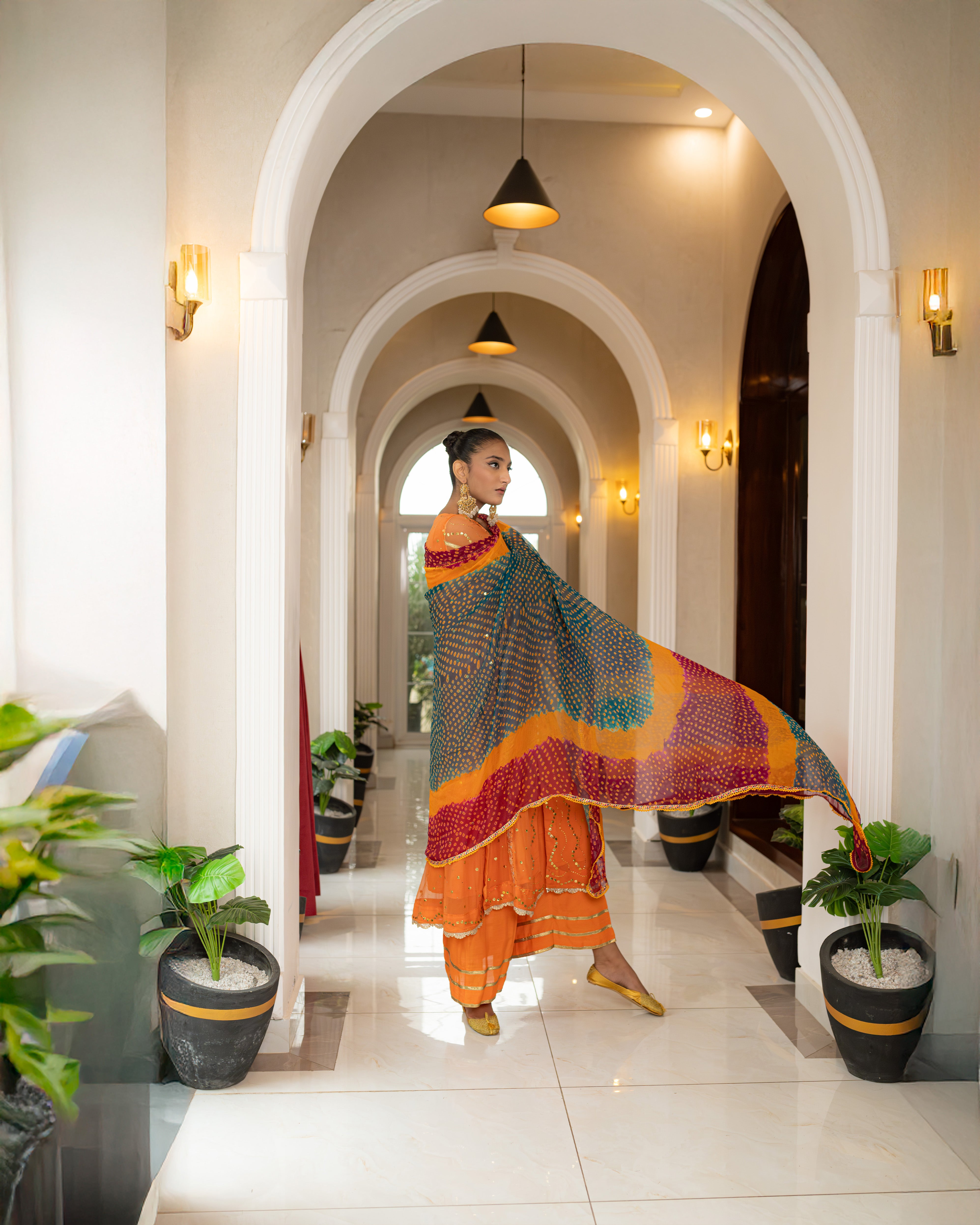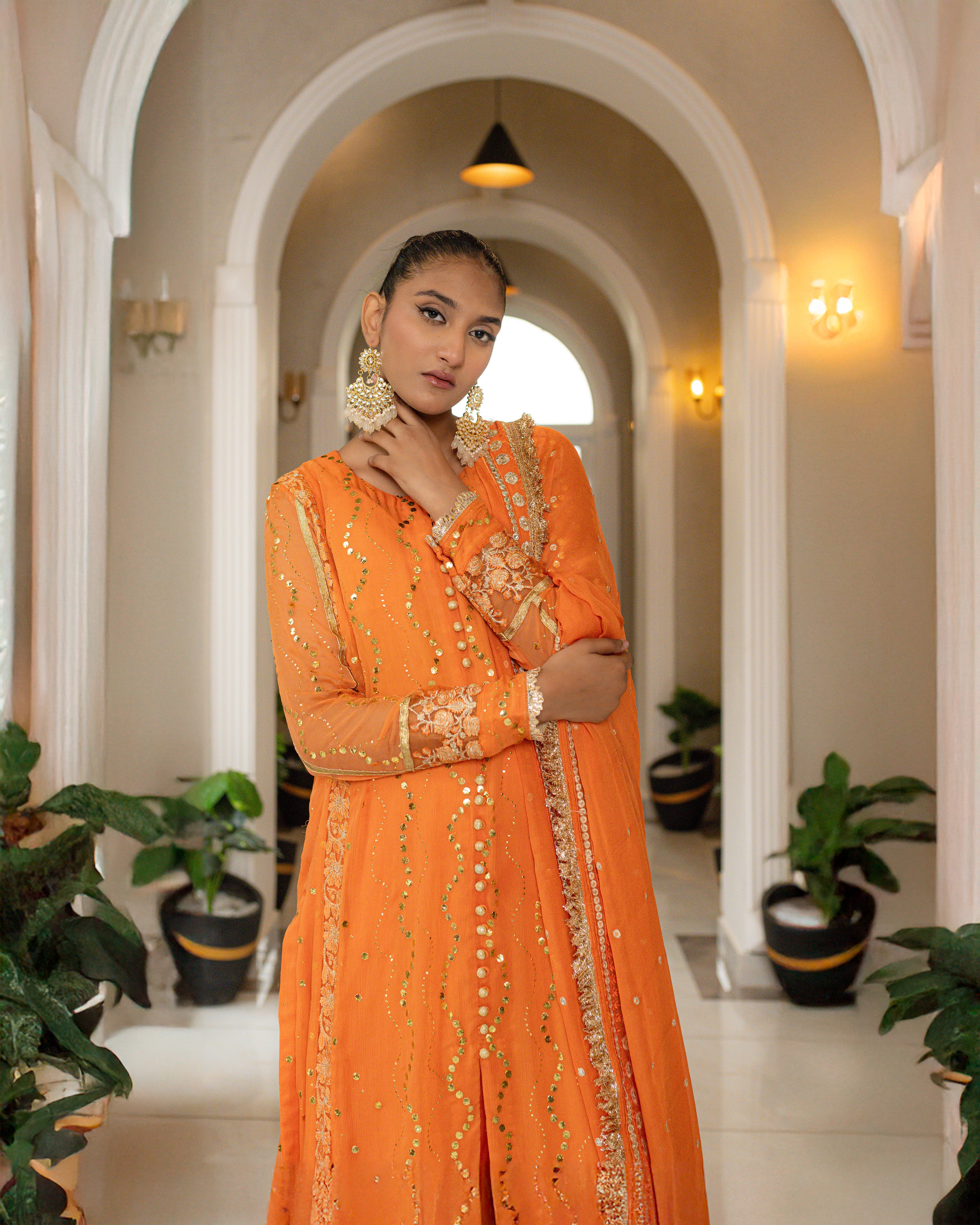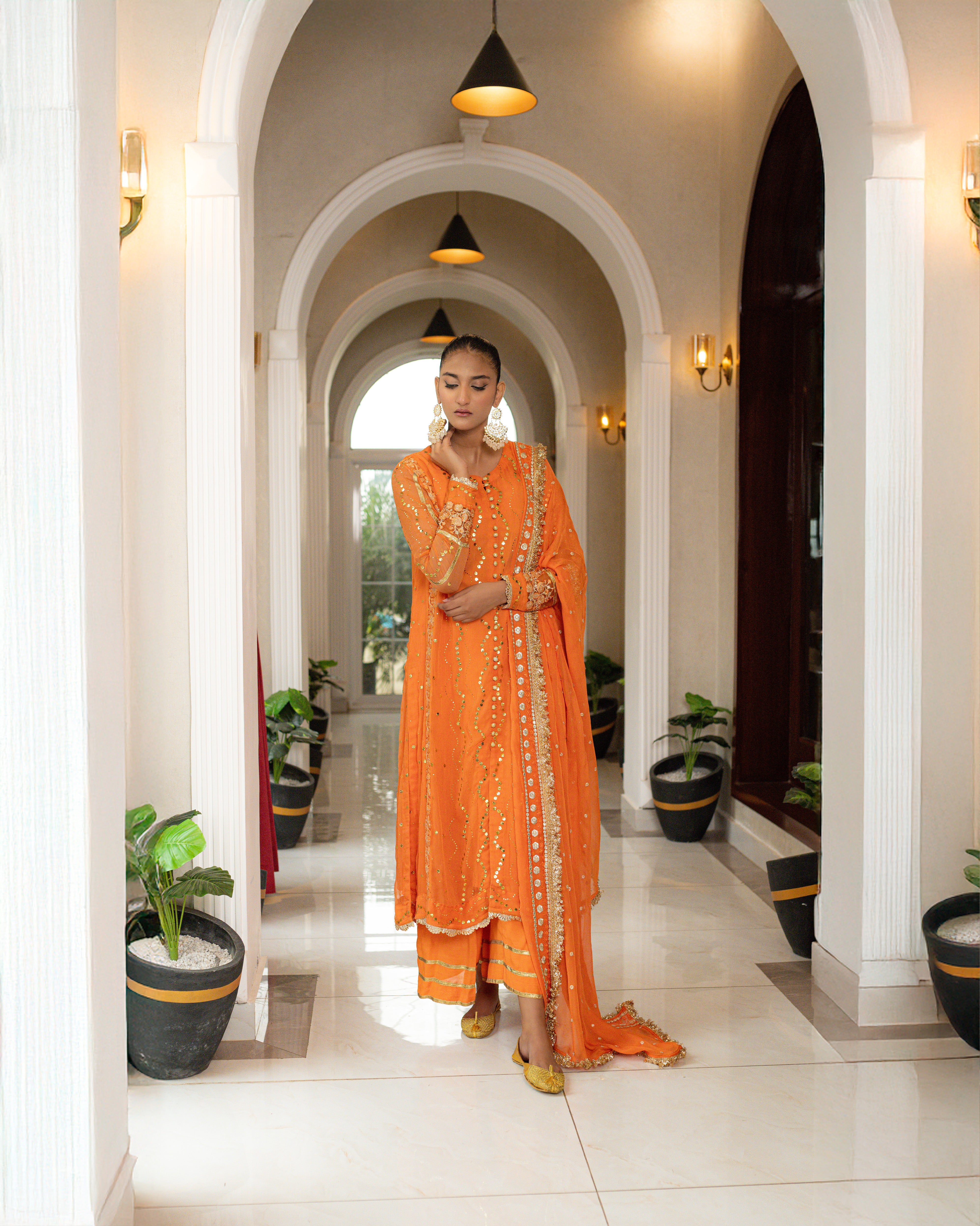 This suit features a luxurious *Shafoon* fabric with intricate *Makesh* golden work with a chic button-down shirt design. The suit is available in a vibrant orange color, but the shade can be customized to your preference. The overall design is elegant, perfect for any occasion, and offers the flexibility to choose the color that suits your style.
