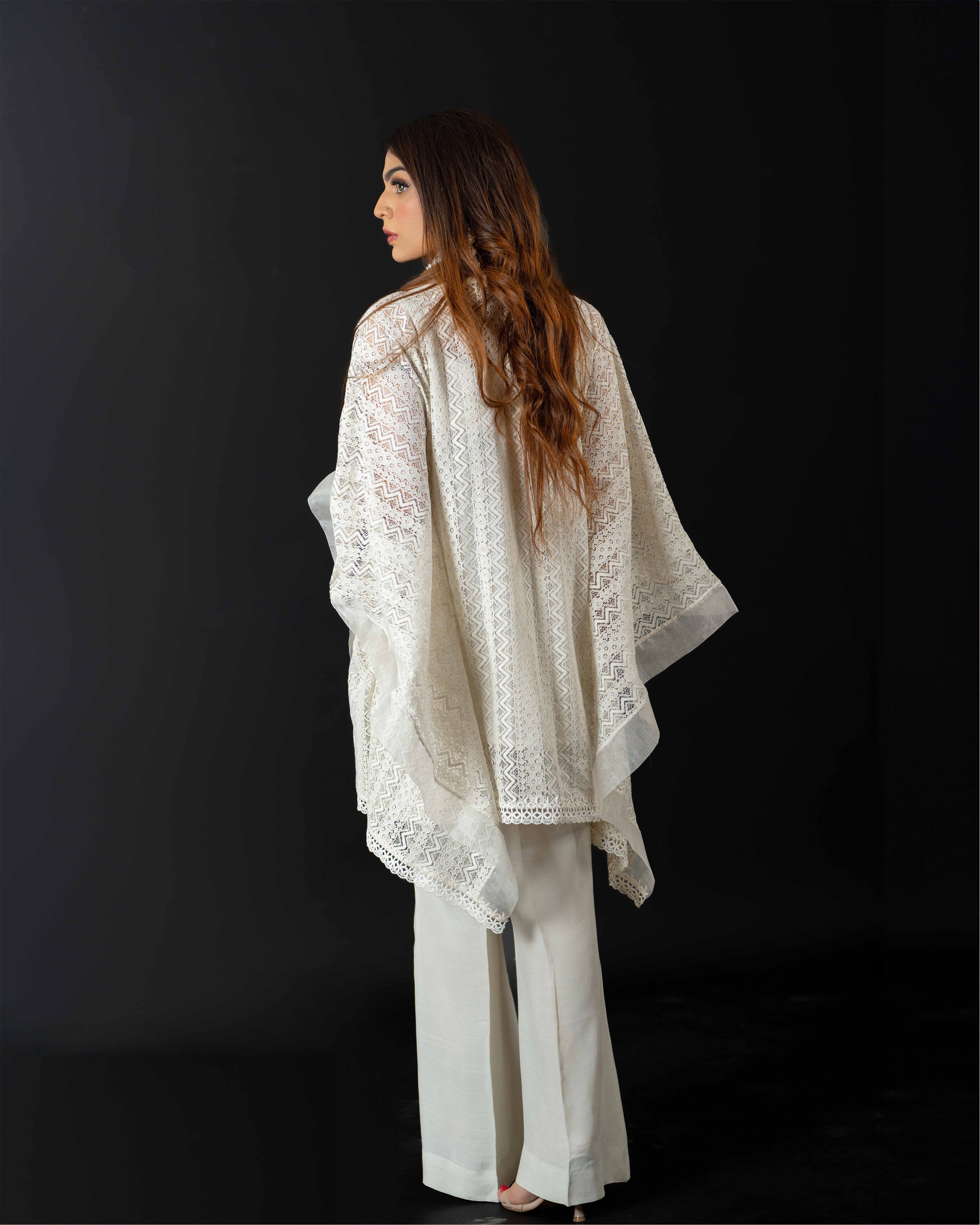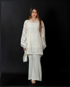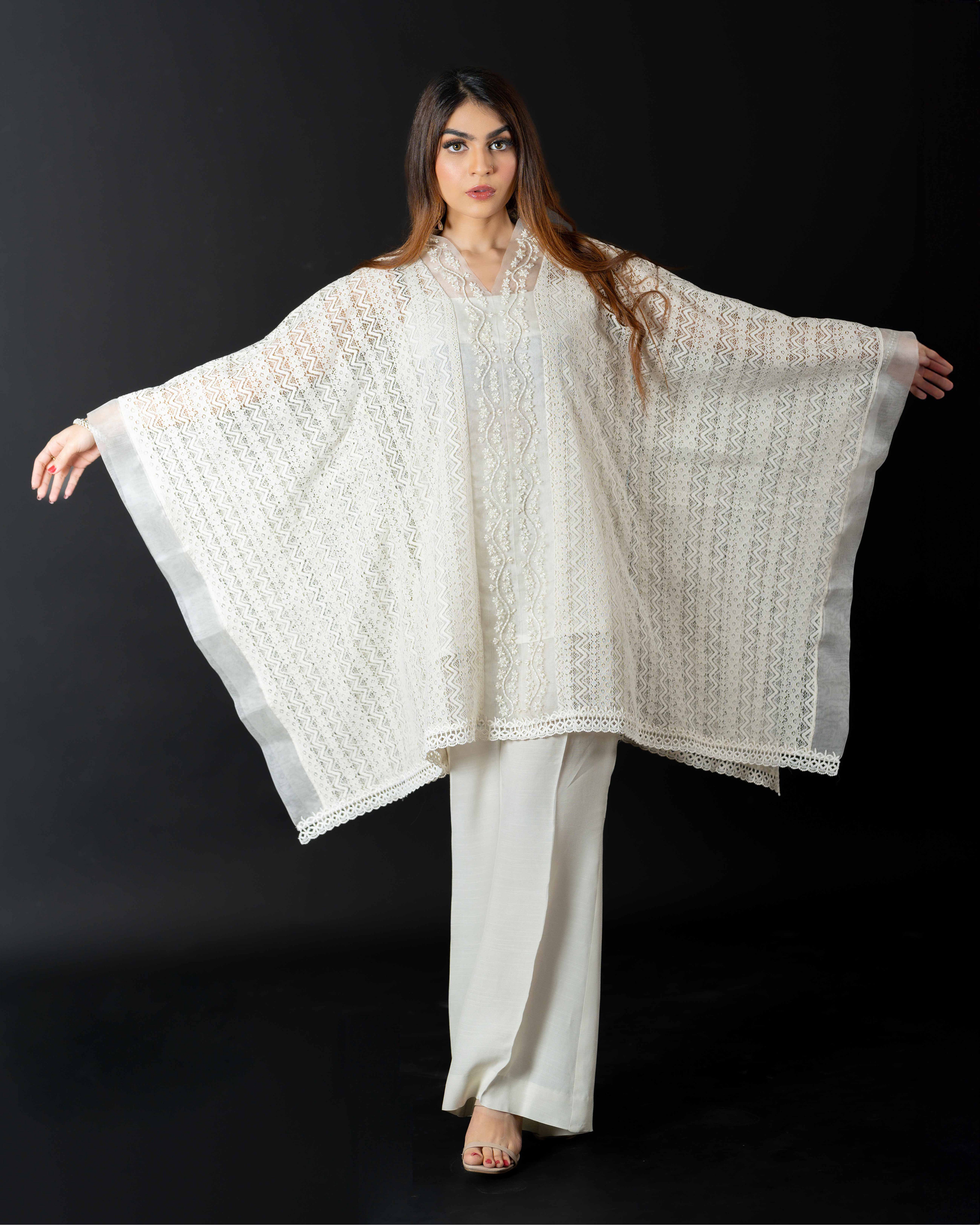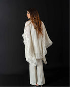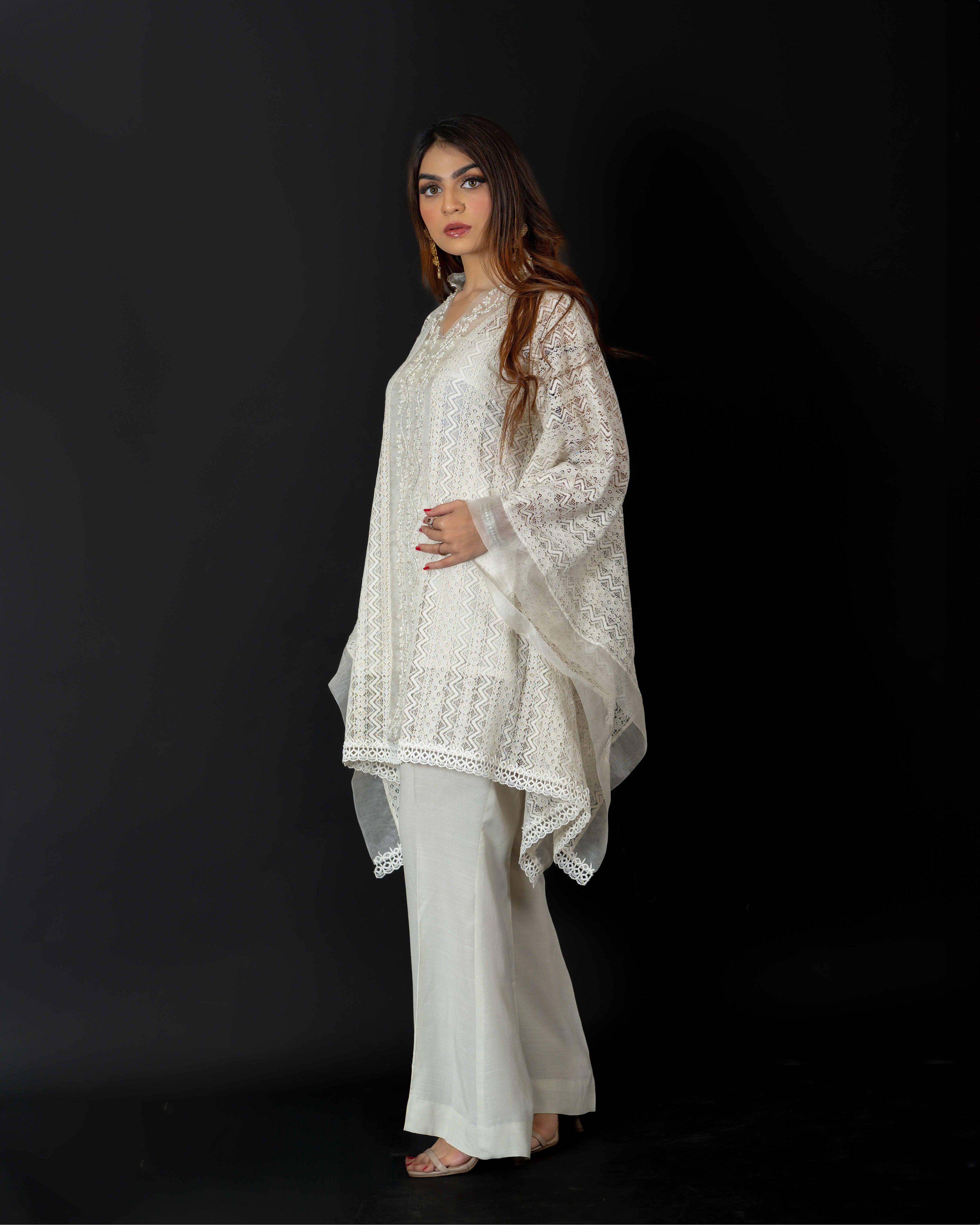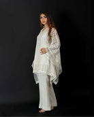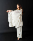 Embrace elegance with our resham net hand-embroidered kaftan cut shirt in a lovely milky hue. Perfectly paired with boot-cut trousers, this ensemble combines sophistication with effortless style.