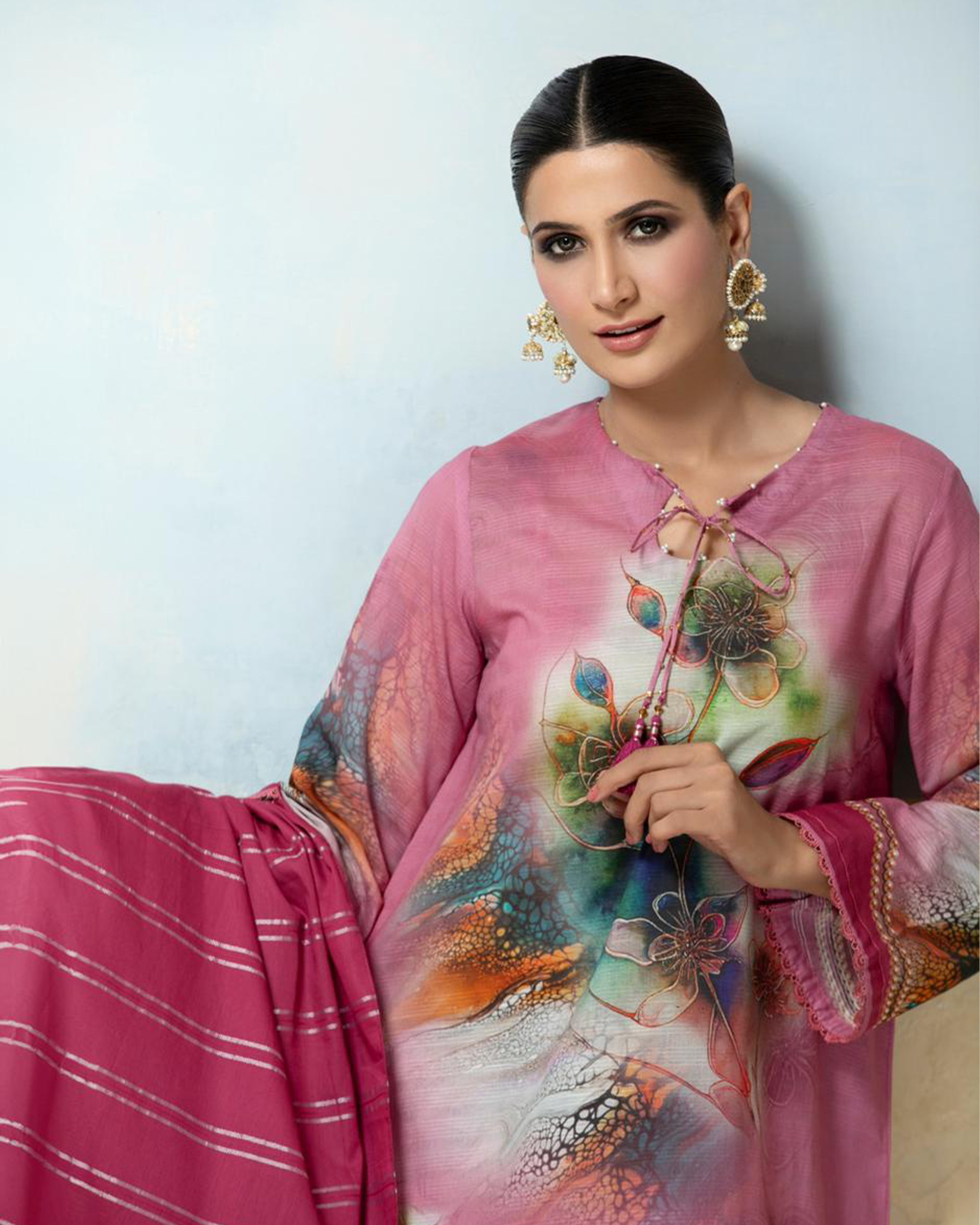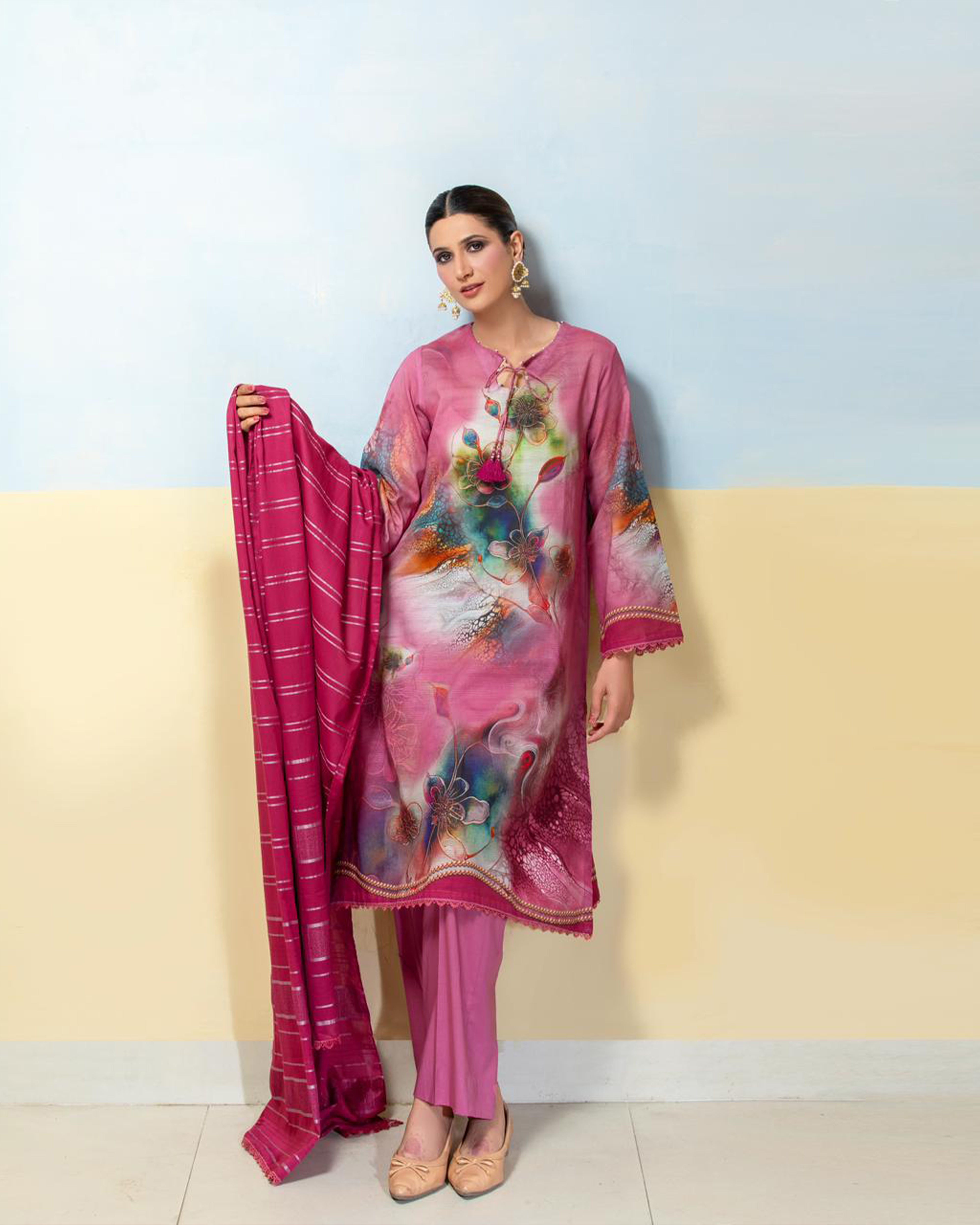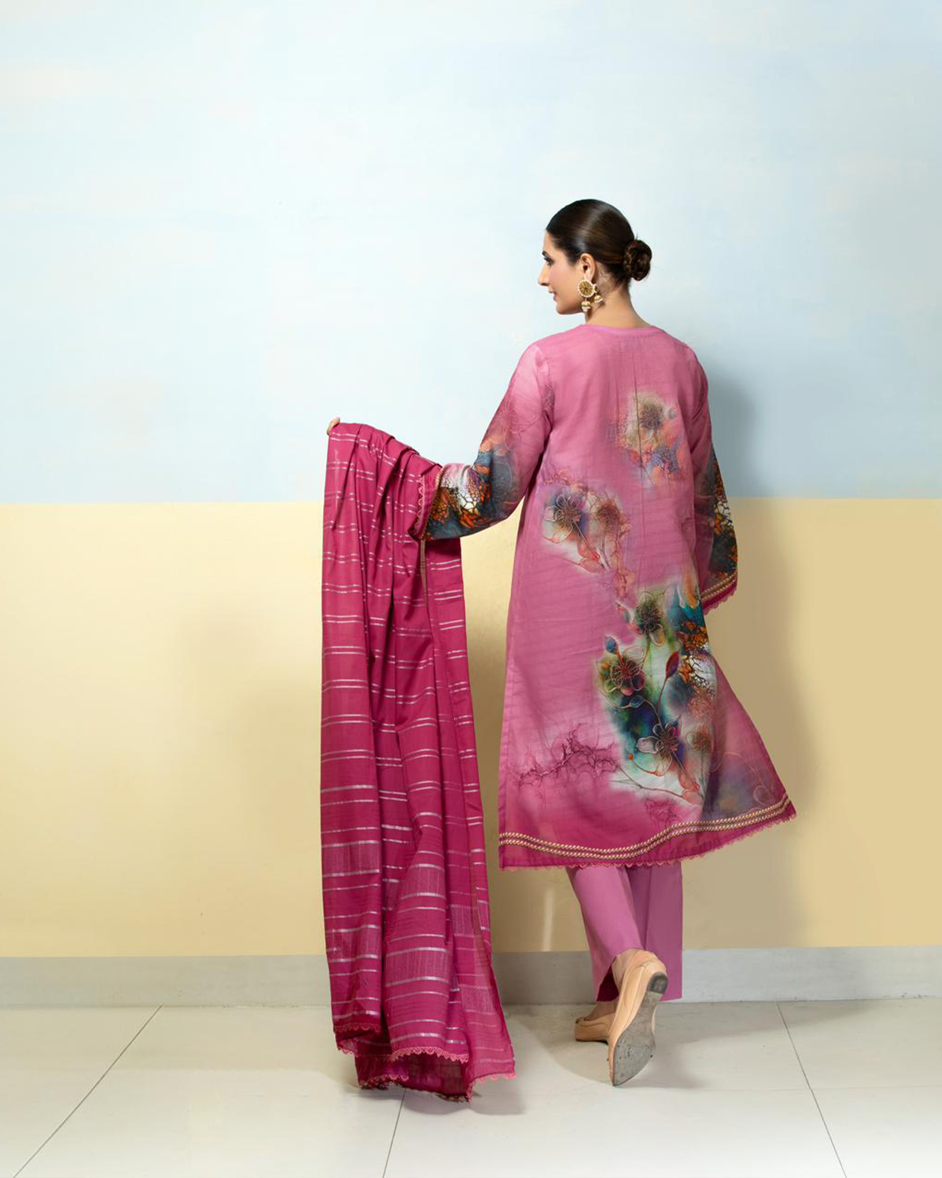 Unveil your feminine charm with Rosé Dusk, a 3-piece suit crafted from premium lawn in a soothing pink hue. The digitally printed design blooms with subtle elegance, offering a perfect balance of grace and comfort. Intricate lacework adorns the neckline and sleeves, adding a delicate touch of refinement to the ensemble.