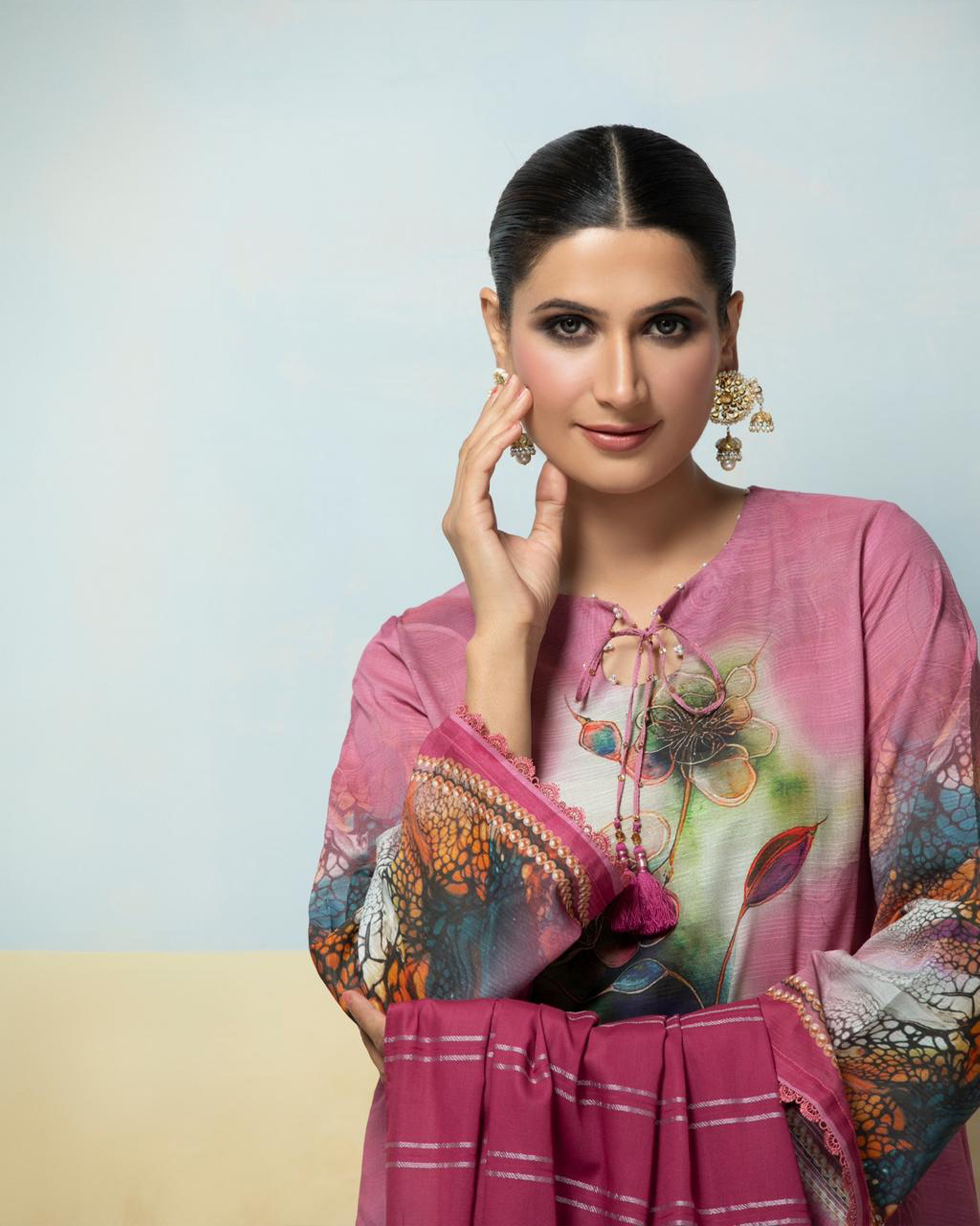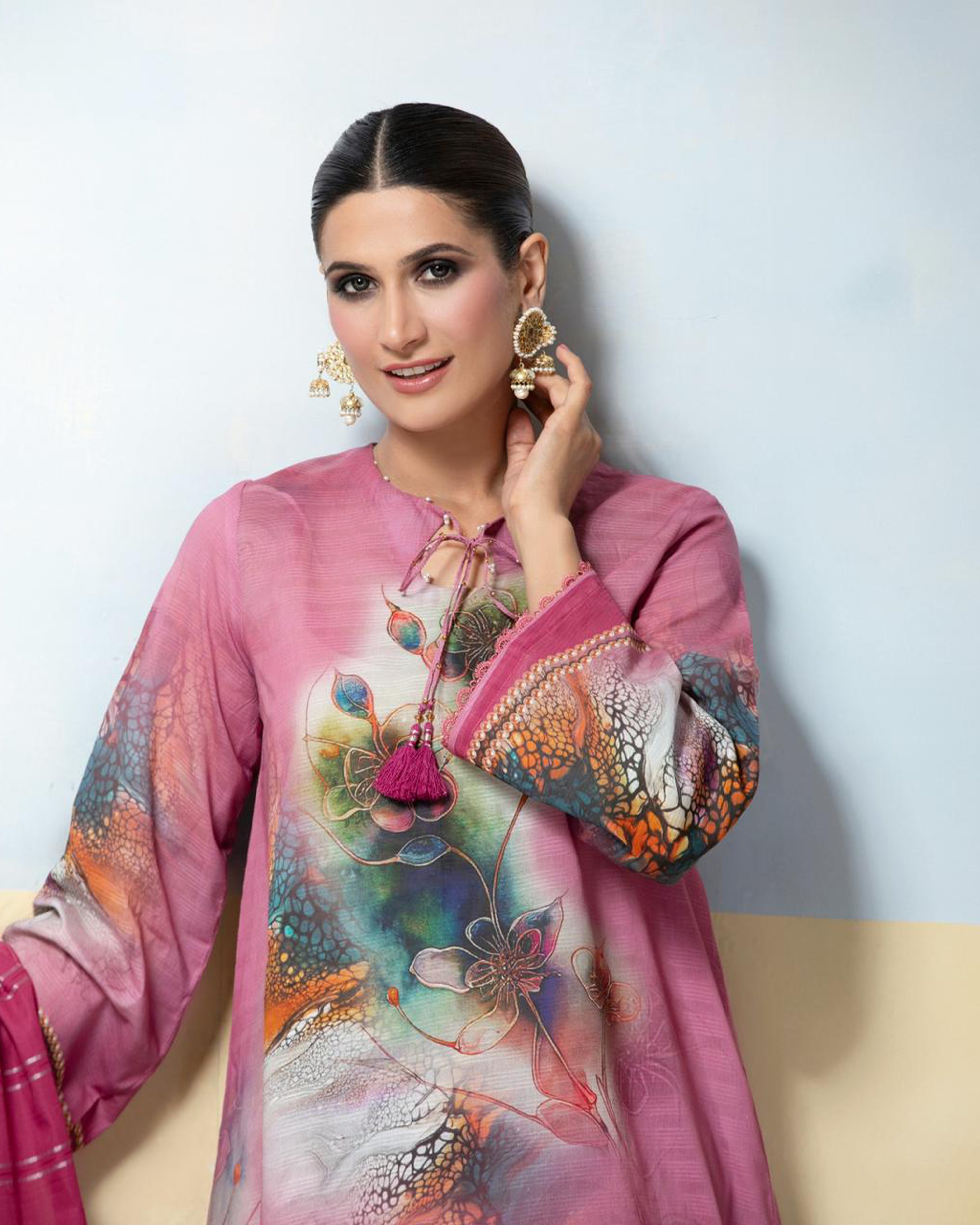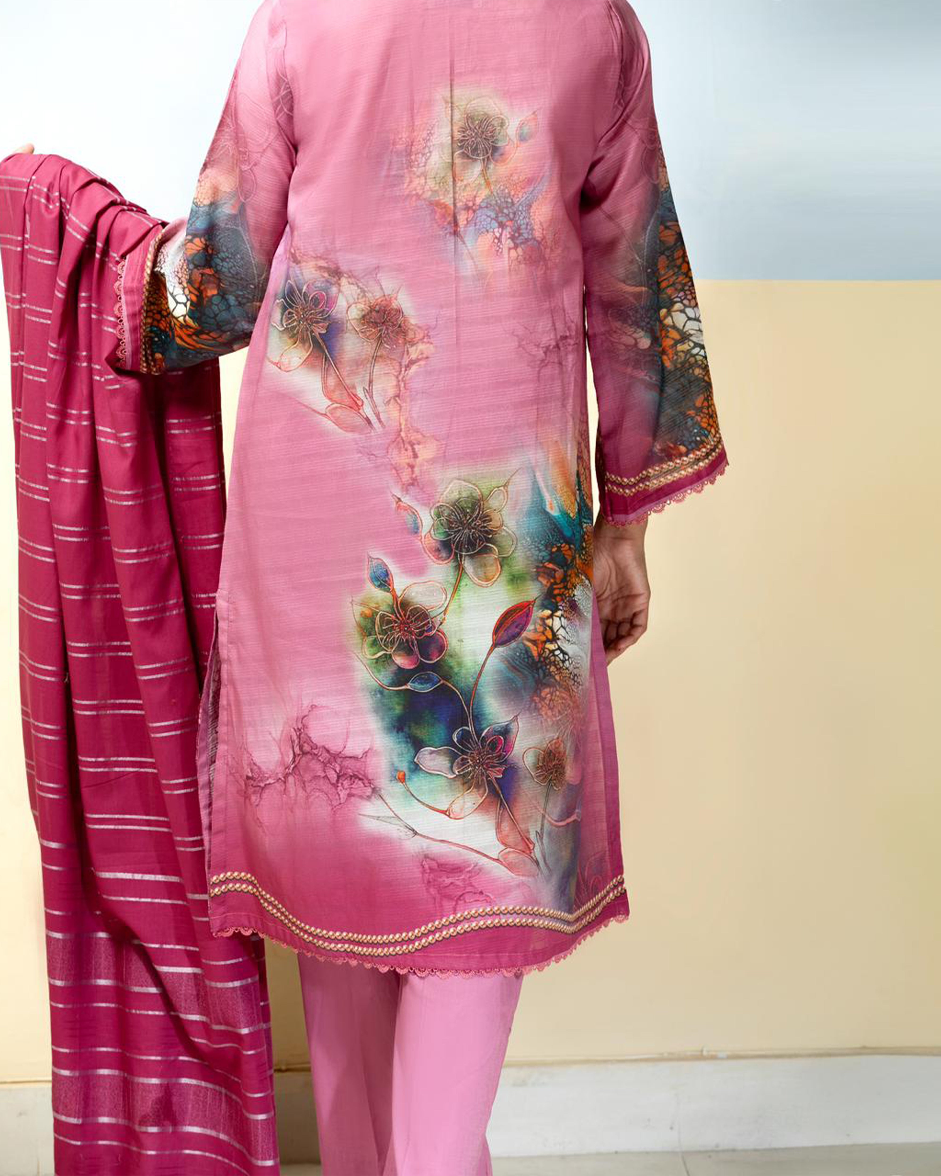 Unveil your feminine charm with Rosé Dusk, a 3-piece suit crafted from premium lawn in a soothing pink hue. The digitally printed design blooms with subtle elegance, offering a perfect balance of grace and comfort. Intricate lacework adorns the neckline and sleeves, adding a delicate touch of refinement to the ensemble.