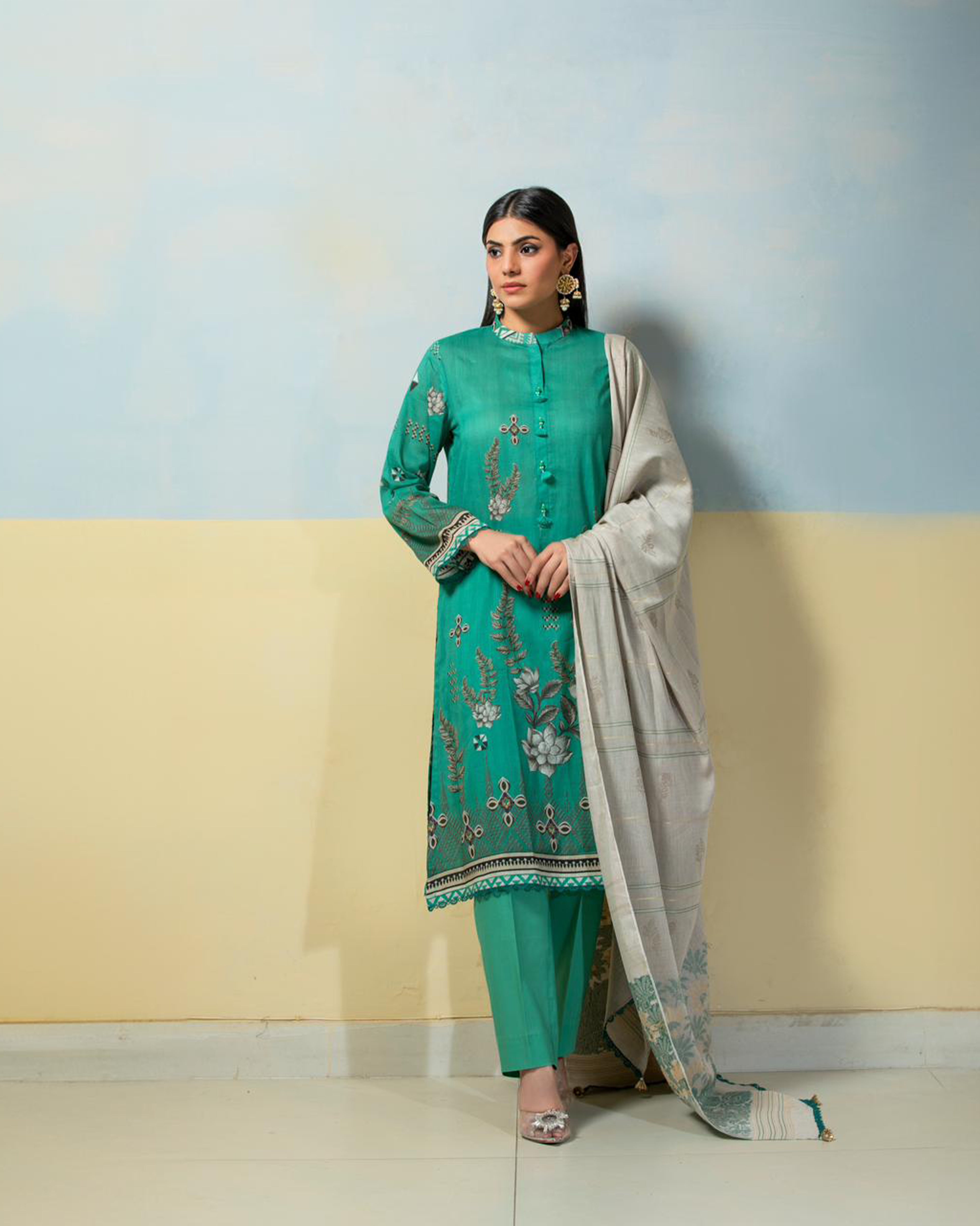 Radiate warmth and grace in Sibel, a beautifully crafted 3-piece ensemble made from luxurious Lawn. Drenched in a charming Greenish hue adorned with delicate prints, this suit celebrates sunshine and softness in every fold. The neckline is elevated with a refined lace detail placed at the center, adding a subtle touch of femininity and texture to the design.