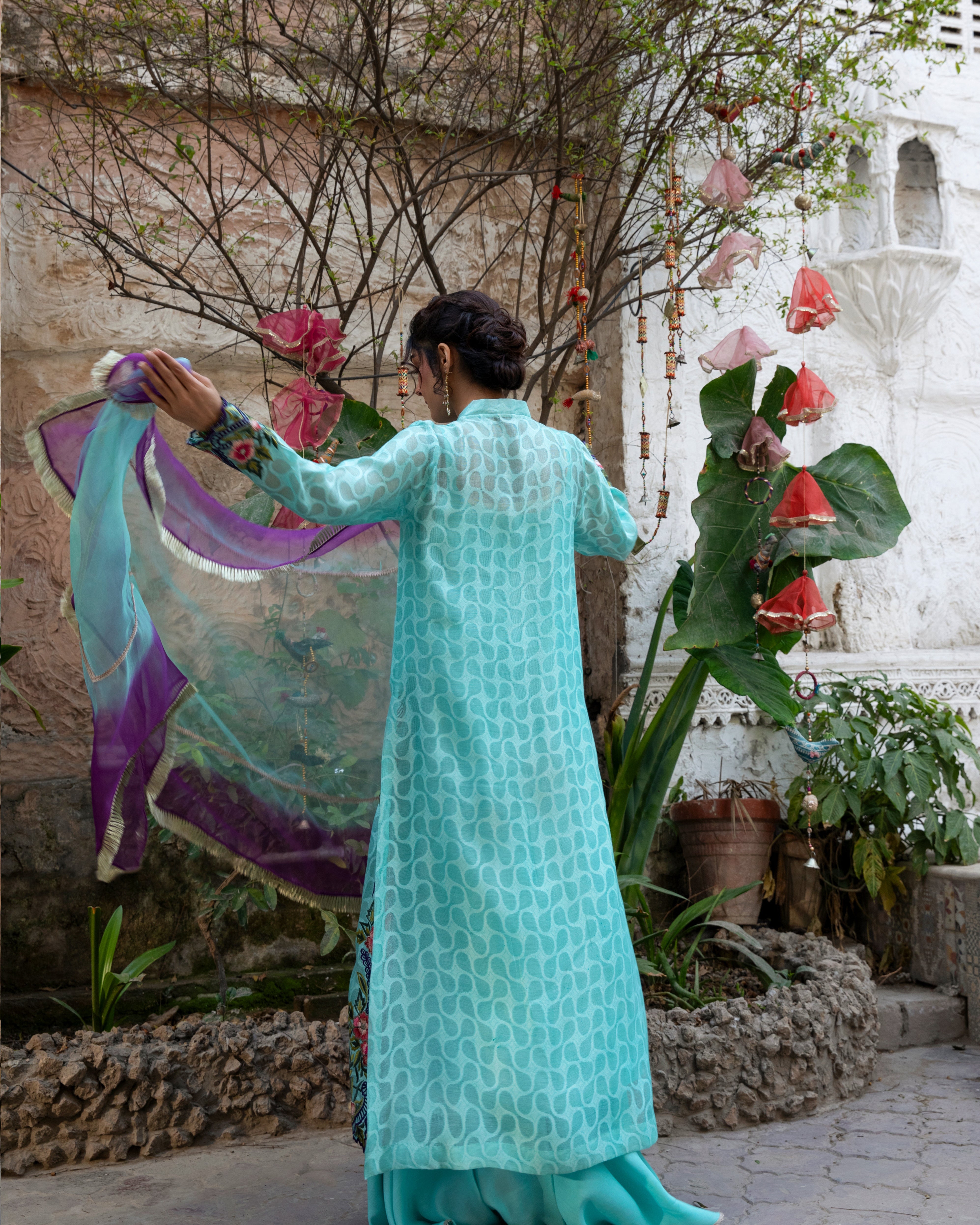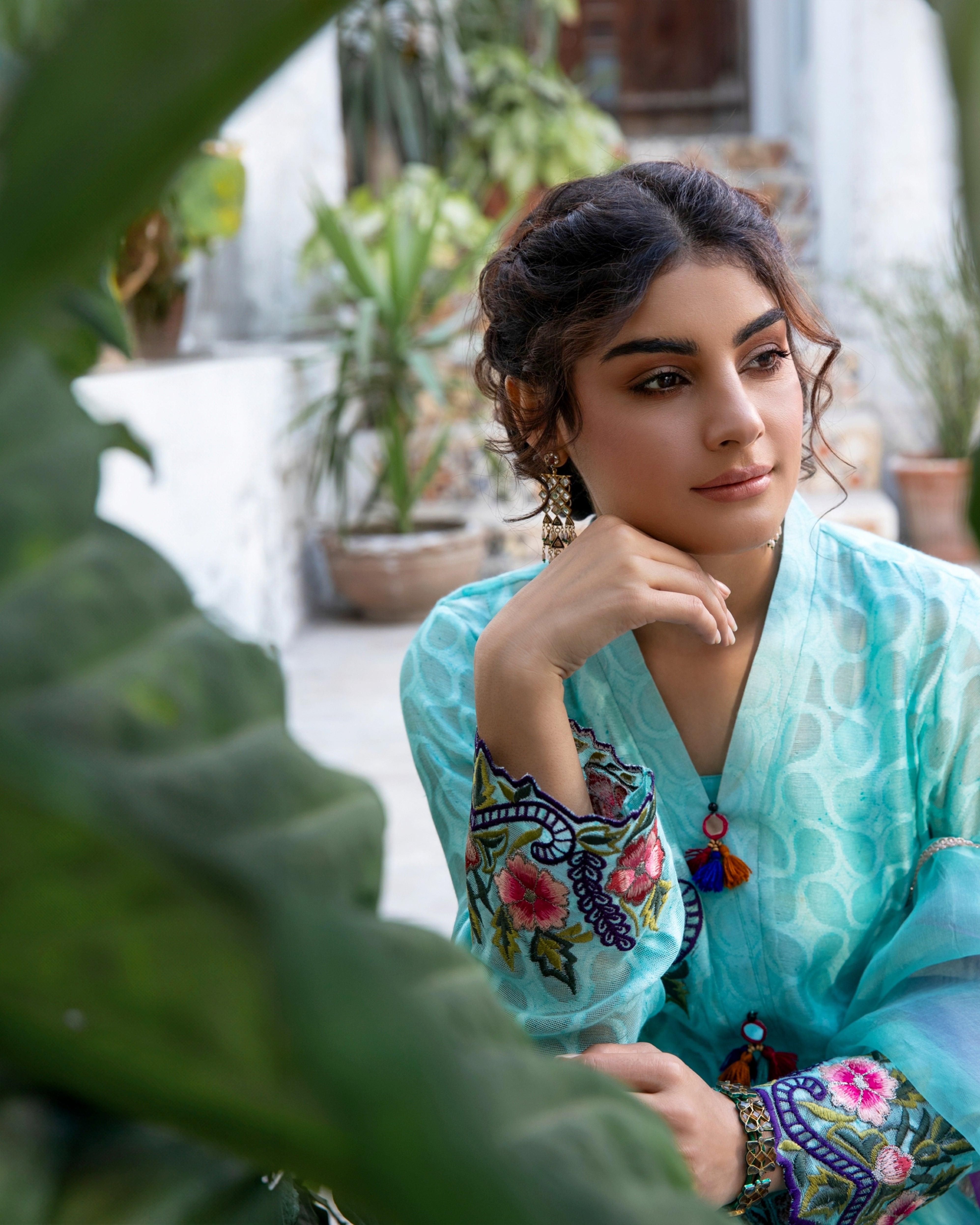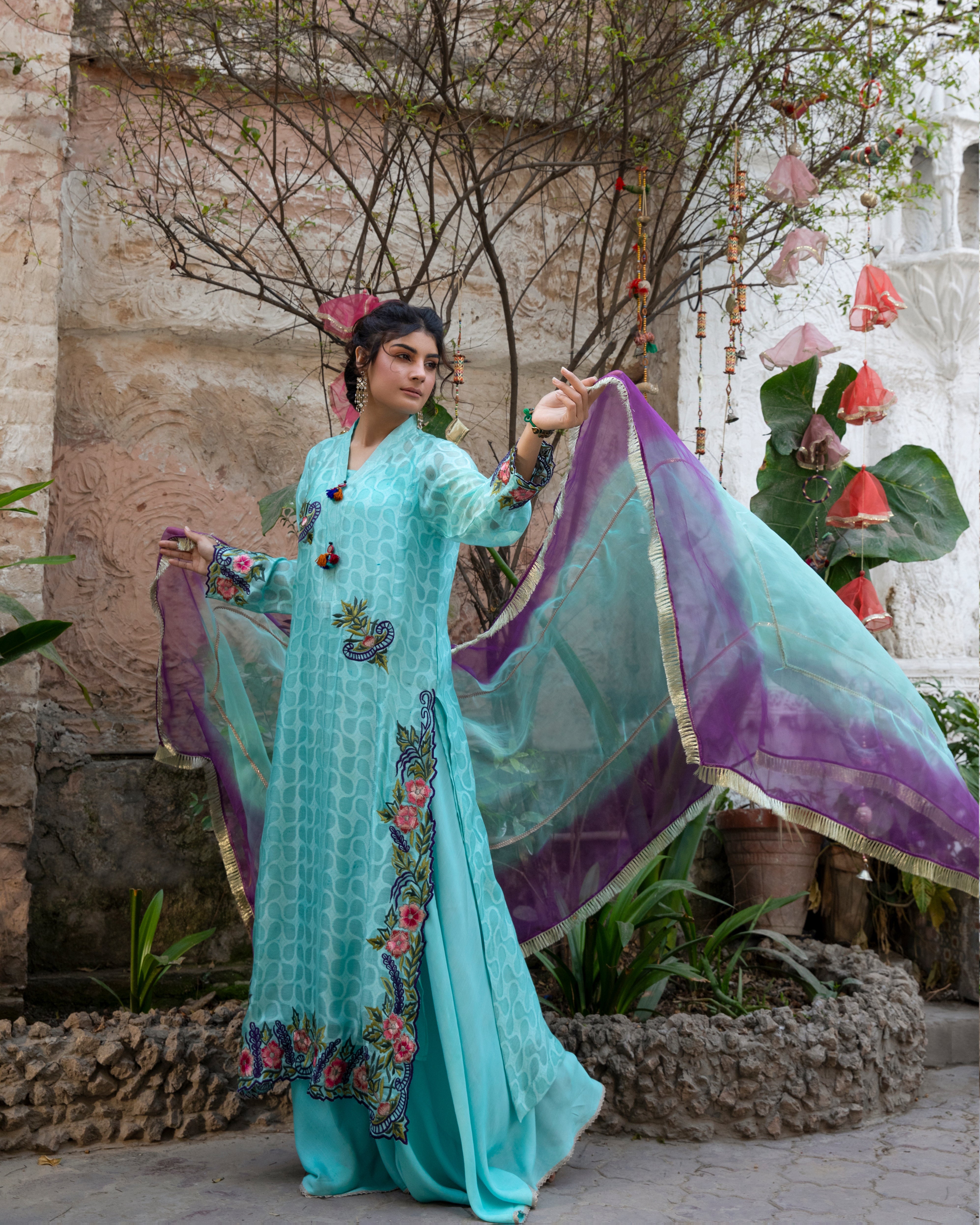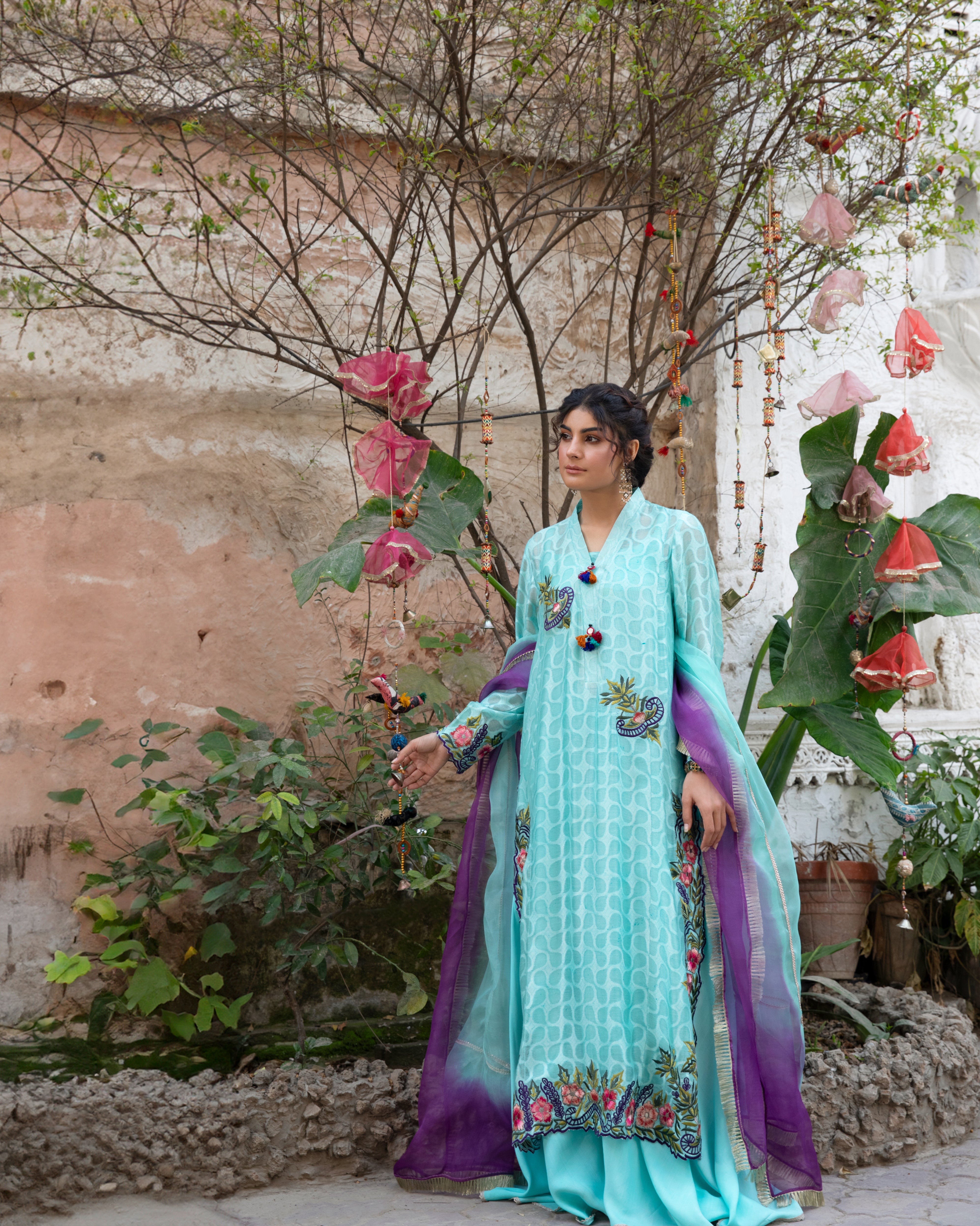 This turquoise ensemble features a self-patterned pure cotton net shirt, intricately embroidered with a palette of colors, enhancing its beauty with sharara.The dupatta, crafted from organza, is thoughtfully shaded to complement the outfit, achieving a harmonious balance. This attire is an excellent choice for Eid and can be gracefully worn at various events.