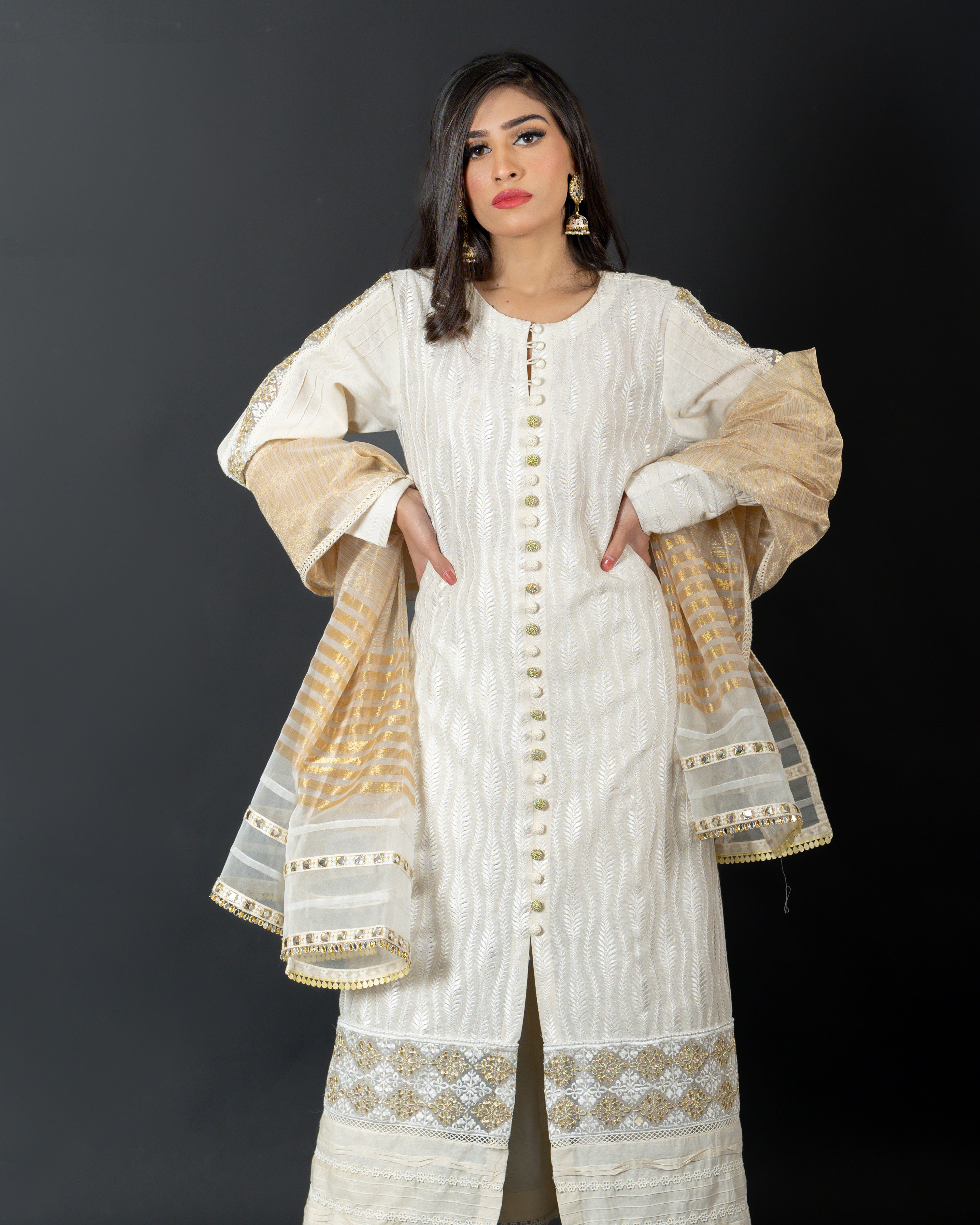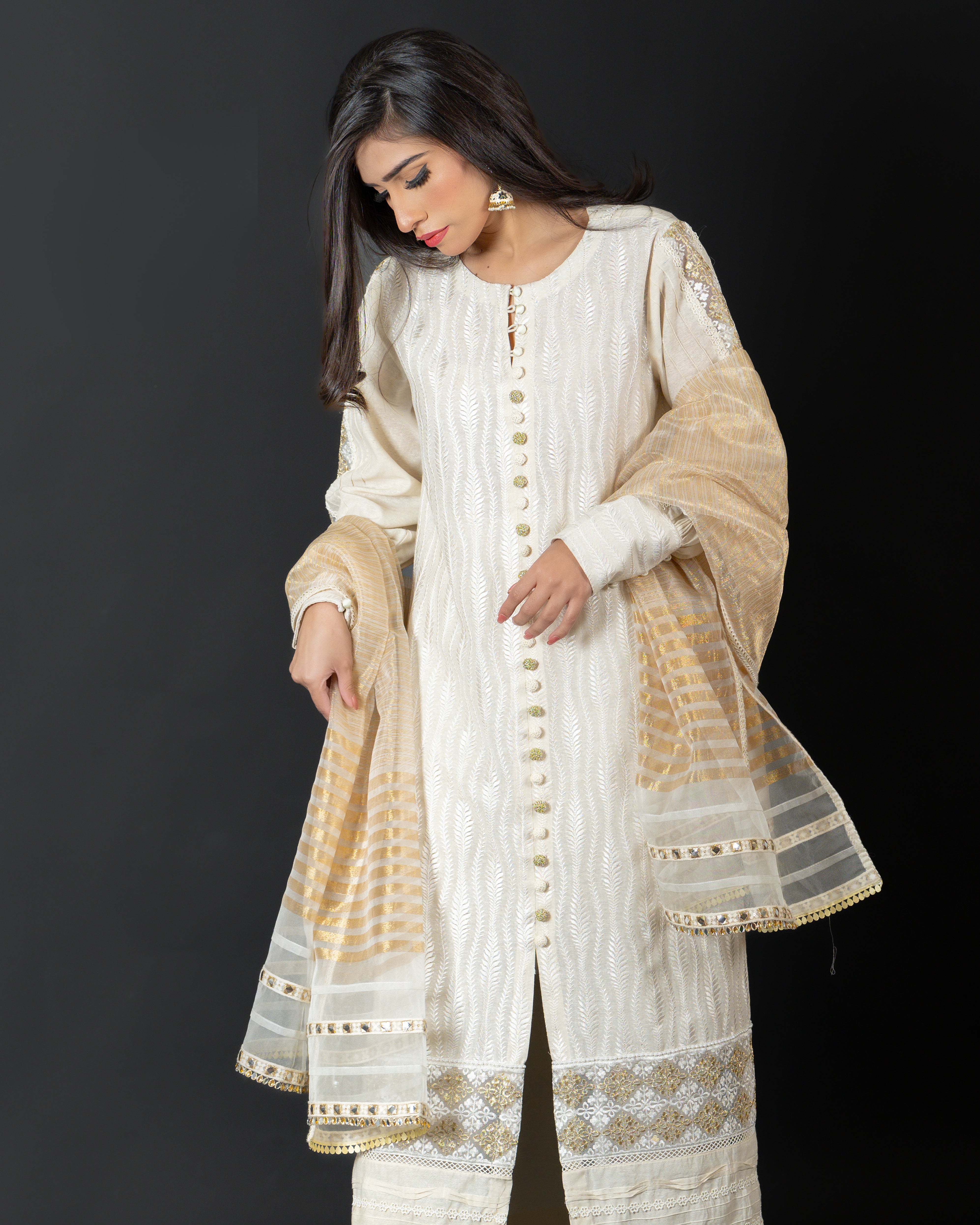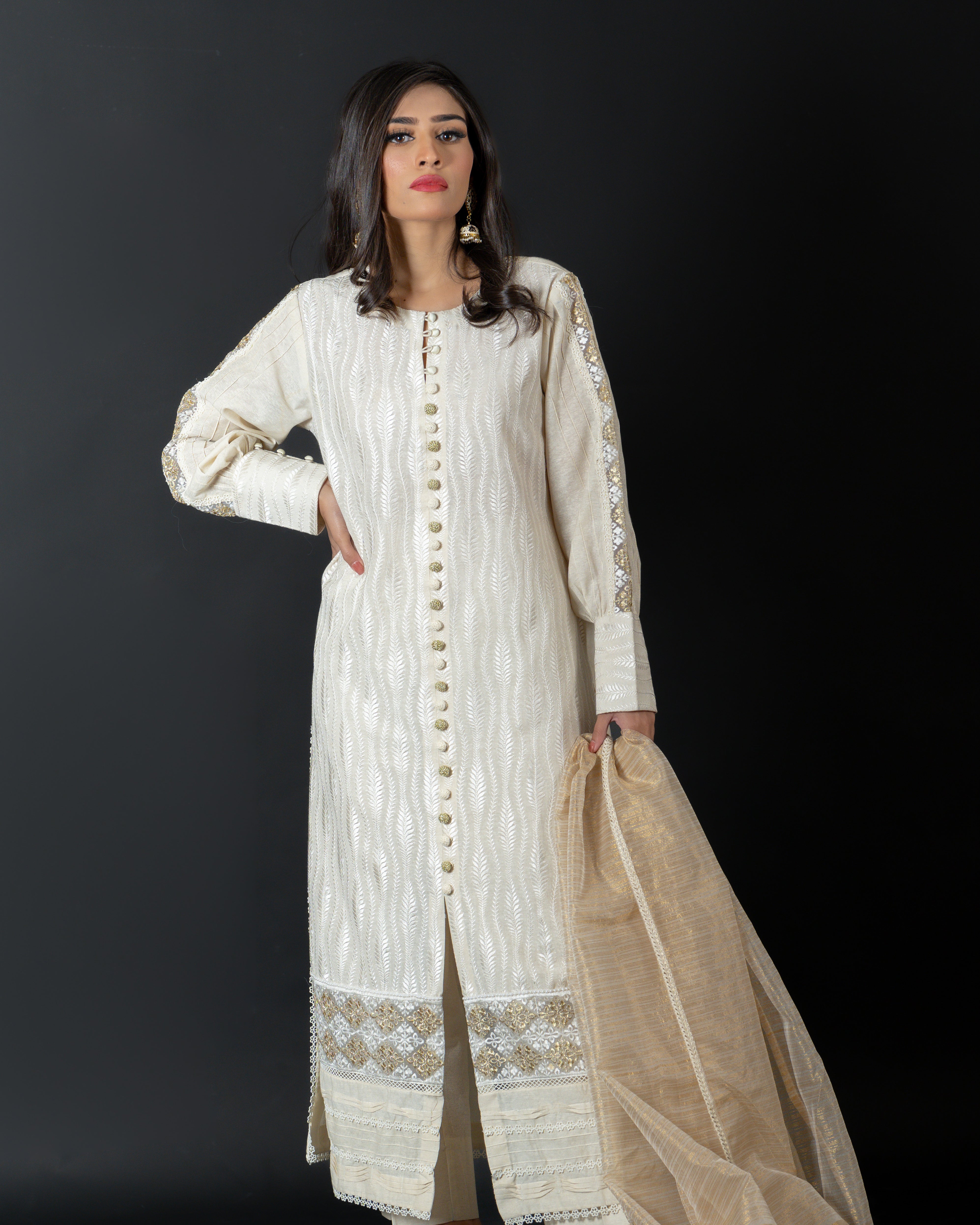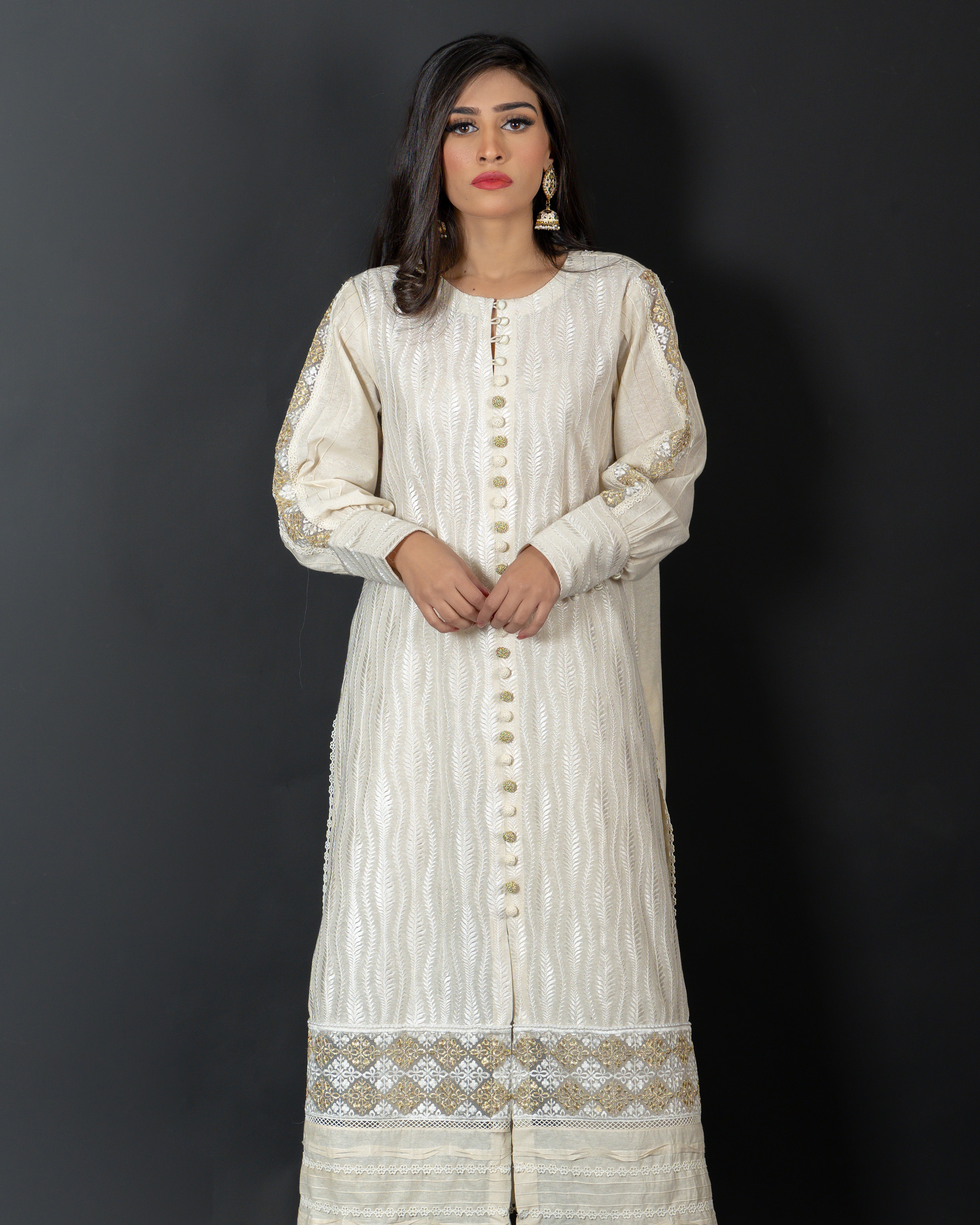 Discover effortless elegance with our off-white embroidered karandi open shirt, beautifully detailed with lace accents and ivory buttons. Perfect for layering or wearing solo, this versatile piece adds a touch of sophistication to any outfit.