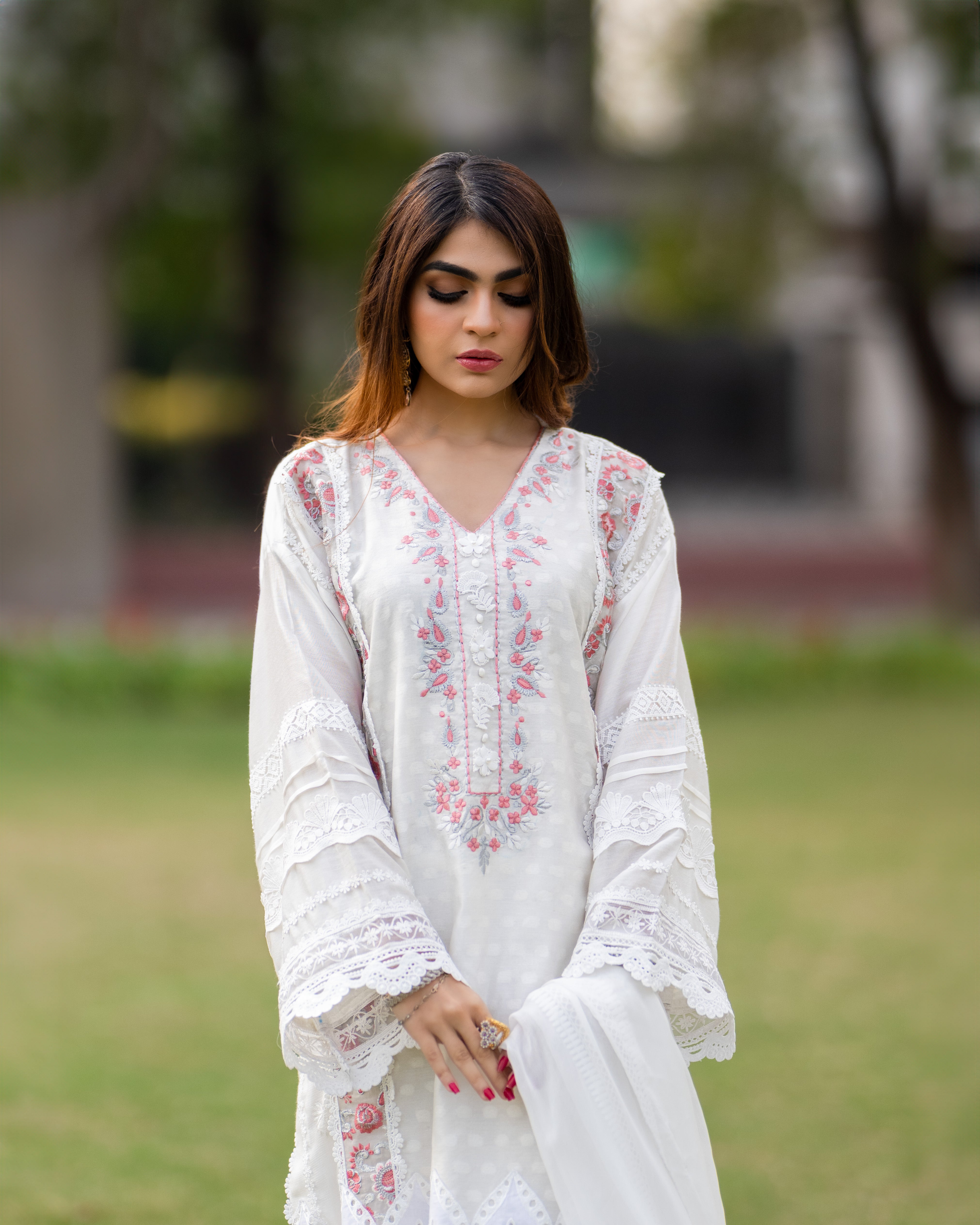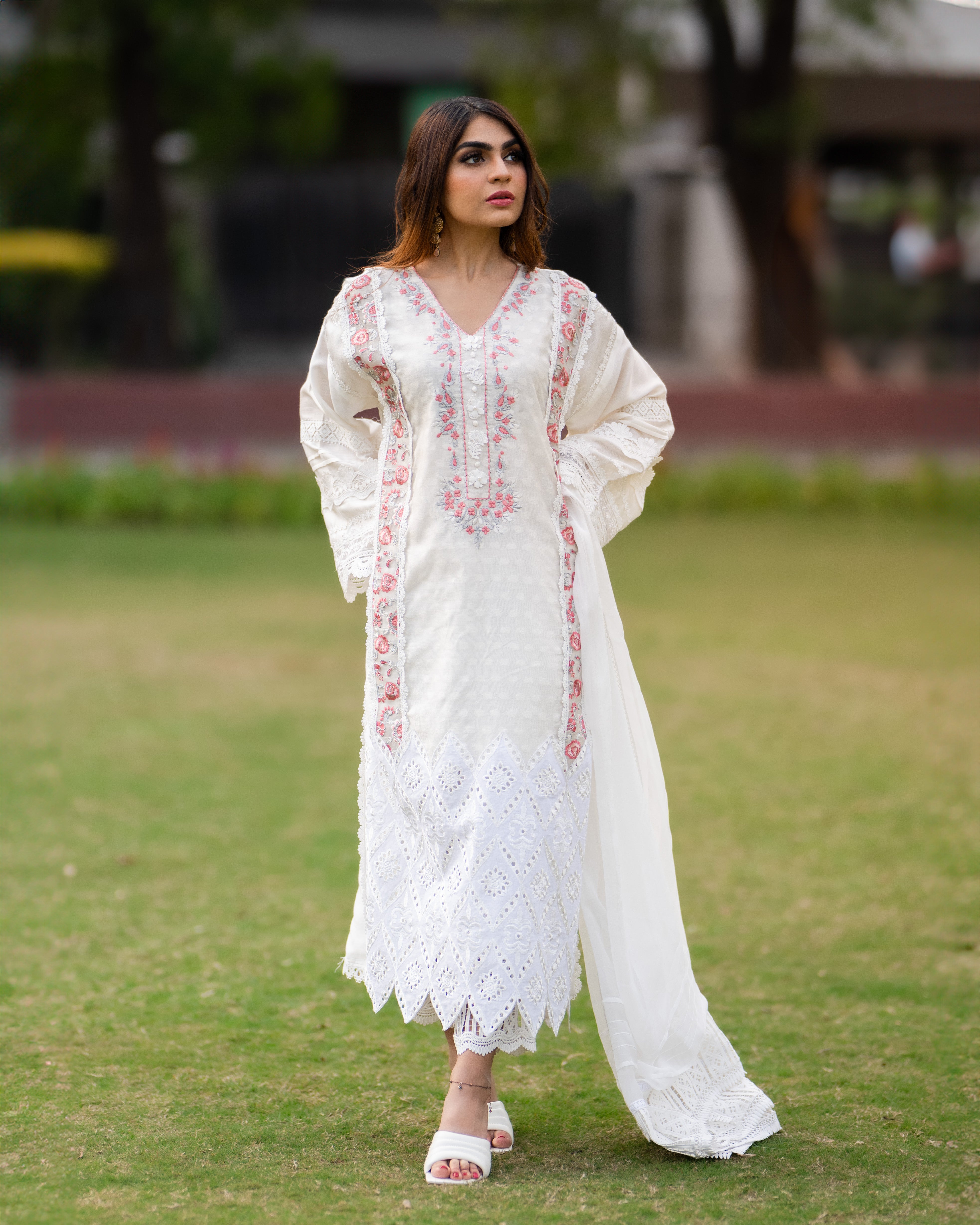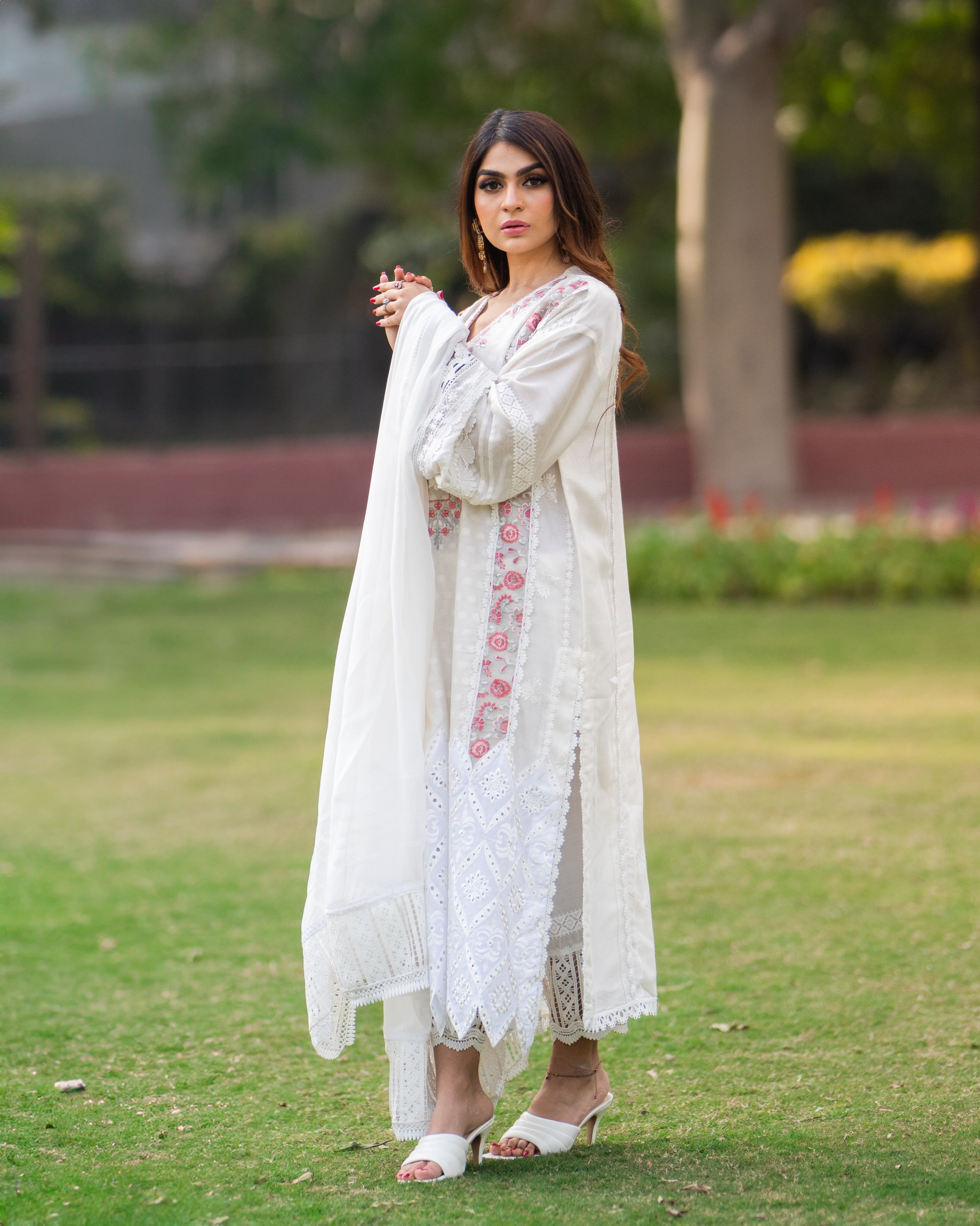 Embrace elegance with our white cotton silk shirt, featuring exquisite embroidered organza chikan and delicate lace details. The stunning pink embroidered neckline adds a perfect pop of color, making it a timeless piece for any occasion.