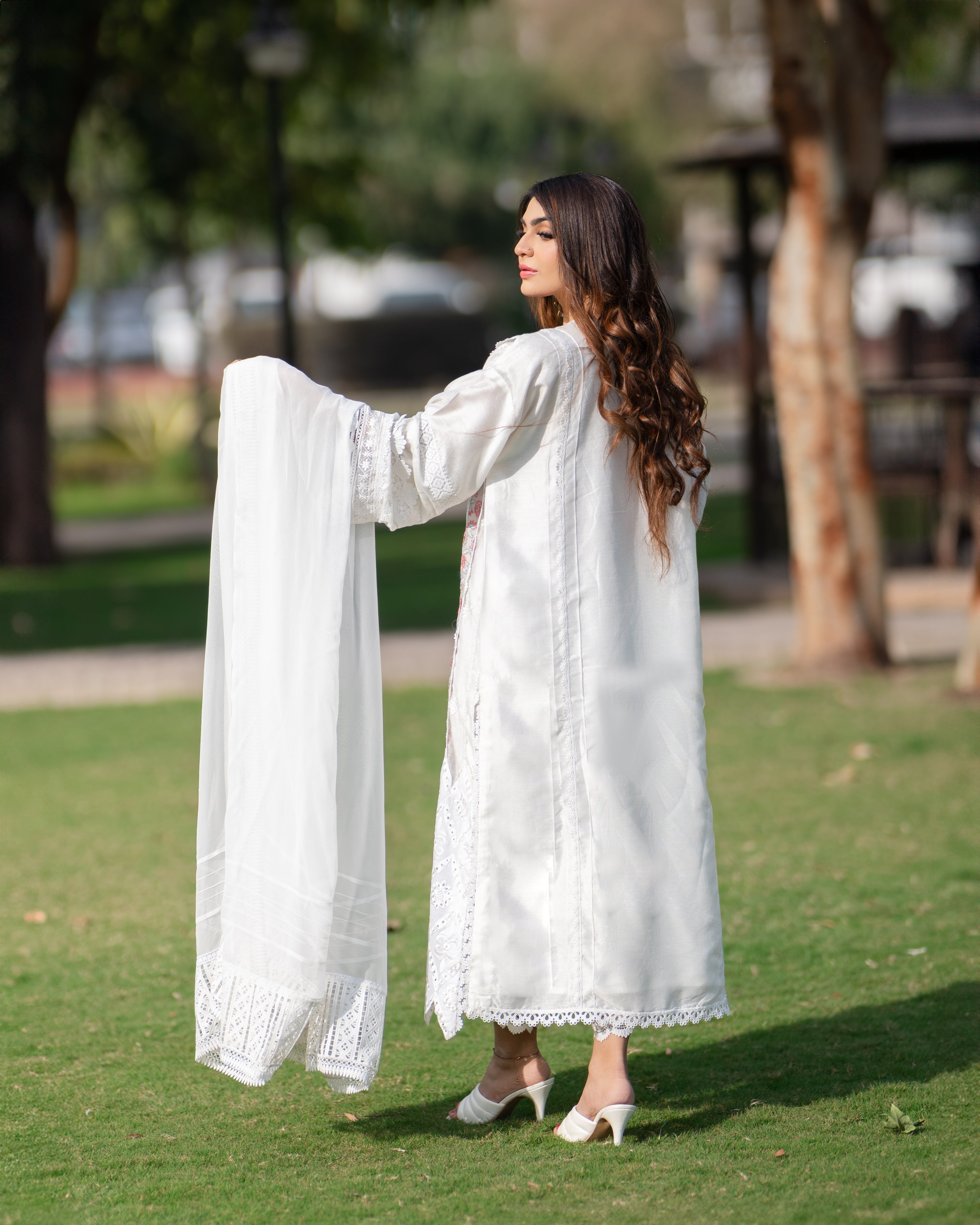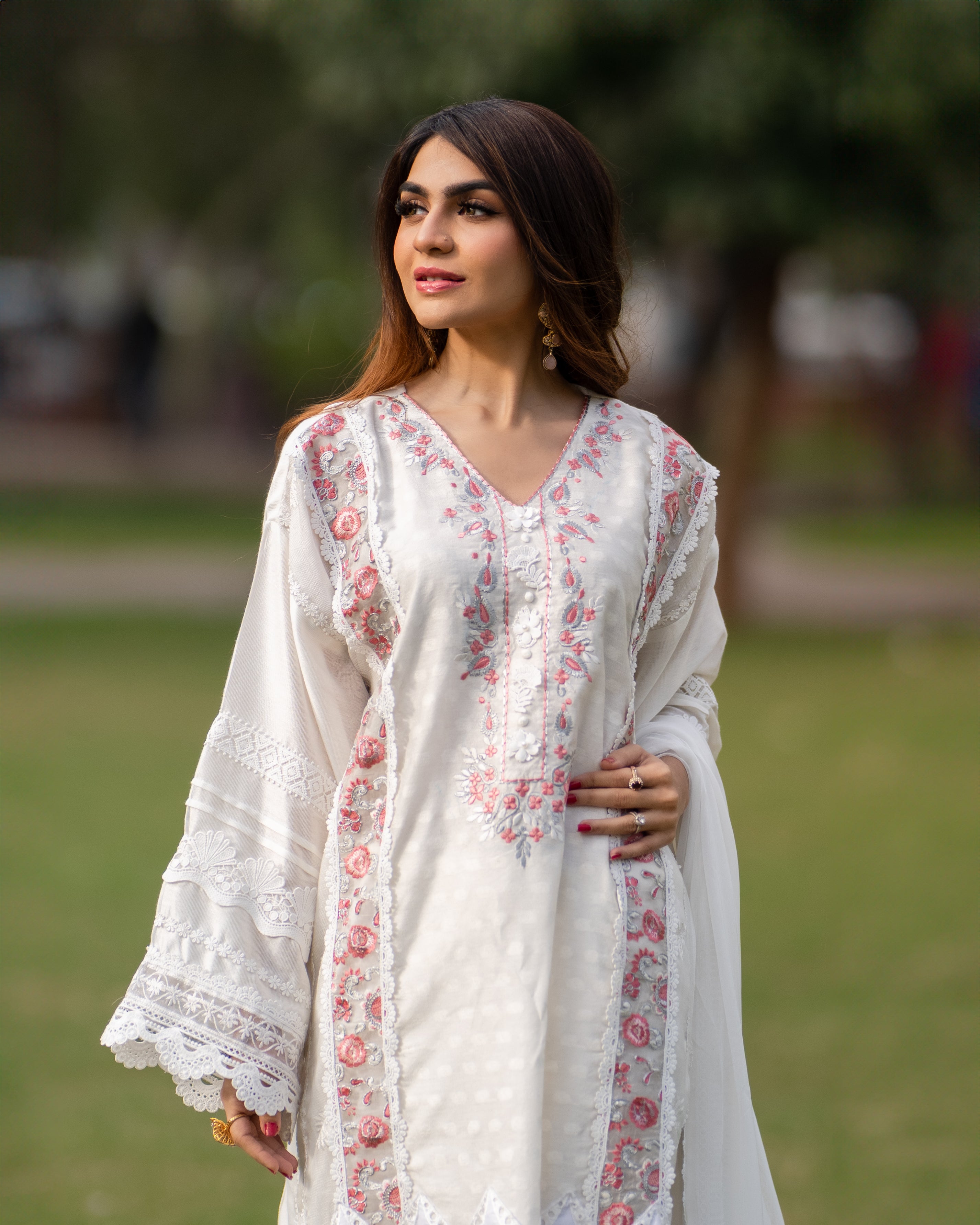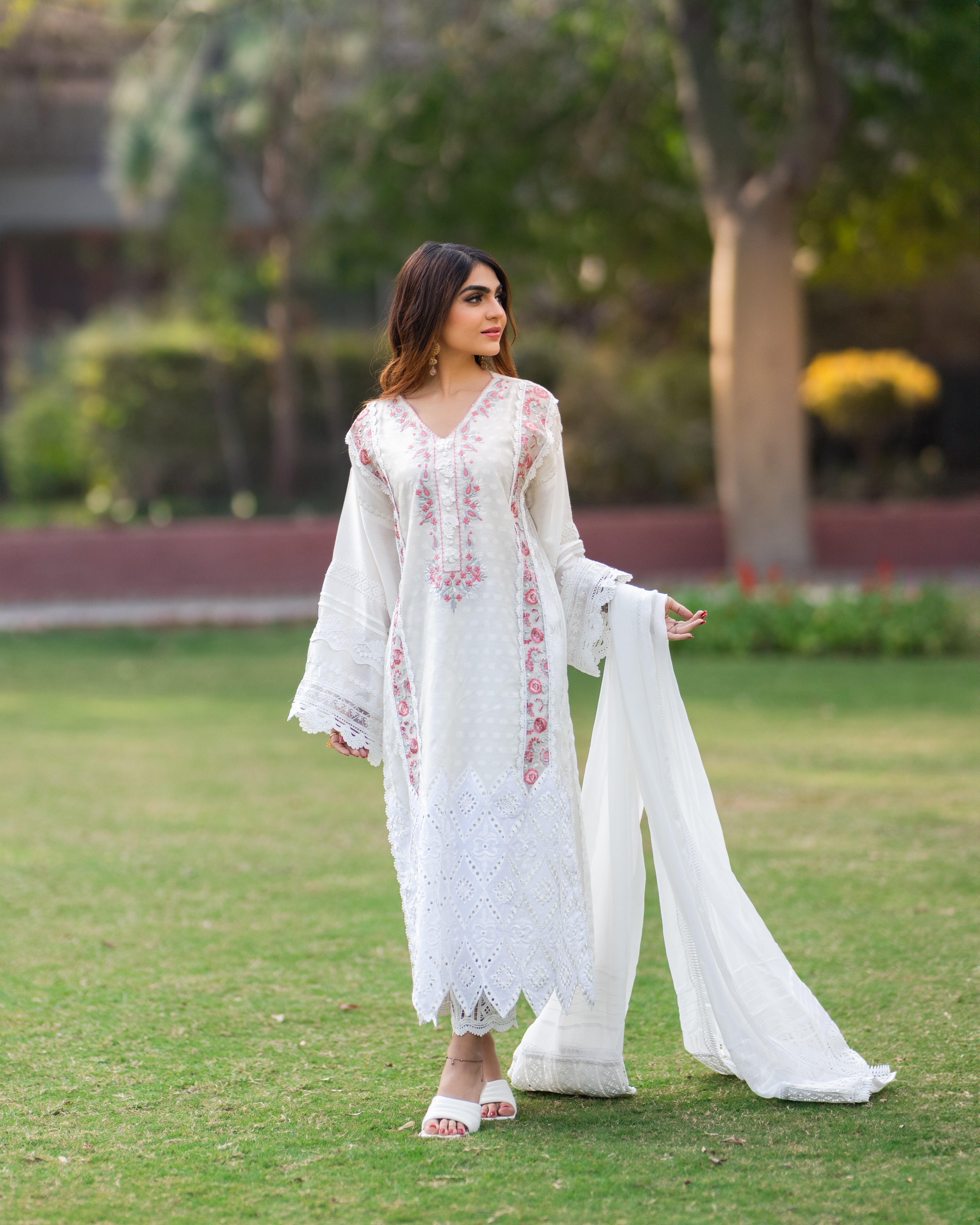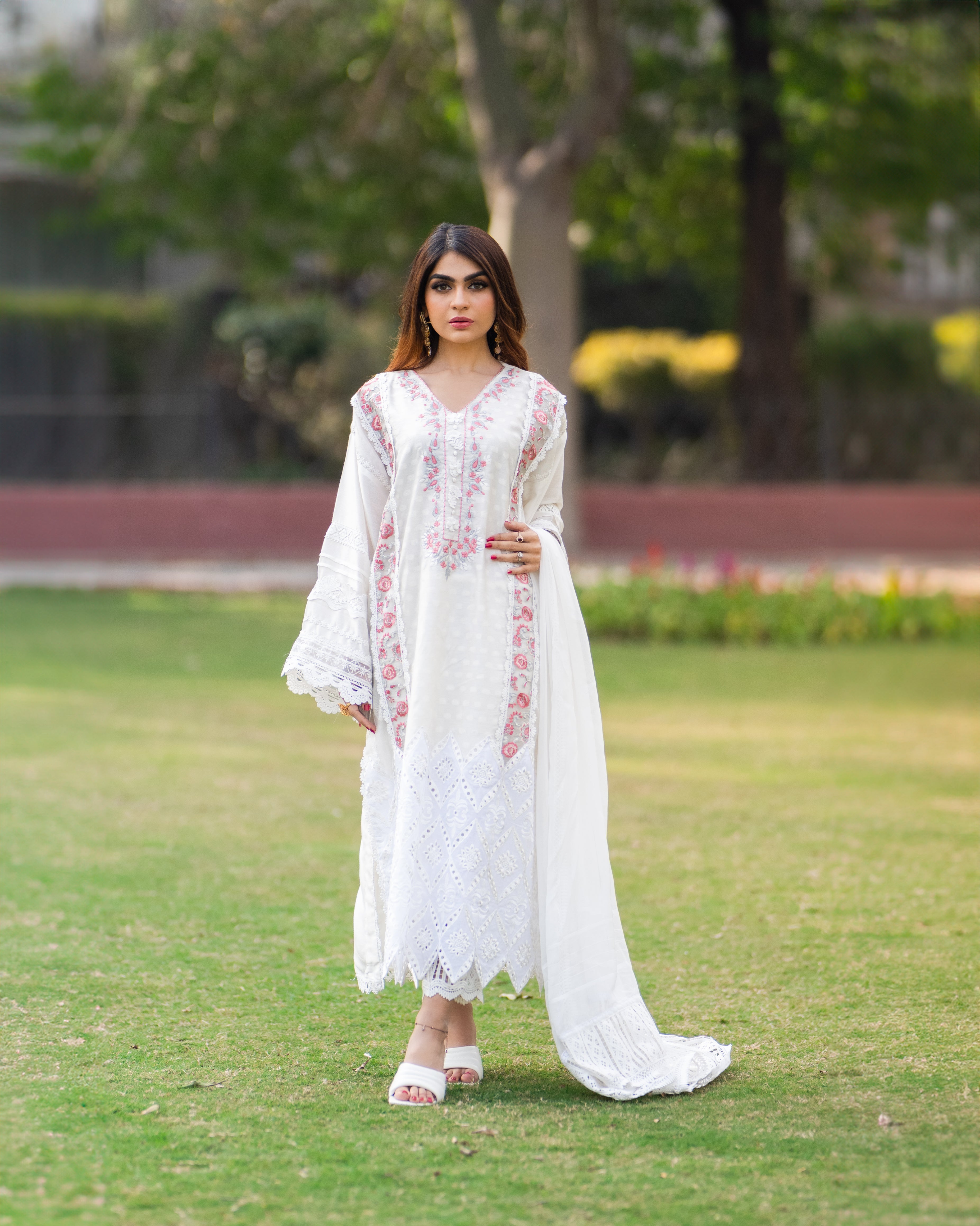 Embrace elegance with our white cotton silk shirt, featuring exquisite embroidered organza chikan and delicate lace details. The stunning pink embroidered neckline adds a perfect pop of color, making it a timeless piece for any occasion.