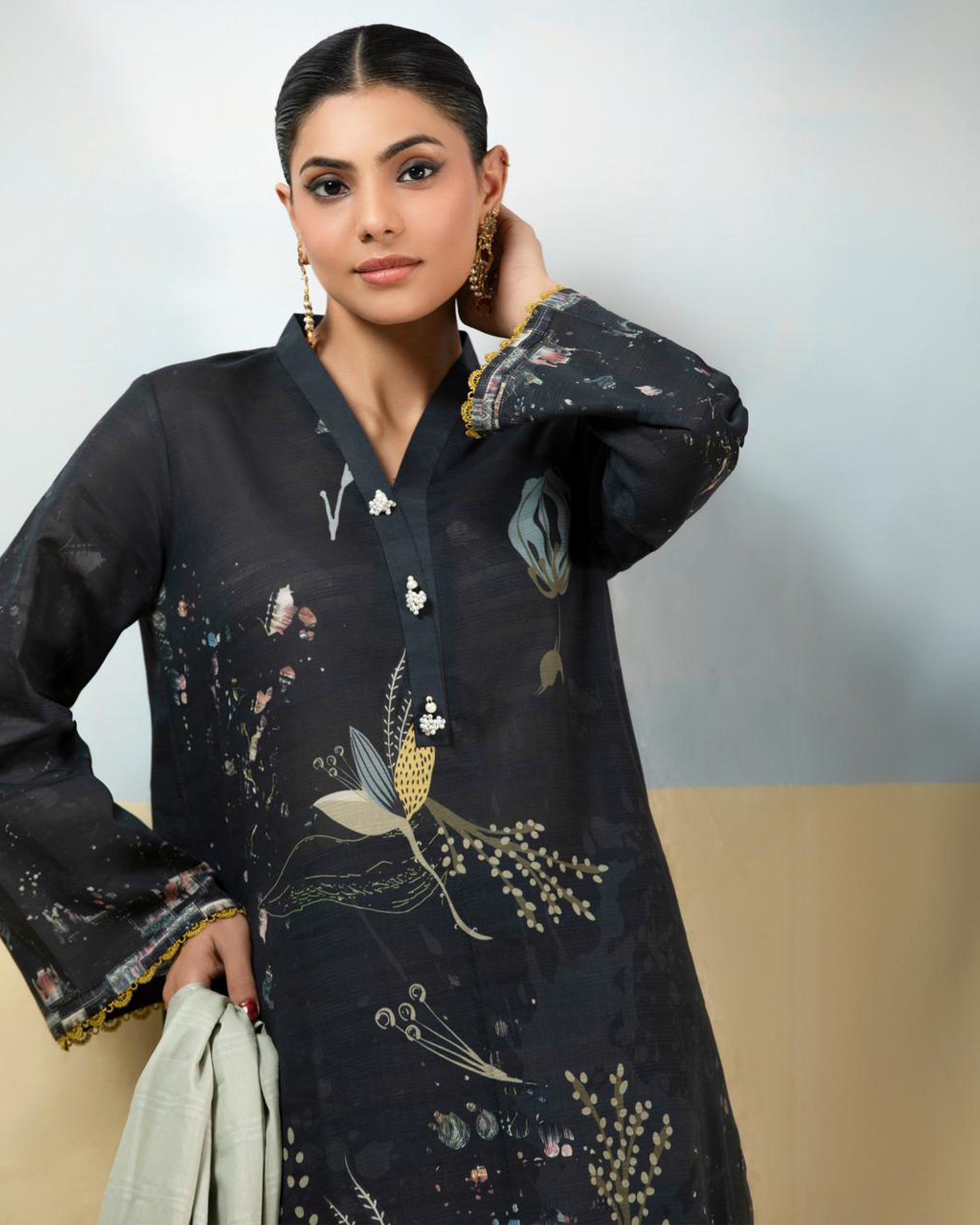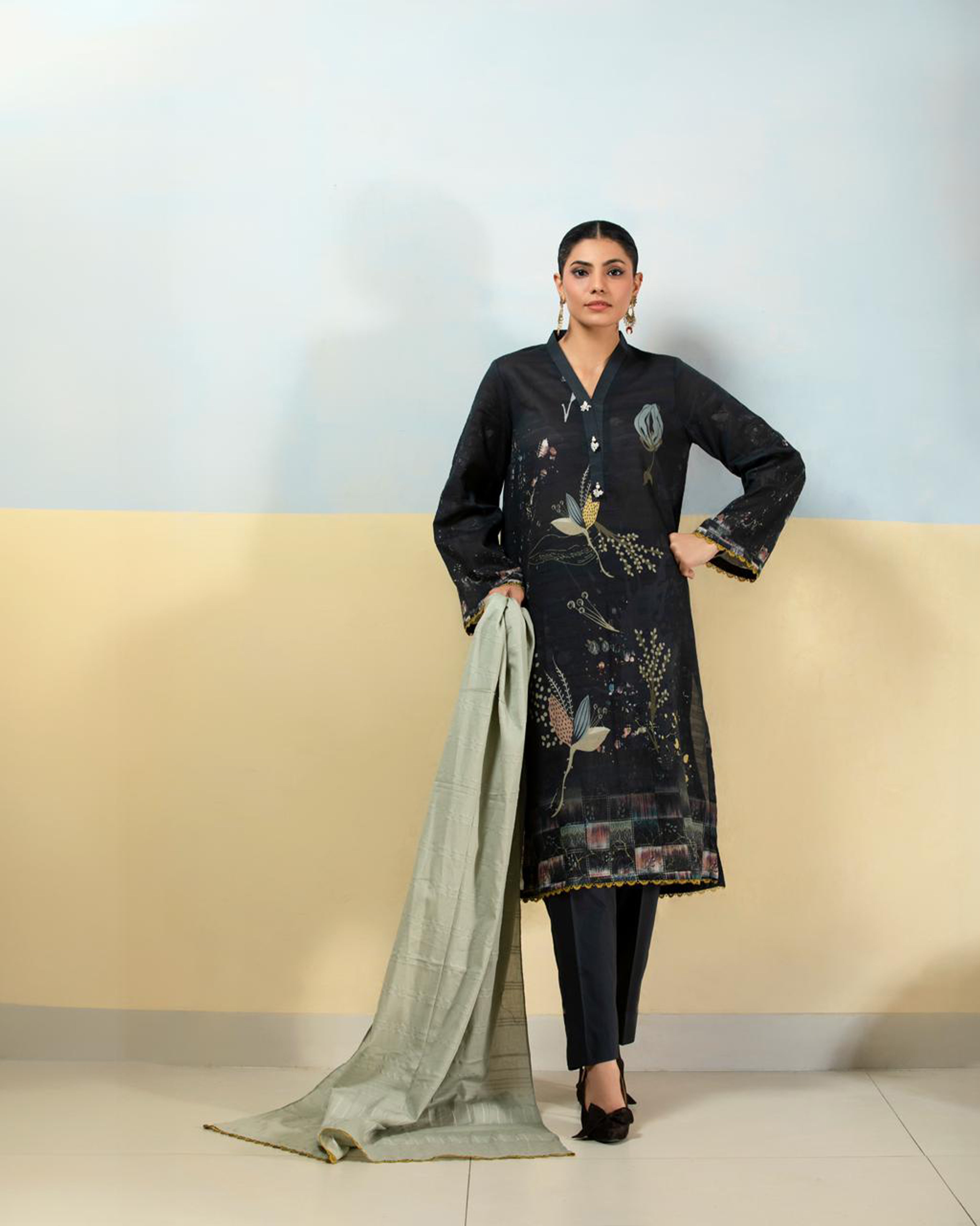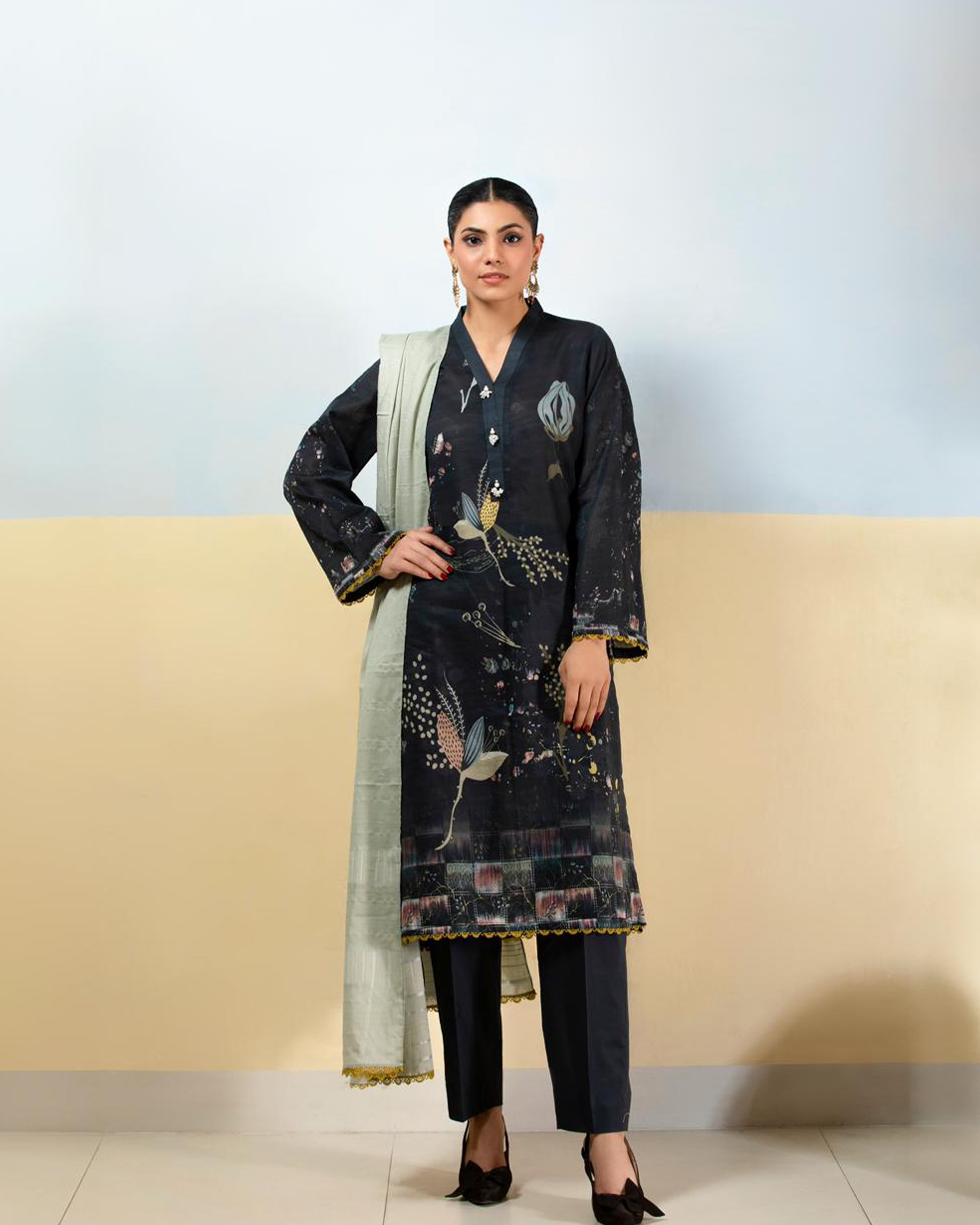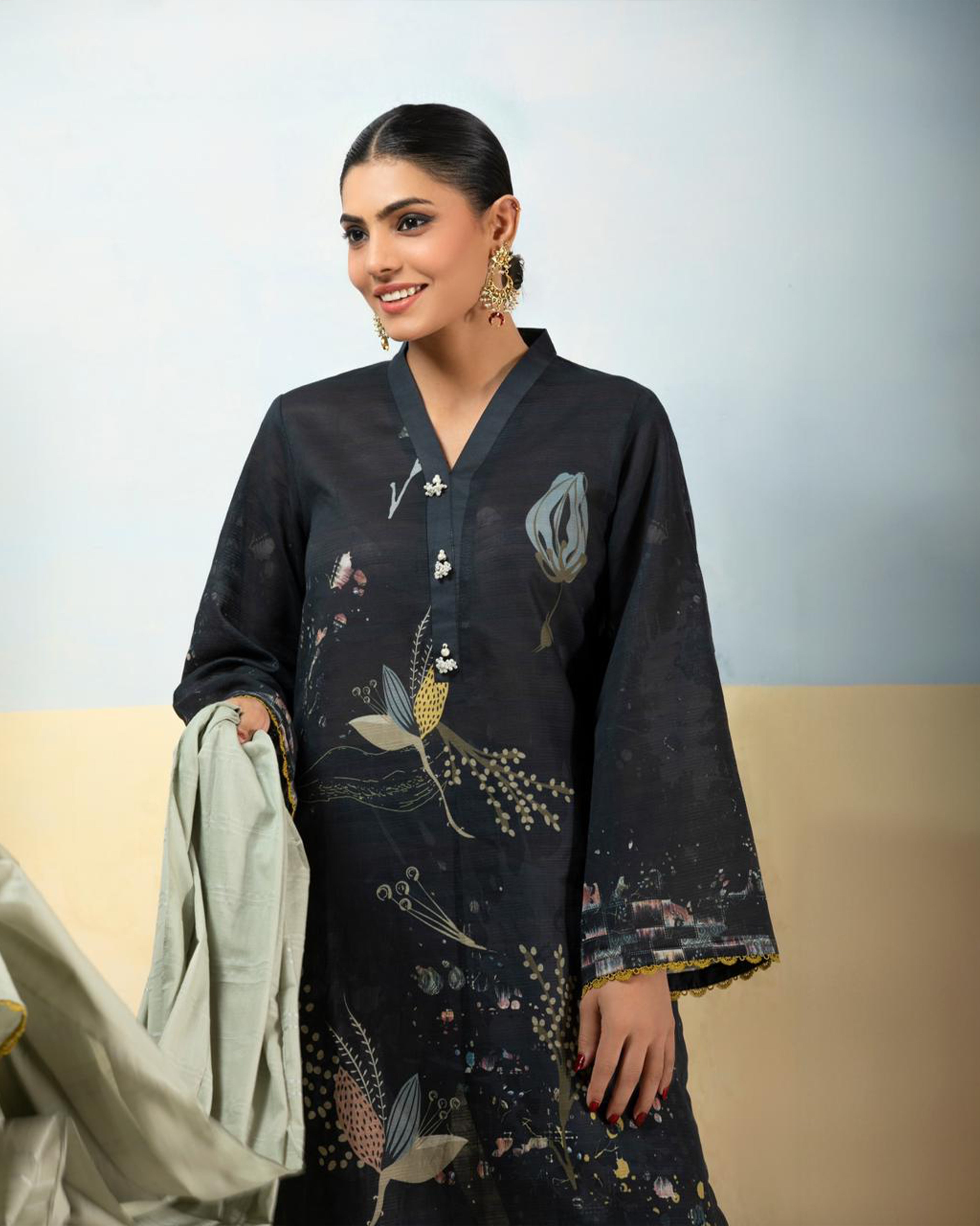 Elevate your presence with Zeyno, a timeless ensemble crafted from luxurious Lawn in a striking black hue adorned with delicate prints. This stitched beauty features an artful touch of lace detailing at the center of the neckline — adding an element of refined charm and subtle drama. The richness of raw silk brings structure and sophistication, making Zeyno your go-to choice for festive evenings or elegant day affairs.