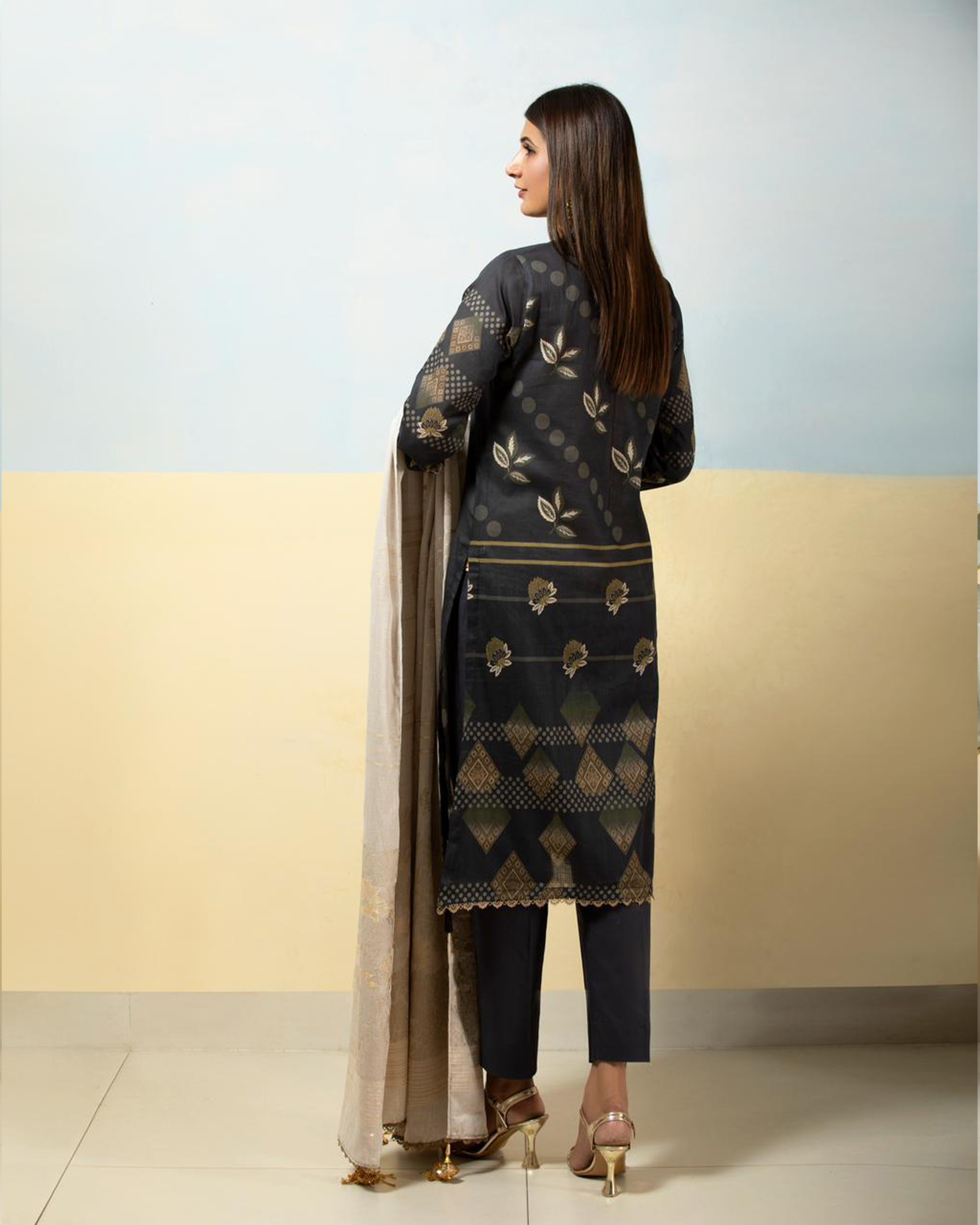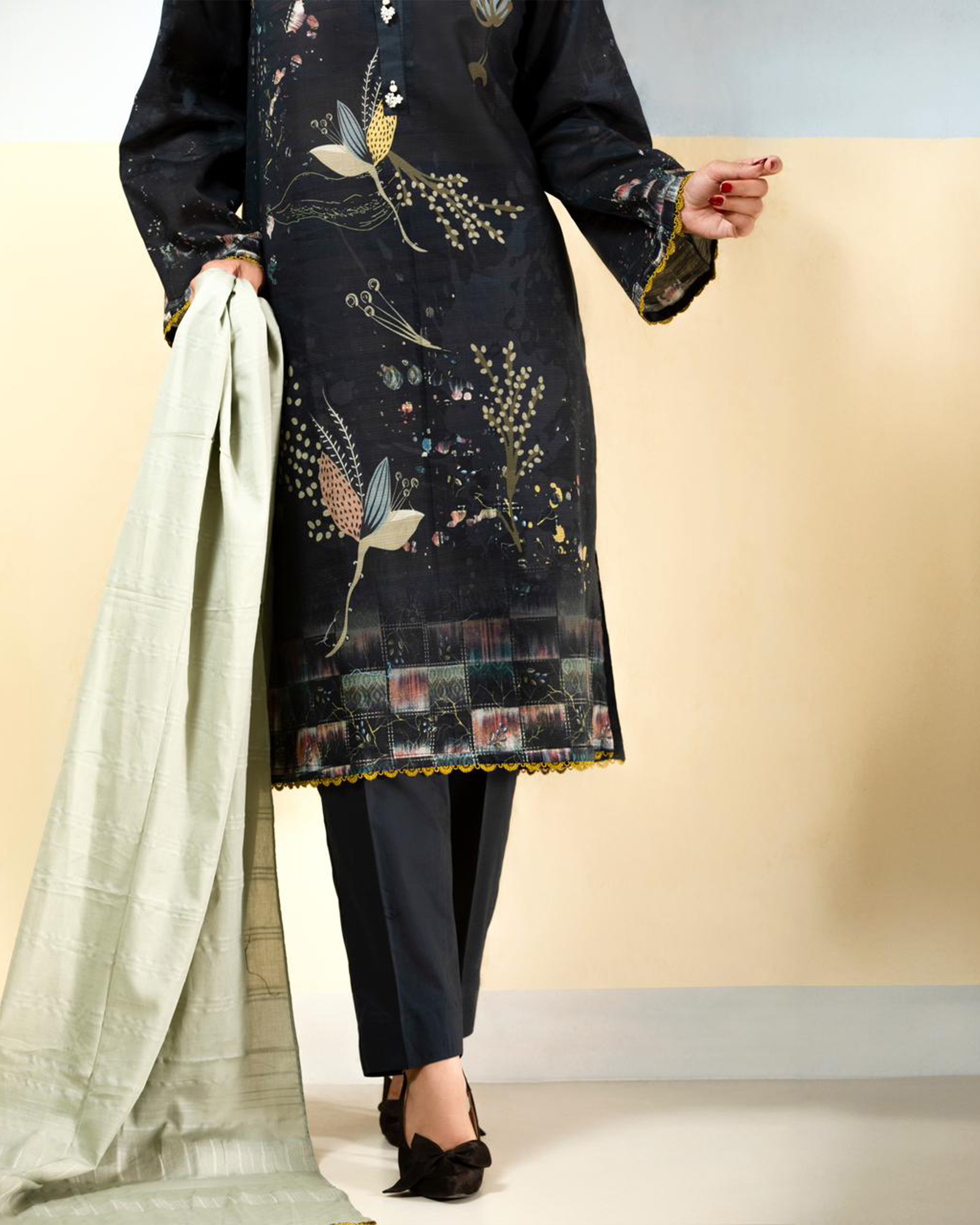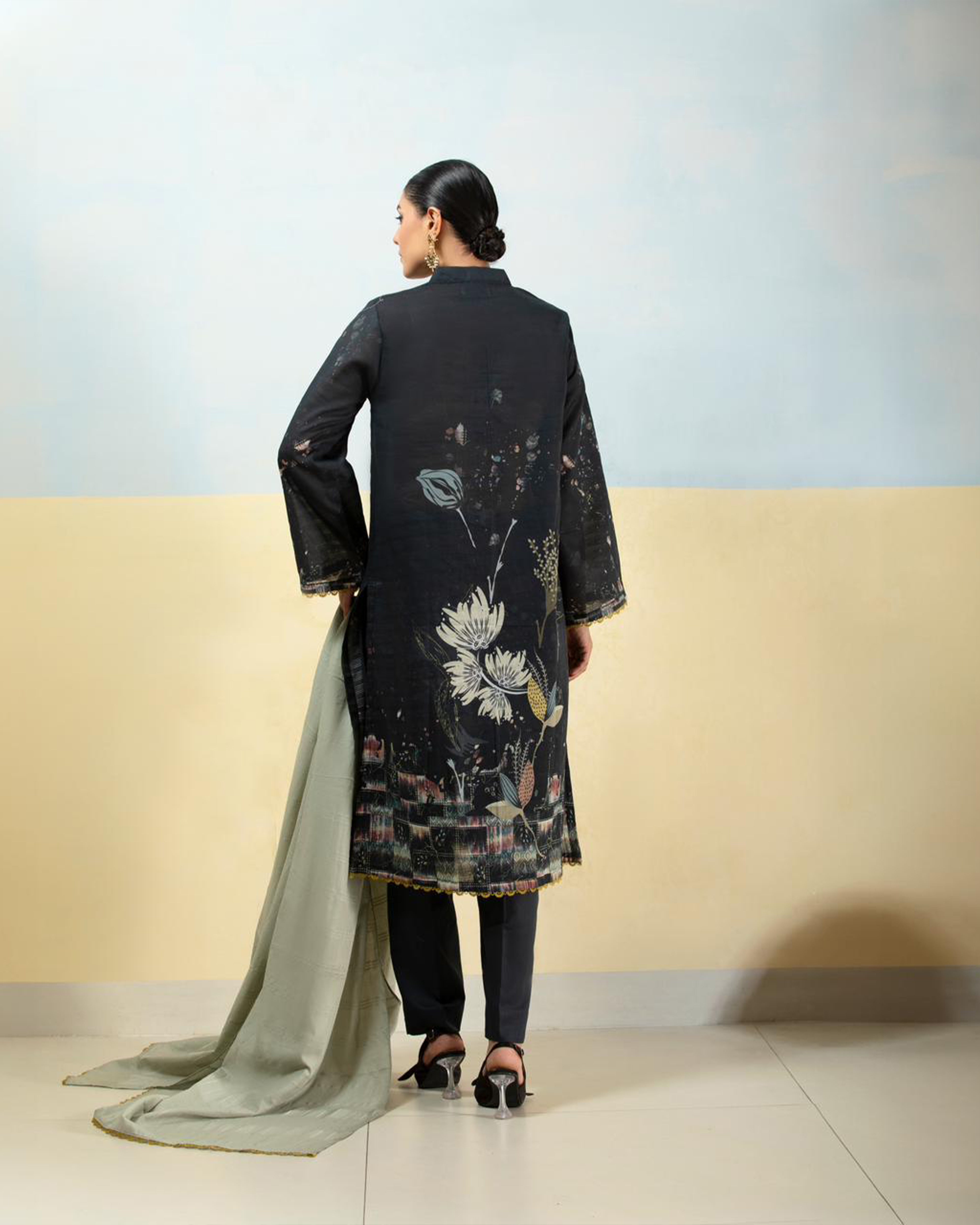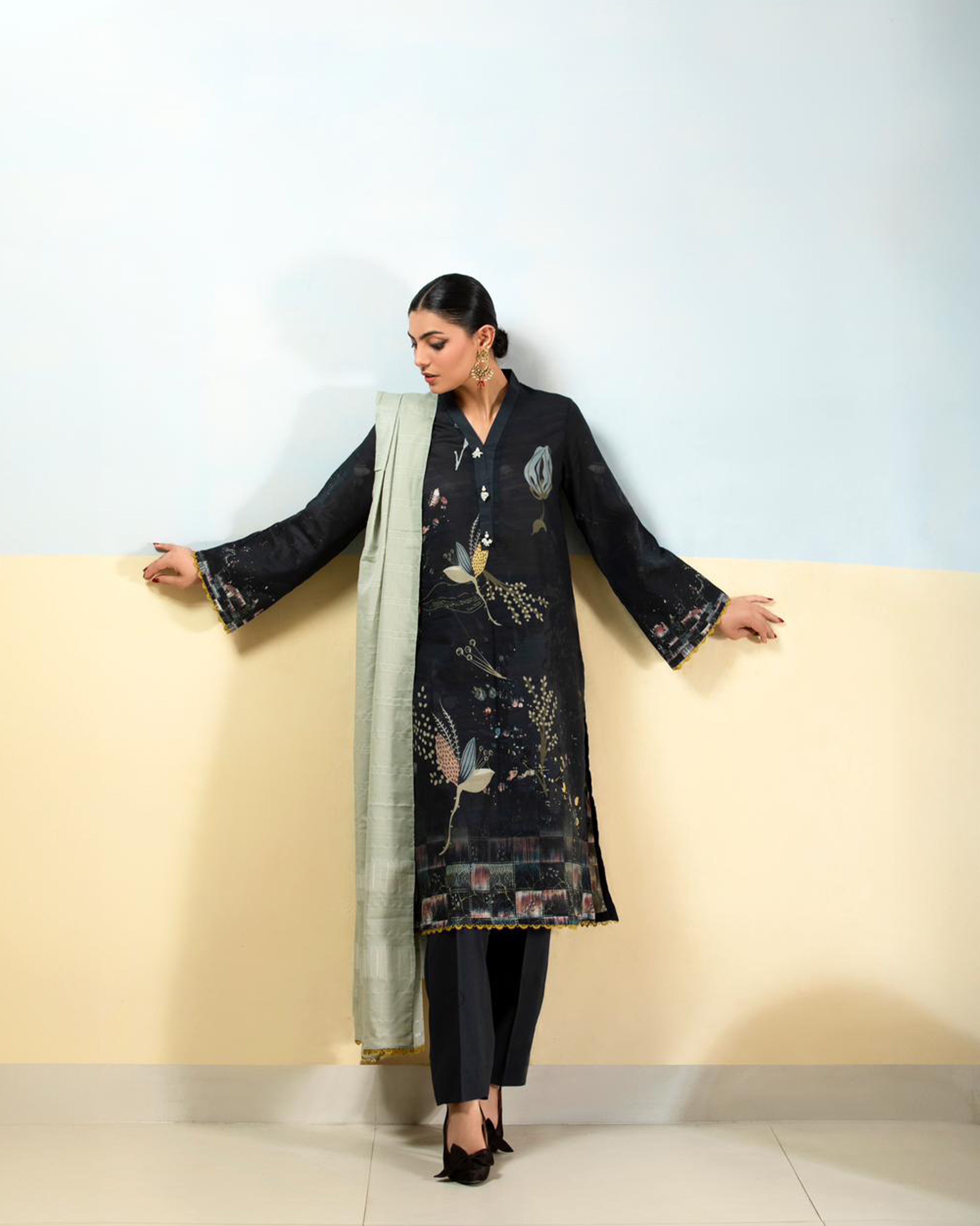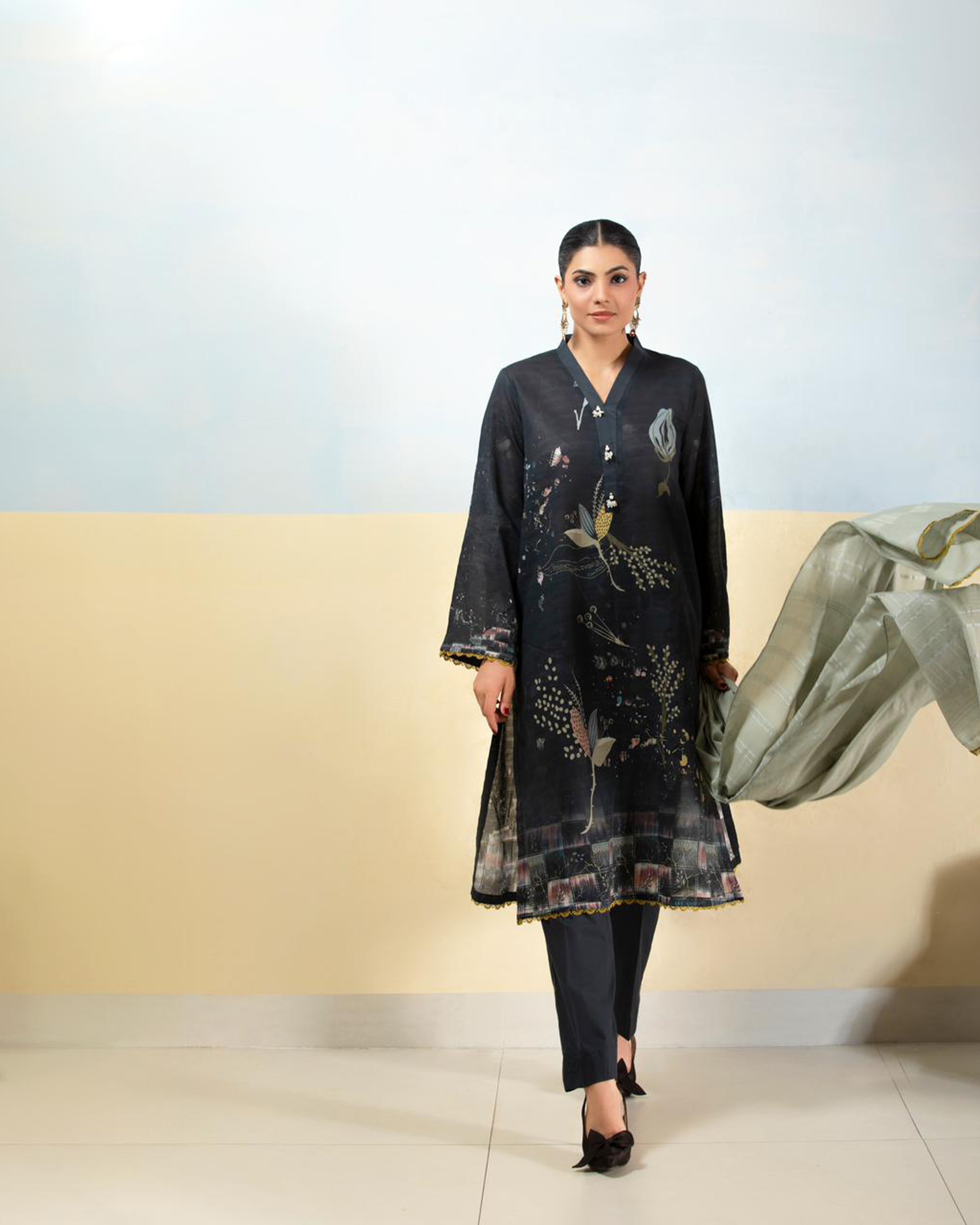 Elevate your presence with Zeyno, a timeless ensemble crafted from luxurious Lawn in a striking black hue adorned with delicate prints. This stitched beauty features an artful touch of lace detailing at the center of the neckline — adding an element of refined charm and subtle drama. The richness of raw silk brings structure and sophistication, making Zeyno your go-to choice for festive evenings or elegant day affairs.
